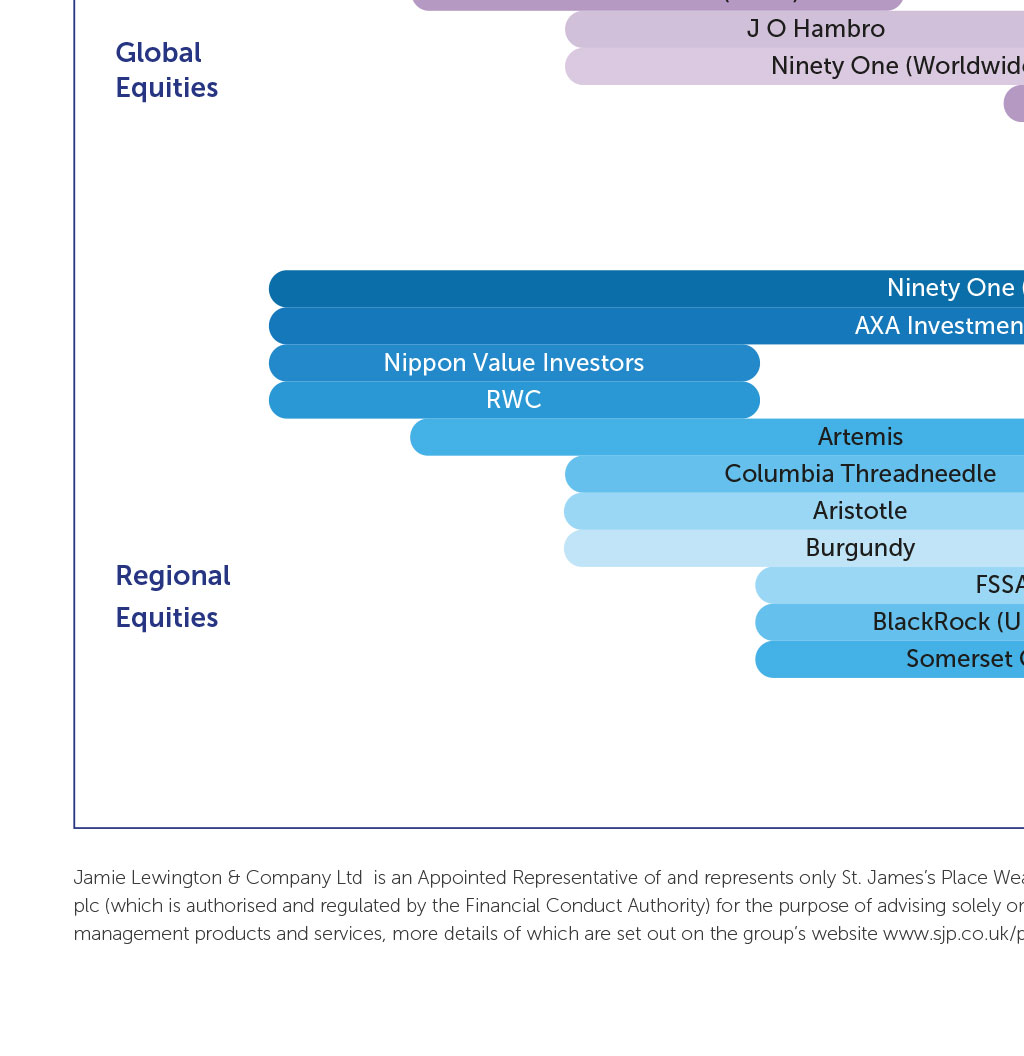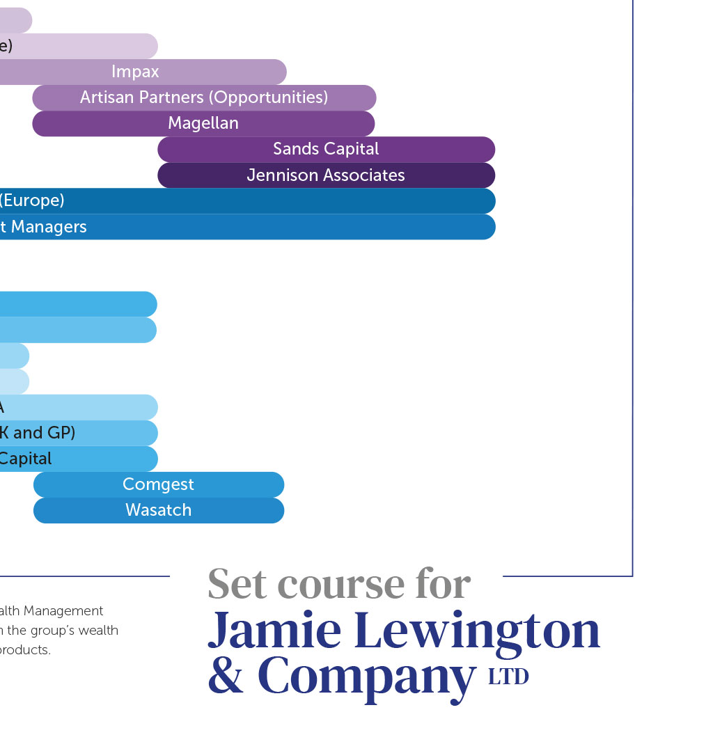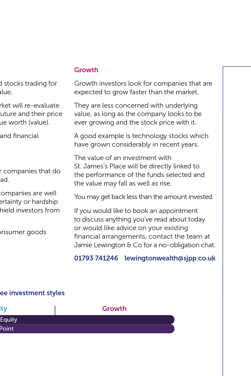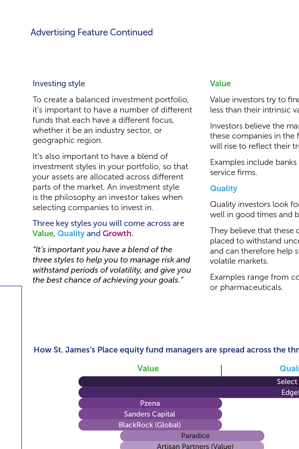 Advertising Feature Continued Investing style Value Growth To create a balanced investment portfolio, its important to have a number of different funds that each have a different focus, whether it be an industry sector, or geographic region. Value investors try to find stocks trading for less than their intrinsic value. Growth investors look for companies that are expected to grow faster than the market. Investors believe the market will re-evaluate these companies in the future and their price will rise to reflect their true worth (value). They are less concerned with underlying value, as long as the company looks to be ever growing and the stock price with it. Examples include banks and financial service firms. A good example is technology stocks which have grown considerably in recent years. Quality The value of an investment with St. Jamess Place will be directly linked to the performance of the funds selected and the value may fall as well as rise. Its also important to have a blend of investment styles in your portfolio, so that your assets are allocated across different parts of the market. An investment style is the philosophy an investor takes when selecting companies to invest in. Three key styles you will come across are Value, Quality and Growth. Its important you have a blend of the three styles to help you to manage risk and withstand periods of volatility, and give you the best chance of achieving your goals. Quality investors look for companies that do well in good times and bad. They believe that these companies are well placed to withstand uncertainty or hardship and can therefore help shield investors from volatile markets. Examples range from consumer goods or pharmaceuticals. You may get back less than the amount invested. If you would like to book an appointment to discuss anything youve read about today or would like advice on your existing financial arrangements, contact the team at Jamie Lewington & Co for a no-obligation chat. 01793 741246 lewingtonwealth@sjpp.co.uk How St. Jamess Place equity fund managers are spread across the three investment styles Value Quality Growth Select Equity EdgePoint Pzena Sanders Capital BlackRock (Global) Paradice Artisan Partners (Value) J O Hambro Global Equities Ninety One (Worldwide) Impax Artisan Partners (Opportunities) Magellan Sands Capital Jennison Associates Ninety One (Europe) AXA Investment Managers Nippon Value Investors RWC Artemis Columbia Threadneedle Aristotle Regional Equities Burgundy FSSA BlackRock (UK and GP) Somerset Capital Comgest Wasatch Jamie Lewington & Company Ltd is an Appointed Representative of and represents only St. Jamess Place Wealth Management plc (which is authorised and regulated by the Financial Conduct Authority) for the purpose of advising solely on the groups wealth management products and services, more details of which are set out on the groups website www.sjp.co.uk/products. Set course for Jamie Lewington & Company LTD