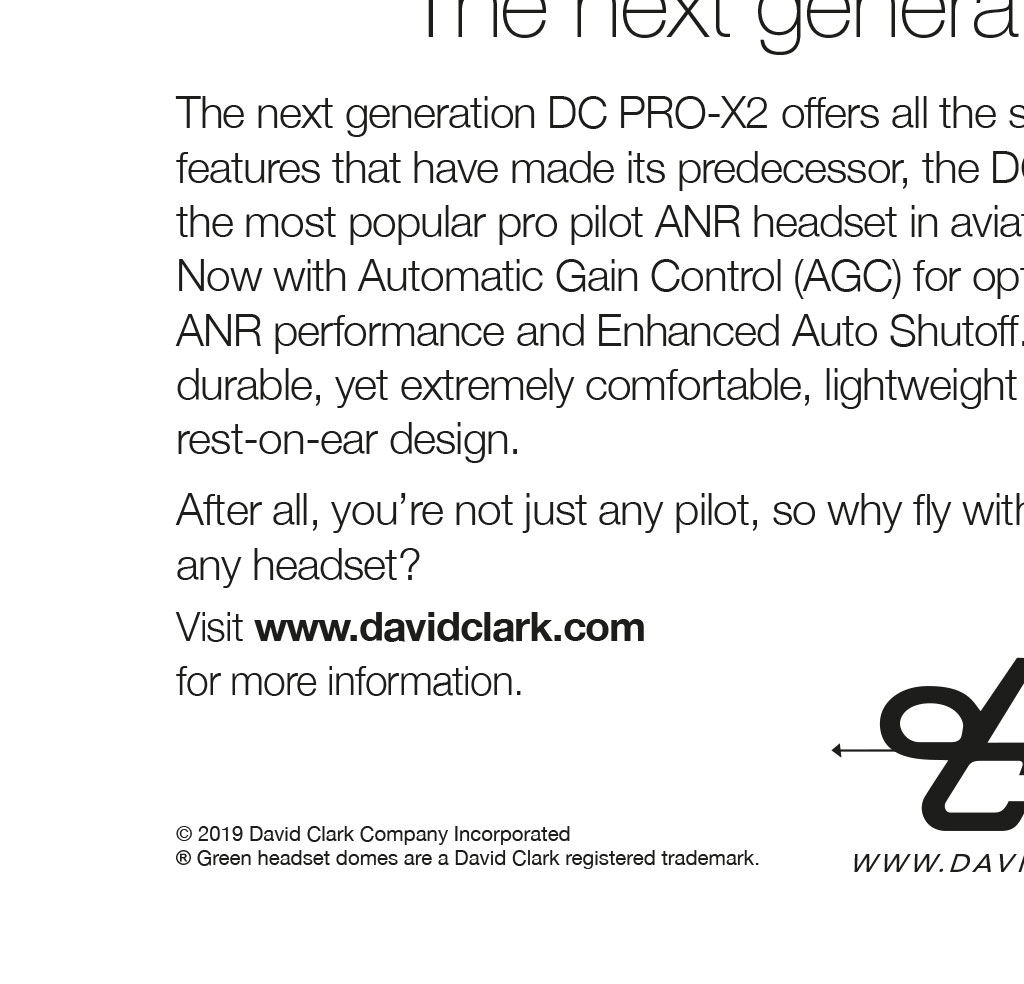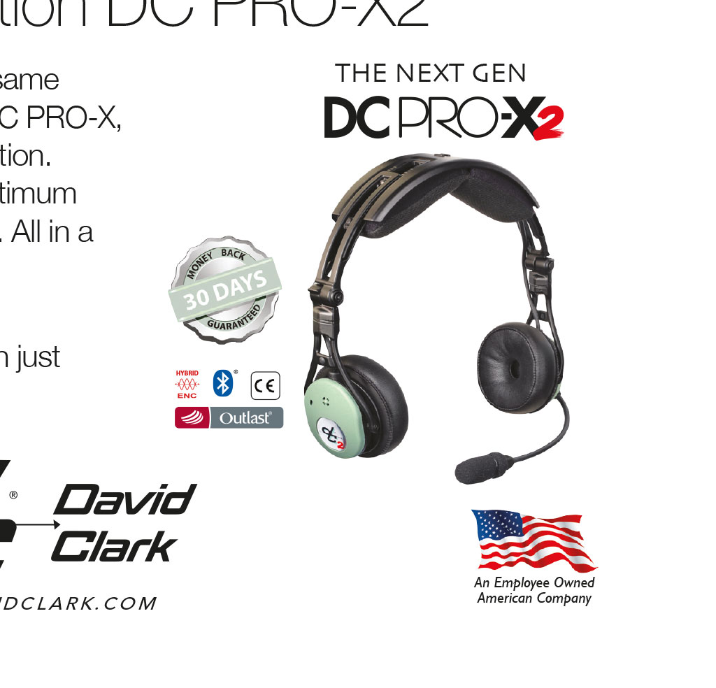 Youve worked hard to earn these bars. Now, reward yourself. The next generation DC PRO-X2 THE NEXT GEN The next generation DC PRO-X2 offers all the same features that have made its predecessor, the DC PRO-X, the most popular pro pilot ANR headset in aviation. Now with Automatic Gain Control (AGC) for optimum ANR performance and Enhanced Auto Shutoff. All in a durable, yet extremely comfortable, lightweight rest-on-ear design. After all, youre not just any pilot, so why fly with just any headset? HYBRID Visit www.davidclark.com for more information. 2019 David Clark Company Incorporated Green headset domes are a David Clark registered trademark. WWW.DAVIDCLARK.COM An Employee Owned American Company