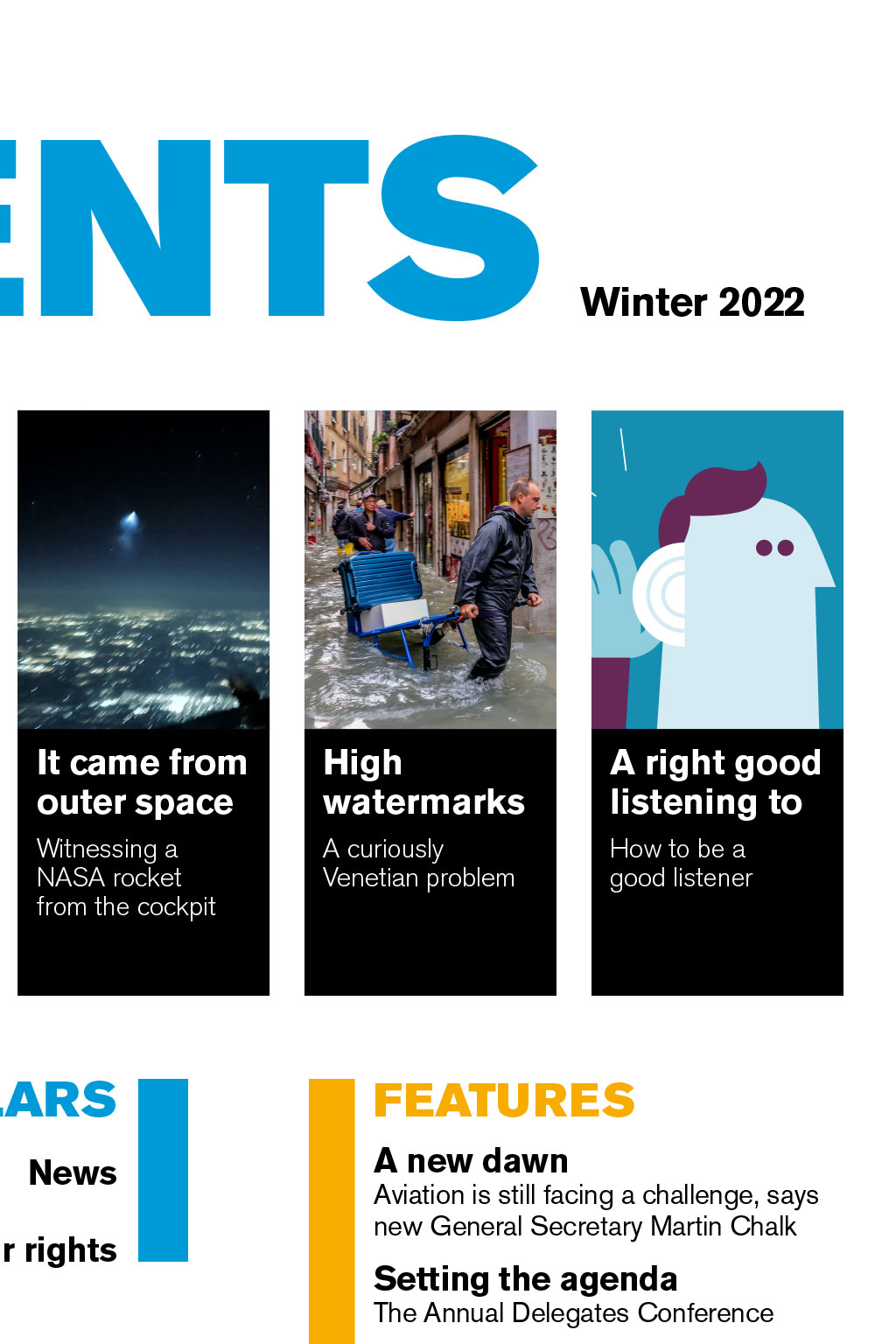 CONTENTS Winter 2022 Requesting a diversion Antarctic air ops Fight or flight It came from outer space Recovery times A right good listening to What happens when you make that call? Its peak season for the British Antarctic Survey The challenge of getting back a UK licence Witnessing a NASA rocket from the cockpit How will aviation bounce back? How to be a good listener TECH LOG Log notices REGULARS News Know your rights FEATURES A new dawn Aviation is still facing a challenge, says new General Secretary Martin Chalk Setting the agenda The Annual Delegates Conference The day Britain stopped flying 2020 wasnt the first year that flights were halted