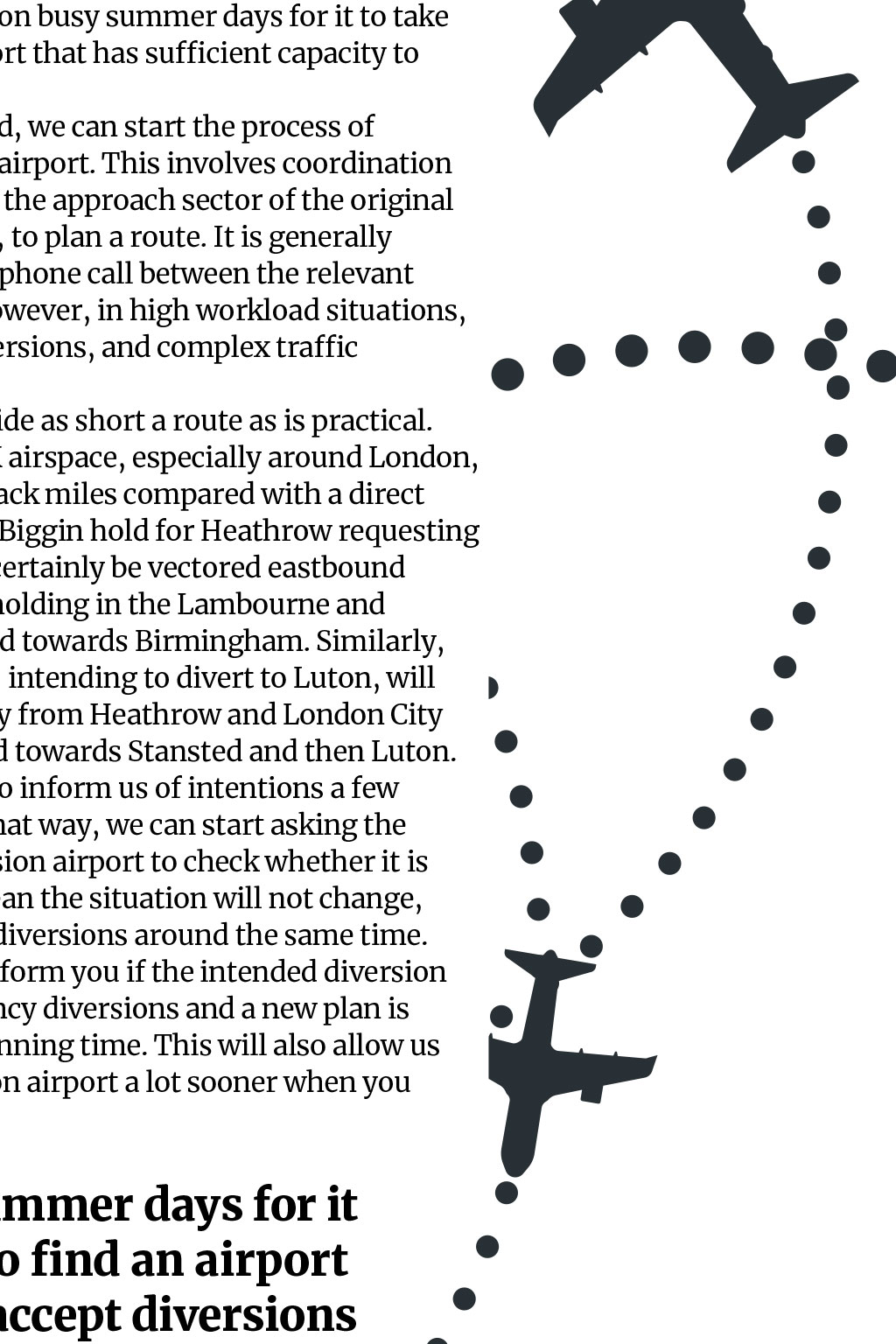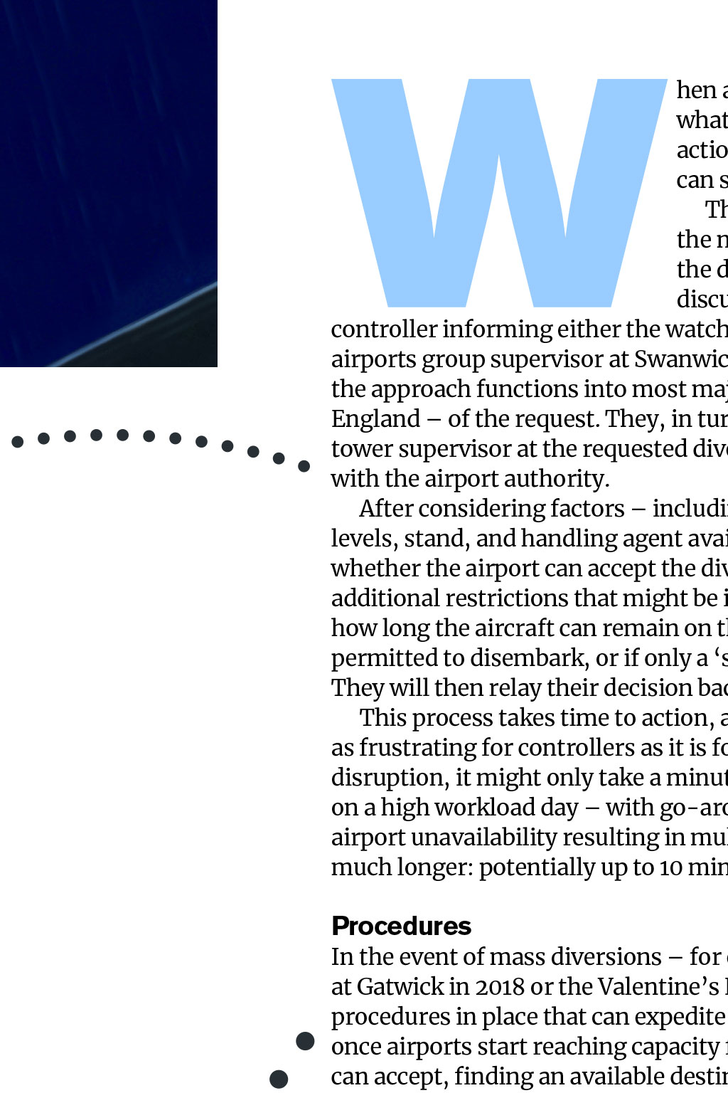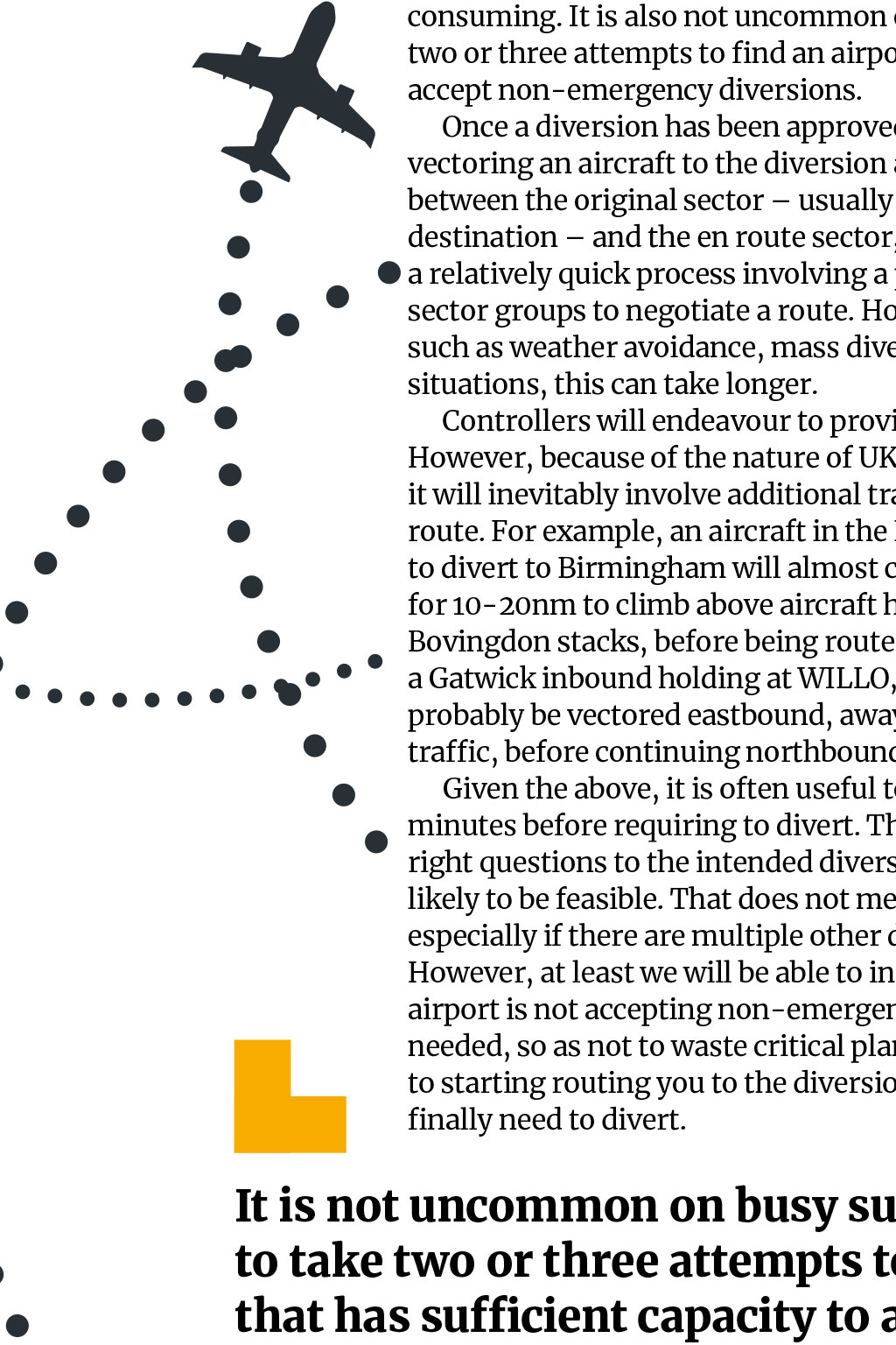 DIVERSIONS Requesting a diversion As we move back towards busier skies, the likelihood of diversions will increase. Heres what to expect By Phil Tanner, Air Traffic Controller and member of the Guild of Air Traffic Control Officers (GATCO) hen an aircraft requests a diversion, for whatever reason, there is a sequence of actions that need to be taken before we can start vectoring you there. The first thing we need to check is that the nominated airport can accommodate the diversion. This involves a series of discussions, starting with the individual controller informing either the watch supervisor at an airport or the airports group supervisor at Swanwick, who is responsible for overseeing the approach functions into most major airports in the southeast of England of the request. They, in turn, will pass the request onto the tower supervisor at the requested diversion airport, who will coordinate with the airport authority. After considering factors including the current and forecast traffic levels, stand, and handling agent availability they will determine whether the airport can accept the diversion. They will also look into any additional restrictions that might be imposed, such as a time limit for how long the aircraft can remain on the ground, whether passengers are permitted to disembark, or if only a splash and dash for fuel is permitted. They will then relay their decision back down the chain. This process takes time to action, and the wait for a response can be just as frustrating for controllers as it is for pilots. On a quiet day, with little disruption, it might only take a minute or two to receive a response. But on a high workload day with go-arounds, strong winds, low visibility or airport unavailability resulting in multiple diversion requests it can take much longer: potentially up to 10 minutes in extreme cases. Procedures In the event of mass diversions for example, the drone incident at Gatwick in 2018 or the Valentines Day storms in 2014 there are procedures in place that can expedite the process slightly. However, once airports start reaching capacity for the number of diversions they can accept, finding an available destination can become more timeconsuming. It is also not uncommon on busy summer days for it to take two or three attempts to find an airport that has sufficient capacity to accept non-emergency diversions. Once a diversion has been approved, we can start the process of vectoring an aircraft to the diversion airport. This involves coordination between the original sector usually the approach sector of the original destination and the en route sector, to plan a route. It is generally a relatively quick process involving a phone call between the relevant sector groups to negotiate a route. However, in high workload situations, such as weather avoidance, mass diversions, and complex traffic situations, this can take longer. Controllers will endeavour to provide as short a route as is practical. However, because of the nature of UK airspace, especially around London, it will inevitably involve additional track miles compared with a direct route. For example, an aircraft in the Biggin hold for Heathrow requesting to divert to Birmingham will almost certainly be vectored eastbound for 10-20nm to climb above aircraft holding in the Lambourne and Bovingdon stacks, before being routed towards Birmingham. Similarly, a Gatwick inbound holding at WILLO, intending to divert to Luton, will probably be vectored eastbound, away from Heathrow and London City traffic, before continuing northbound towards Stansted and then Luton. Given the above, it is often useful to inform us of intentions a few minutes before requiring to divert. That way, we can start asking the right questions to the intended diversion airport to check whether it is likely to be feasible. That does not mean the situation will not change, especially if there are multiple other diversions around the same time. However, at least we will be able to inform you if the intended diversion airport is not accepting non-emergency diversions and a new plan is needed, so as not to waste critical planning time. This will also allow us to starting routing you to the diversion airport a lot sooner when you finally need to divert. It is not uncommon on busy summer days for it to take two or three attempts to find an airport that has sufficient capacity to accept diversions In an emergency It goes without saying that none of the above applies to aircraft that have declared an emergency or require to divert for time-critical reasons, such as disruptive passengers or a security situation. In these cases, we will pull out all the stops to vector you to the destination of your choosing using the shortest practical route, bearing in mind that this is not always a direct route because of the extremely complicated nature of UK terminal airspace. I hope that provides a useful insight into what goes on from an ATC perspective when diversions occur. It may not always seem like it at the time, but we will always try our best to accommodate your request as quickly as possible. Sometimes, though, it just cannot be done. The more notice you can give us of your intentions, the better we will be able to assist and, if you have any questions, we will always try to find time to answer whenever possible.