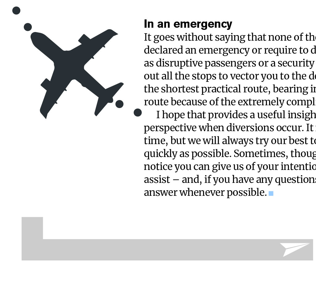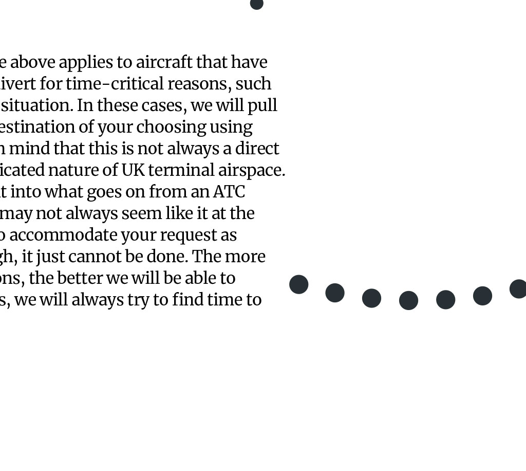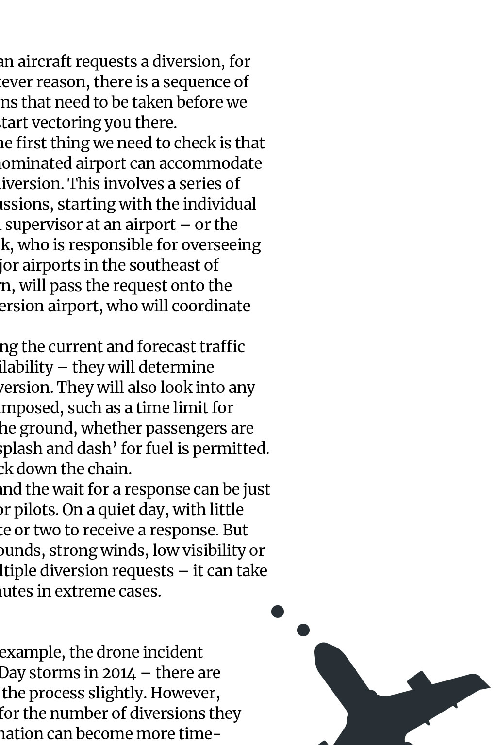 DIVERSIONS Requesting a diversion As we move back towards busier skies, the likelihood of diversions will increase. Heres what to expect By Phil Tanner, Air Traffic Controller and member of the Guild of Air Traffic Control Officers (GATCO) hen an aircraft requests a diversion, for whatever reason, there is a sequence of actions that need to be taken before we can start vectoring you there. The first thing we need to check is that the nominated airport can accommodate the diversion. This involves a series of discussions, starting with the individual controller informing either the watch supervisor at an airport or the airports group supervisor at Swanwick, who is responsible for overseeing the approach functions into most major airports in the southeast of England of the request. They, in turn, will pass the request onto the tower supervisor at the requested diversion airport, who will coordinate with the airport authority. After considering factors including the current and forecast traffic levels, stand, and handling agent availability they will determine whether the airport can accept the diversion. They will also look into any additional restrictions that might be imposed, such as a time limit for how long the aircraft can remain on the ground, whether passengers are permitted to disembark, or if only a splash and dash for fuel is permitted. They will then relay their decision back down the chain. This process takes time to action, and the wait for a response can be just as frustrating for controllers as it is for pilots. On a quiet day, with little disruption, it might only take a minute or two to receive a response. But on a high workload day with go-arounds, strong winds, low visibility or airport unavailability resulting in multiple diversion requests it can take much longer: potentially up to 10 minutes in extreme cases. Procedures In the event of mass diversions for example, the drone incident at Gatwick in 2018 or the Valentines Day storms in 2014 there are procedures in place that can expedite the process slightly. However, once airports start reaching capacity for the number of diversions they can accept, finding an available destination can become more timeconsuming. It is also not uncommon on busy summer days for it to take two or three attempts to find an airport that has sufficient capacity to accept non-emergency diversions. Once a diversion has been approved, we can start the process of vectoring an aircraft to the diversion airport. This involves coordination between the original sector usually the approach sector of the original destination and the en route sector, to plan a route. It is generally a relatively quick process involving a phone call between the relevant sector groups to negotiate a route. However, in high workload situations, such as weather avoidance, mass diversions, and complex traffic situations, this can take longer. Controllers will endeavour to provide as short a route as is practical. However, because of the nature of UK airspace, especially around London, it will inevitably involve additional track miles compared with a direct route. For example, an aircraft in the Biggin hold for Heathrow requesting to divert to Birmingham will almost certainly be vectored eastbound for 10-20nm to climb above aircraft holding in the Lambourne and Bovingdon stacks, before being routed towards Birmingham. Similarly, a Gatwick inbound holding at WILLO, intending to divert to Luton, will probably be vectored eastbound, away from Heathrow and London City traffic, before continuing northbound towards Stansted and then Luton. Given the above, it is often useful to inform us of intentions a few minutes before requiring to divert. That way, we can start asking the right questions to the intended diversion airport to check whether it is likely to be feasible. That does not mean the situation will not change, especially if there are multiple other diversions around the same time. However, at least we will be able to inform you if the intended diversion airport is not accepting non-emergency diversions and a new plan is needed, so as not to waste critical planning time. This will also allow us to starting routing you to the diversion airport a lot sooner when you finally need to divert. It is not uncommon on busy summer days for it to take two or three attempts to find an airport that has sufficient capacity to accept diversions In an emergency It goes without saying that none of the above applies to aircraft that have declared an emergency or require to divert for time-critical reasons, such as disruptive passengers or a security situation. In these cases, we will pull out all the stops to vector you to the destination of your choosing using the shortest practical route, bearing in mind that this is not always a direct route because of the extremely complicated nature of UK terminal airspace. I hope that provides a useful insight into what goes on from an ATC perspective when diversions occur. It may not always seem like it at the time, but we will always try our best to accommodate your request as quickly as possible. Sometimes, though, it just cannot be done. The more notice you can give us of your intentions, the better we will be able to assist and, if you have any questions, we will always try to find time to answer whenever possible.