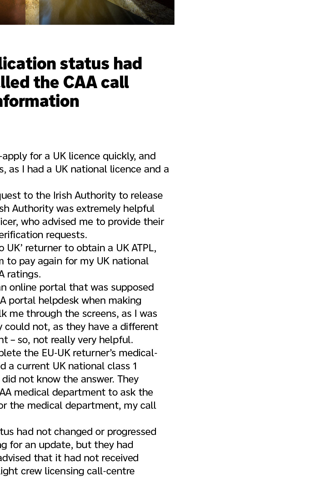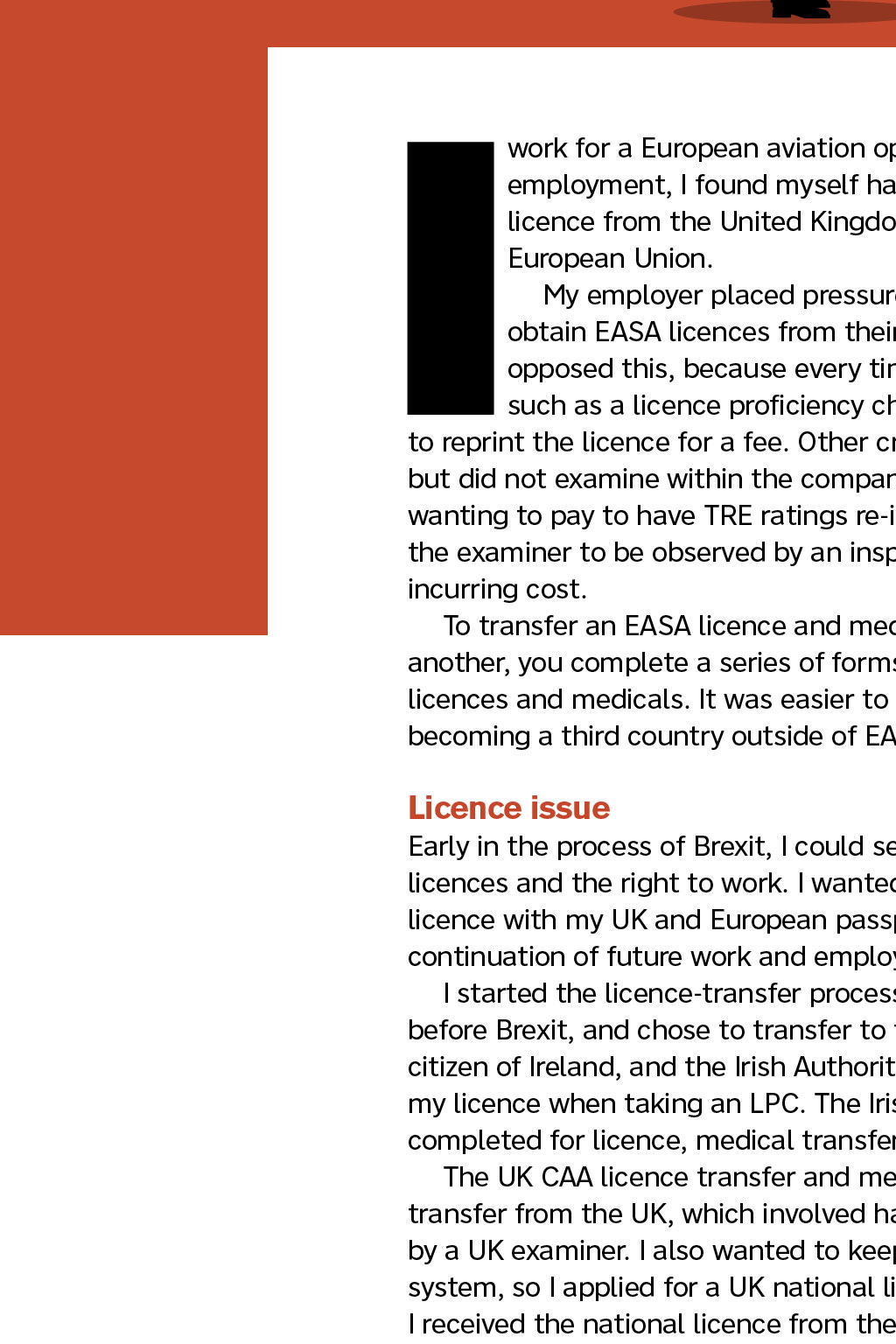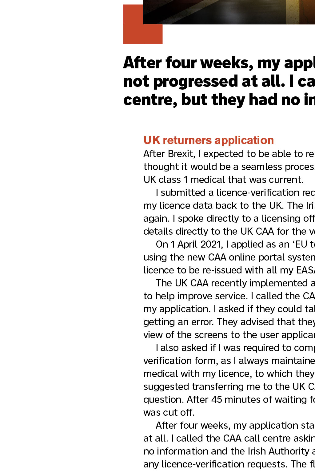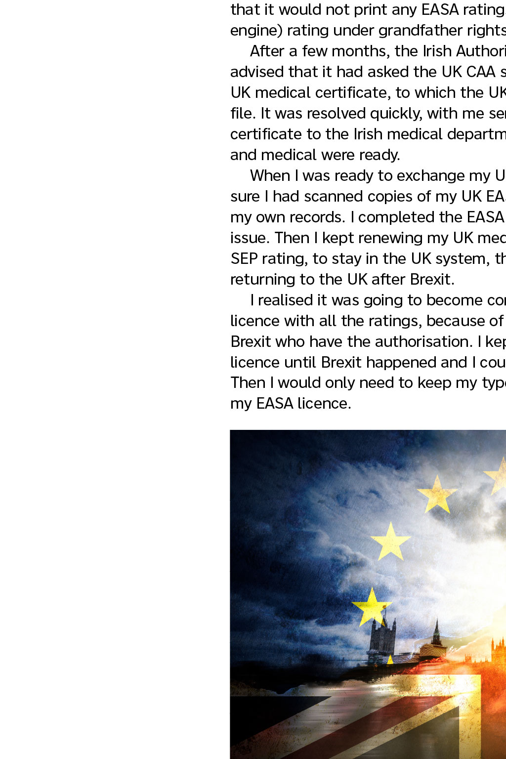 LICENCES Fight or flight Getting a UK licence back after Brexit has been a challenge for some By a BALPA member work for a European aviation operator. For continuation of my employment, I found myself having to transfer my flight crew licence from the United Kingdom after the UKs exit from the European Union. My employer placed pressure upon myself and colleagues to obtain EASA licences from their state of AOC registration. I, however, opposed this, because every time I would have a licensing event such as a licence proficiency check (LPC) their Authority would have to reprint the licence for a fee. Other crew members who were examiners, but did not examine within the company, had issues with the company not wanting to pay to have TRE ratings re-issued, as the new Authority required the examiner to be observed by an inspector, attend seminars or similar, incurring cost. To transfer an EASA licence and medical from one member state to another, you complete a series of forms with both member states to move licences and medicals. It was easier to do this before Brexit and the UK becoming a third country outside of EASA. Licence issue Early in the process of Brexit, I could see there might be an issue with licences and the right to work. I wanted to make sure I had both a UK/EASA licence with my UK and European passport, to maintain the best possible continuation of future work and employment. I started the licence-transfer process to leave the UK around 12 months before Brexit, and chose to transfer to the Irish Aviation Authority. I am a citizen of Ireland, and the Irish Authority allowed any EASA examiner to sign my licence when taking an LPC. The Irish Aviation Authority required forms completed for licence, medical transfer, and copies of ATPL exam results. The UK CAA licence transfer and medical forms were completed to transfer from the UK, which involved having a copy of my licence verified by a UK examiner. I also wanted to keep something in the UK licensing system, so I applied for a UK national licence when transferring out. When I received the national licence from the UK CAA, it included a note advising that it would not print any EASA ratings and could only give me a SEP (single engine) rating under grandfather rights. After a few months, the Irish Authority medical department called me. It advised that it had asked the UK CAA several times for a copy of my latest UK medical certificate, to which the UK kept sending my medical records file. It was resolved quickly, with me sending a scanned copy of my medical certificate to the Irish medical department, and the following day my licence and medical were ready. When I was ready to exchange my UK EASA licence for the Irish, I made sure I had scanned copies of my UK EASA licence and UK EASA medical for my own records. I completed the EASA licence exchange with Ireland without issue. Then I kept renewing my UK medical for my UK national licence with SEP rating, to stay in the UK system, thinking this would help later when returning to the UK after Brexit. I realised it was going to become complicated to maintain a UK and EASA licence with all the ratings, because of cost and a lack of examiners postBrexit who have the authorisation. I kept all my ratings current on my Irish licence until Brexit happened and I could get my full UK licence back. Then I would only need to keep my type rating for commercial work on my EASA licence. After four weeks, my application status had not progressed at all. I called the CAA call centre, but they had no information UK returners application After Brexit, I expected to be able to re-apply for a UK licence quickly, and thought it would be a seamless process, as I had a UK national licence and a UK class 1 medical that was current. I submitted a licence-verification request to the Irish Authority to release my licence data back to the UK. The Irish Authority was extremely helpful again. I spoke directly to a licensing officer, who advised me to provide their details directly to the UK CAA for the verification requests. On 1 April 2021, I applied as an EU to UK returner to obtain a UK ATPL, using the new CAA online portal system to pay again for my UK national licence to be re-issued with all my EASA ratings. The UK CAA recently implemented an online portal that was supposed to help improve service. I called the CAA portal helpdesk when making my application. I asked if they could talk me through the screens, as I was getting an error. They advised that they could not, as they have a different view of the screens to the user applicant so, not really very helpful. I also asked if I was required to complete the EU-UK returners medicalverification form, as I always maintained a current UK national class 1 medical with my licence, to which they did not know the answer. They suggested transferring me to the UK CAA medical department to ask the question. After 45 minutes of waiting for the medical department, my call was cut off. After four weeks, my application status had not changed or progressed at all. I called the CAA call centre asking for an update, but they had no information and the Irish Authority advised that it had not received any licence-verification requests. The flight crew licensing call-centre staff were very apologetic, but said they were not involved in processing licensing applications and would not be able to help, or put me in direct communication with a UK licensing officer, or even escalate the request to Ireland for licence verification. I regularly called the UK CAA call centre for updates, with no change, and I had to pay for an application to have my UK medical certificate reprinted. Eventually, I lodged a formal complaint with the UK CAA regarding its lack of customer service and having to pay for another UK medical, when already holding a certificate and medical file. I also wrote to the chairman of the CAA regarding my experience. Sir Stephen Hilliers office replied, advising t