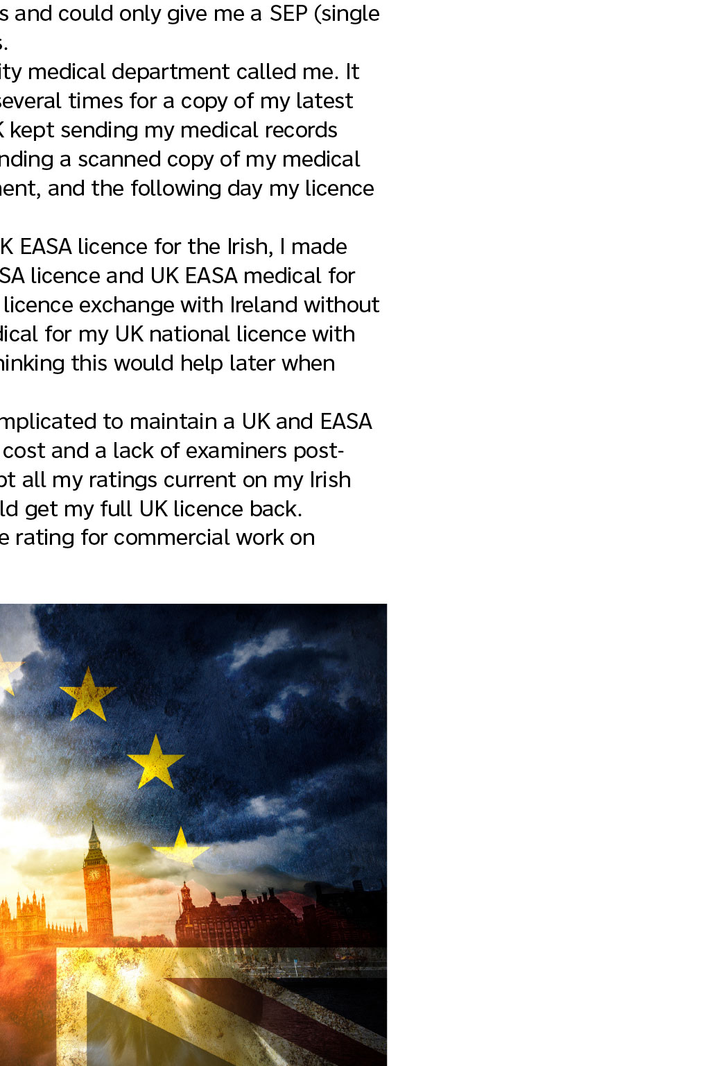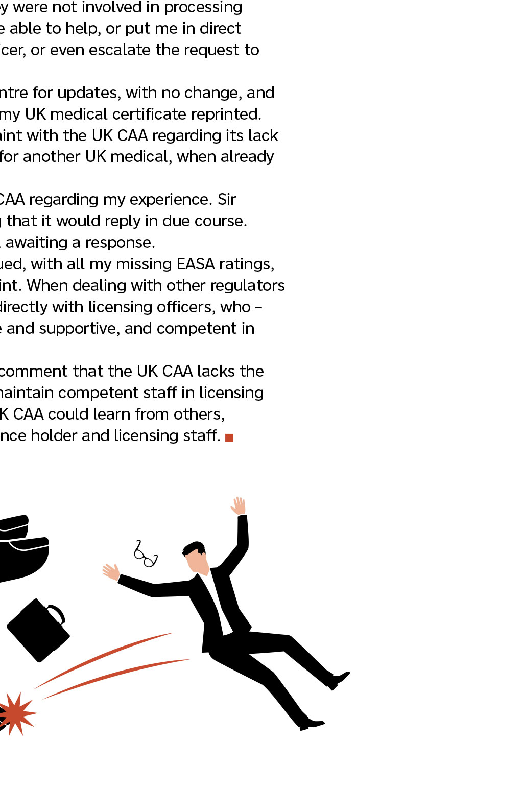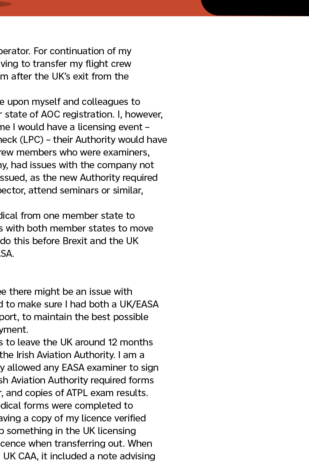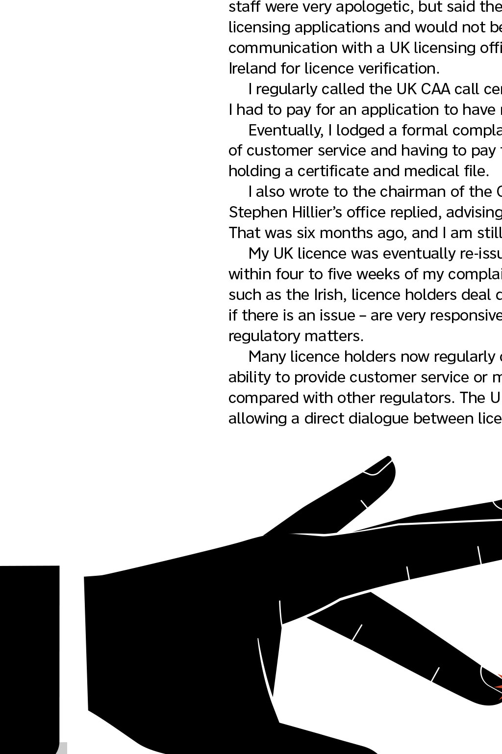 LICENCES Fight or flight Getting a UK licence back after Brexit has been a challenge for some By a BALPA member work for a European aviation operator. For continuation of my employment, I found myself having to transfer my flight crew licence from the United Kingdom after the UKs exit from the European Union. My employer placed pressure upon myself and colleagues to obtain EASA licences from their state of AOC registration. I, however, opposed this, because every time I would have a licensing event such as a licence proficiency check (LPC) their Authority would have to reprint the licence for a fee. Other crew members who were examiners, but did not examine within the company, had issues with the company not wanting to pay to have TRE ratings re-issued, as the new Authority required the examiner to be observed by an inspector, attend seminars or similar, incurring cost. To transfer an EASA licence and medical from one member state to another, you complete a series of forms with both member states to move licences and medicals. It was easier to do this before Brexit and the UK becoming a third country outside of EASA. Licence issue Early in the process of Brexit, I could see there might be an issue with licences and the right to work. I wanted to make sure I had both a UK/EASA licence with my UK and European passport, to maintain the best possible continuation of future work and employment. I started the licence-transfer process to leave the UK around 12 months before Brexit, and chose to transfer to the Irish Aviation Authority. I am a citizen of Ireland, and the Irish Authority allowed any EASA examiner to sign my licence when taking an LPC. The Irish Aviation Authority required forms completed for licence, medical transfer, and copies of ATPL exam results. The UK CAA licence transfer and medical forms were completed to transfer from the UK, which involved having a copy of my licence verified by a UK examiner. I also wanted to keep something in the UK licensing system, so I applied for a UK national licence when transferring out. When I received the national licence from the UK CAA, it included a note advising that it would not print any EASA ratings and could only give me a SEP (single engine) rating under grandfather rights. After a few months, the Irish Authority medical department called me. It advised that it had asked the UK CAA several times for a copy of my latest UK medical certificate, to which the UK kept sending my medical records file. It was resolved quickly, with me sending a scanned copy of my medical certificate to the Irish medical department, and the following day my licence and medical were ready. When I was ready to exchange my UK EASA licence for the Irish, I made sure I had scanned copies of my UK EASA licence and UK EASA medical for my own records. I completed the EASA licence exchange with Ireland without issue. Then I kept renewing my UK medical for my UK national licence with SEP rating, to stay in the UK system, thinking this would help later when returning to the UK after Brexit. I realised it was going to become complicated to maintain a UK and EASA licence with all the ratings, because of cost and a lack of examiners postBrexit who have the authorisation. I kept all my ratings current on my Irish licence until Brexit happened and I could get my full UK licence back. Then I would only need to keep my type rating for commercial work on my EASA licence. After four weeks, my application status had not progressed at all. I called the CAA call centre, but they had no information UK returners application After Brexit, I expected to be able to re-apply for a UK licence quickly, and thought it would be a seamless process, as I had a UK national licence and a UK class 1 medical that was current. I submitted a licence-verification request to the Irish Authority to release my licence data back to the UK. The Irish Authority was extremely helpful again. I spoke directly to a licensing officer, who advised me to provide their details directly to the UK CAA for the verification requests. On 1 April 2021, I applied as an EU to UK returner to obtain a UK ATPL, using the new CAA online portal system to pay again for my UK national licence to be re-issued with all my EASA ratings. The UK CAA recently implemented an online portal that was supposed to help improve service. I called the CAA portal helpdesk when making my application. I asked if they could talk me through the screens, as I was getting an error. They advised that they could not, as they have a different view of the screens to the user applicant so, not really very helpful. I also asked if I was required to complete the EU-UK returners medicalverification form, as I always maintained a current UK national class 1 medical with my licence, to which they did not know the answer. They suggested transferring me to the UK CAA medical department to ask the question. After 45 minutes of waiting for the medical department, my call was cut off. After four weeks, my application status had not changed or progressed at all. I called the CAA call centre asking for an update, but they had no information and the Irish Authority advised that it had not received any licence-verification requests. The flight crew licensing call-centre staff were very apologetic, but said they were not involved in processing licensing applications and would not be able to help, or put me in direct communication with a UK licensing officer, or even escalate the request to Ireland for licence verification. I regularly called the UK CAA call centre for updates, with no change, and I had to pay for an application to have my UK medical certificate reprinted. Eventually, I lodged a formal complaint with the UK CAA regarding its lack of customer service and having to pay for another UK medical, when already holding a certificate and medical file. I also wrote to the chairman of the CAA regarding my experience. Sir Stephen Hilliers office replied, advising t