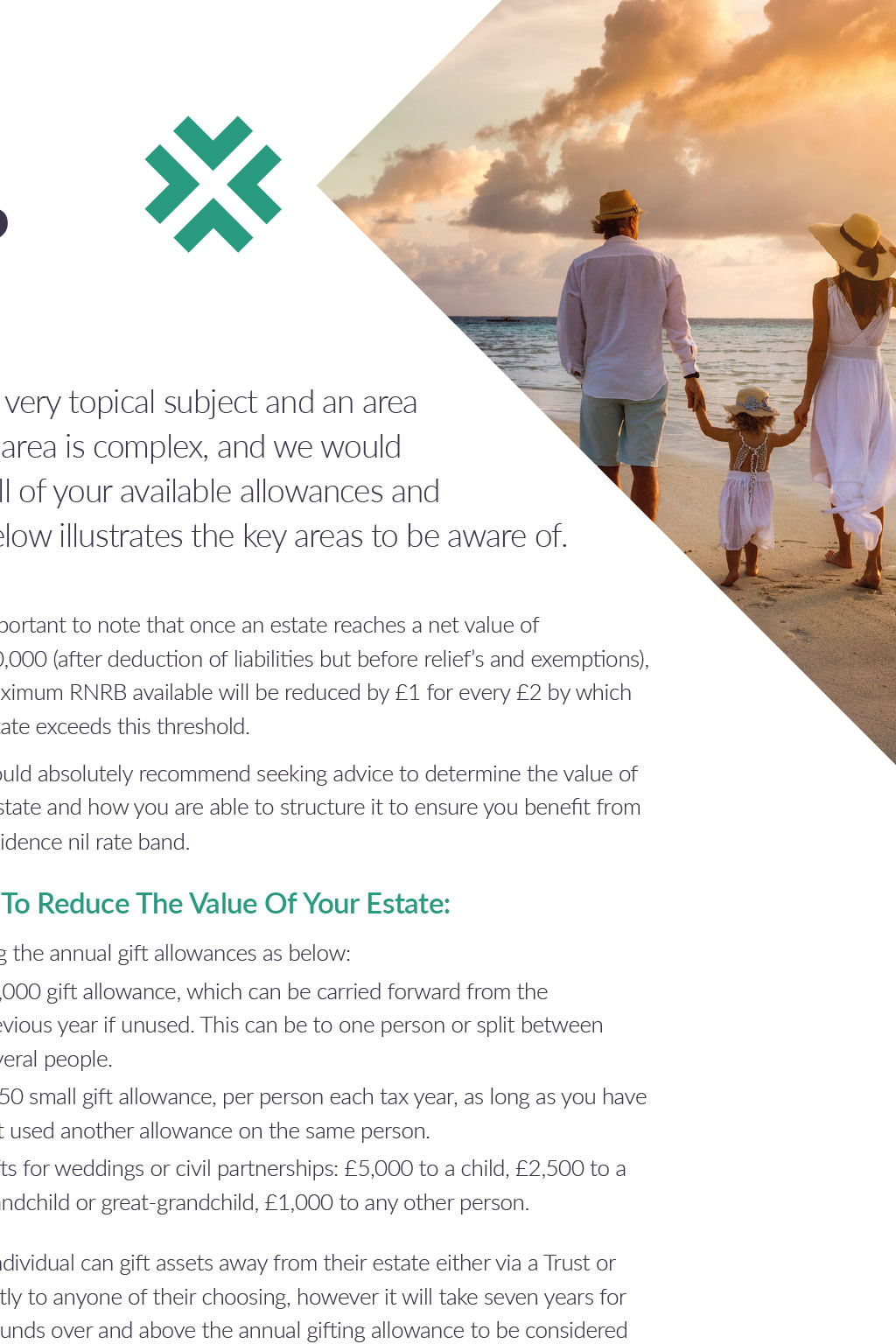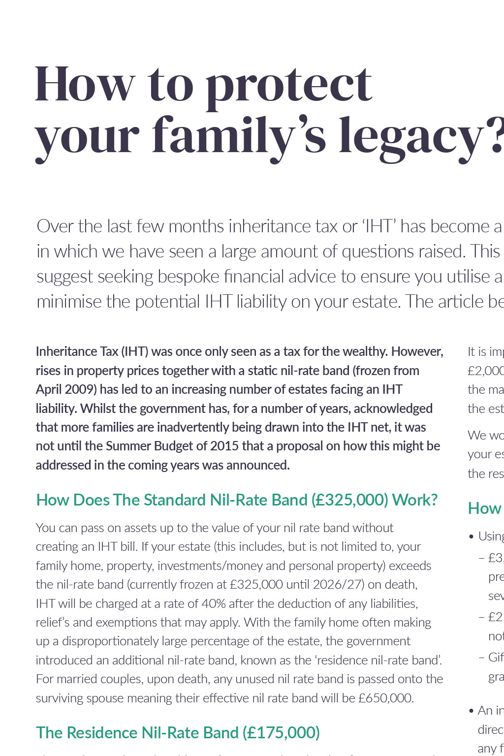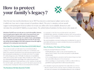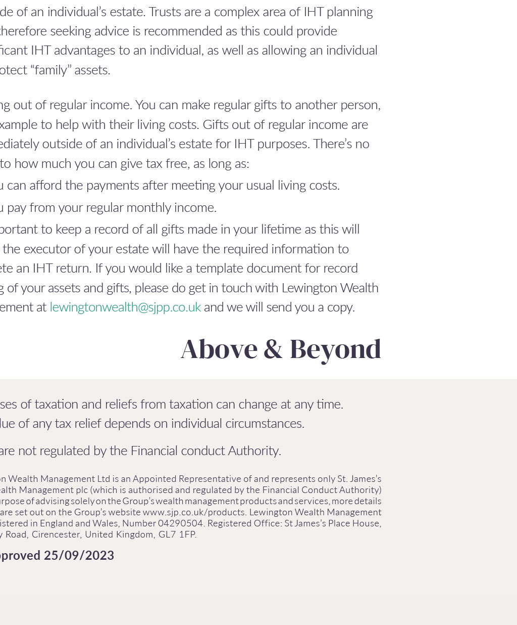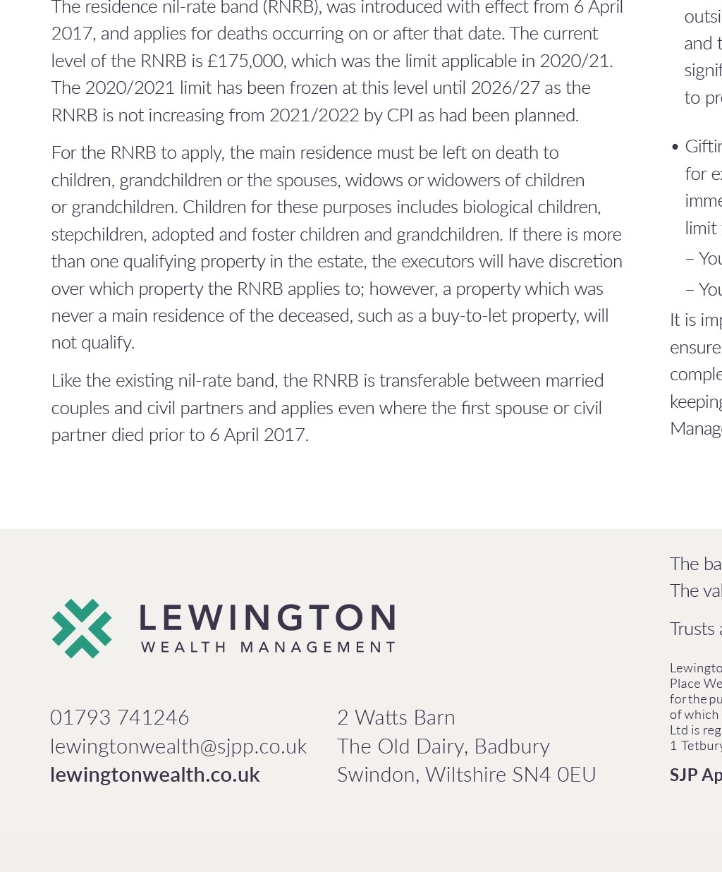 How to protect your familys legacy? Over the last few months inheritance tax or IHT has become a very topical subject and an area in which we have seen a large amount of questions raised. This area is complex, and we would suggest seeking bespoke financial advice to ensure you utilise all of your available allowances and minimise the potential IHT liability on your estate. The article below illustrates the key areas to be aware of. Inheritance Tax (IHT) was once only seen as a tax for the wealthy. However, rises in property prices together with a static nil-rate band (frozen from April 2009) has led to an increasing number of estates facing an IHT liability. Whilst the government has, for a number of years, acknowledged that more families are inadvertently being drawn into the IHT net, it was not until the Summer Budget of 2015 that a proposal on how this might be addressed in the coming years was announced. How Does The Standard Nil-Rate Band (325,000) Work? You can pass on assets up to the value of your nil rate band without creating an IHT bill. If your estate (this includes, but is not limited to, your family home, property, investments/money and personal property) exceeds the nil-rate band (currently frozen at 325,000 until 2026/27) on death, IHT will be charged at a rate of 40% after the deduction of any liabilities, reliefs and exemptions that may apply. With the family home often making up a disproportionately large percentage of the estate, the government introduced an additional nil-rate band, known as the residence nil-rate band. For married couples, upon death, any unused nil rate band is passed onto the surviving spouse meaning their effective nil rate band will be 650,000. The Residence Nil-Rate Band (175,000) The residence nil-rate band (RNRB), was introduced with effect from 6 April 2017, and applies for deaths occurring on or after that date. The current level of the RNRB is 175,000, which was the limit applicable in 2020/21. The 2020/2021 limit has been frozen at this level until 2026/27 as the RNRB is not increasing from 2021/2022 by CPI as had been planned. For the RNRB to apply, the main residence must be left on death to children, grandchildren or the spouses, widows or widowers of children or grandchildren. Children for these purposes includes biological children, stepchildren, adopted and foster children and grandchildren. If there is more than one qualifying property in the estate, the executors will have discretion over which property the RNRB applies to; however, a property which was never a main residence of the deceased, such as a buy-to-let property, will not qualify. Like the existing nil-rate band, the RNRB is transferable between married couples and civil partners and applies even where the first spouse or civil partner died prior to 6 April 2017. It is important to note that once an estate reaches a net value of 2,000,000 (after deduction of liabilities but before reliefs and exemptions), the maximum RNRB available will be reduced by 1 for every 2 by which the estate exceeds this threshold. We would absolutely recommend seeking advice to determine the value of your estate and how you are able to structure it to ensure you benefit from the residence nil rate band. How To Reduce The Value Of Your Estate: Using the annual gift allowances as below: 3,000 gift allowance, which can be carried forward from the previous year if unused. This can be to one person or split between several people. 250 small gift allowance, per person each tax year, as long as you have not used another allowance on the same person. Gifts for weddings or civil partnerships: 5,000 to a child, 2,500 to a grandchild or great-grandchild, 1,000 to any other person. An individual can gift assets away from their estate either via a Trust or directly to anyone of their choosing, however it will take seven years for any funds over and above the annual gifting allowance to be considered outside of an individuals estate. Trusts are a complex area of IHT planning and therefore seeking advice is recommended as this could provide significant IHT advantages to an individual, as well as allowing an individual to protect family assets. Gifting out of regular income. You can make regular gifts to another person, for example to help with their living costs. Gifts out of regular income are immediately outside of an individuals estate for IHT purposes. Theres no limit to how much you can give tax free, as long as: You can afford the payments after meeting your usual living costs. You pay from your regular monthly income. It is important to keep a record of all gifts made in your lifetime as this will ensure the executor of your estate will have the required information to complete an IHT return. If you would like a template document for record keeping of your assets and gifts, please do get in touch with Lewington Wealth Management at lewingtonwealth@sjpp.co.uk and we will send you a copy. Above & Beyond The bases of taxation and reliefs from taxation can change at any time. The value of any tax relief depends on individual circumstances. Trusts are not regulated by the Financial conduct Authority. 01793 741246 lewingtonwealth@sjpp.co.uk lewingtonwealth.co.uk 2 Watts Barn The Old Dairy, Badbury Swindon, Wiltshire SN4 0EU Lewington Wealth Management Ltd is an Appointed Representative of and represents only St. Jamess Place Wealth Management plc (which is authorised and regulated by the Financial Conduct Authority) for the purpose of advising solely on the Groups wealth management products and services, more details of which are set out on the Groups website www.sjp.co.uk/products. Lewington Wealth Management Ltd is registered in England and Wales, Number 04290504. Registered Office: St Jamess Place House, 1 Tetbury Road, Cirencester, United Kingdom, GL7 1FP. SJP Approved 25/09/2023