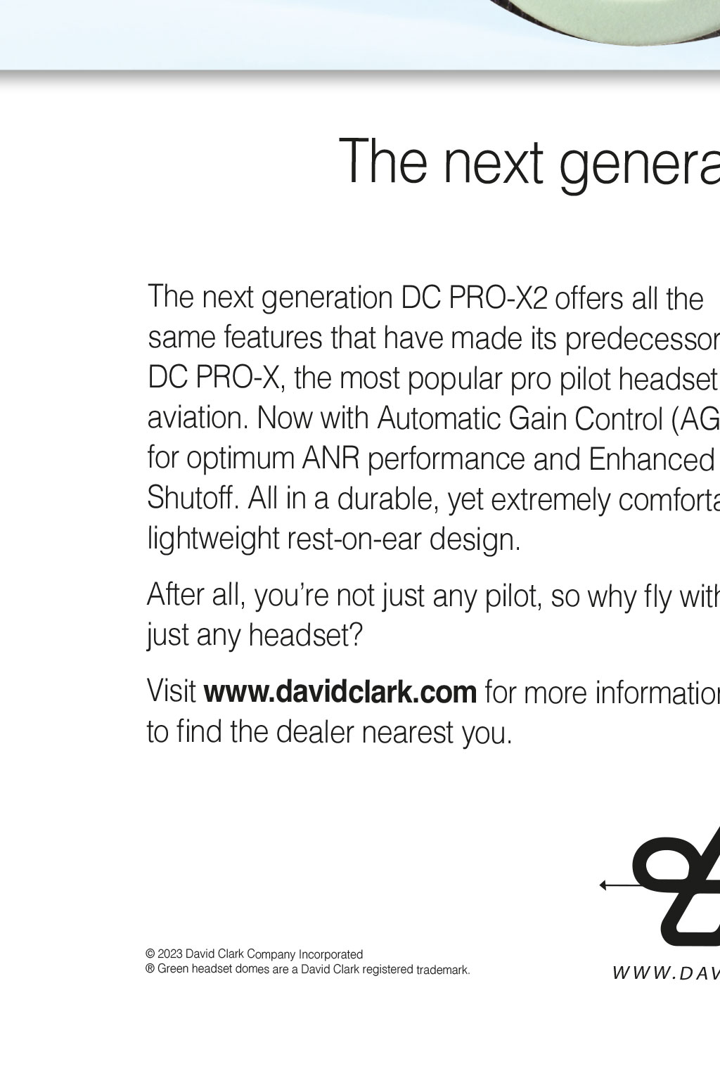 Youve worked hard to earn these bars. Now, reward yourself. The next generation DC PRO-X2 The next generation DC PRO-X2 offers all the same features that have made its predecessor, the DC PRO-X, the most popular pro pilot headset in aviation. Now with Automatic Gain Control (AGC) for optimum ANR performance and Enhanced Auto Shutoff. All in a durable, yet extremely comfortable, lightweight rest-on-ear design. After all, youre not just any pilot, so why fly with just any headset? Visit www.davidclark.com for more information and to find the dealer nearest you. 2023 David Clark Company Incorporated Green headset domes are a David Clark registered trademark. WWW.DAVIDCLARK.COM THE NEXT GEN