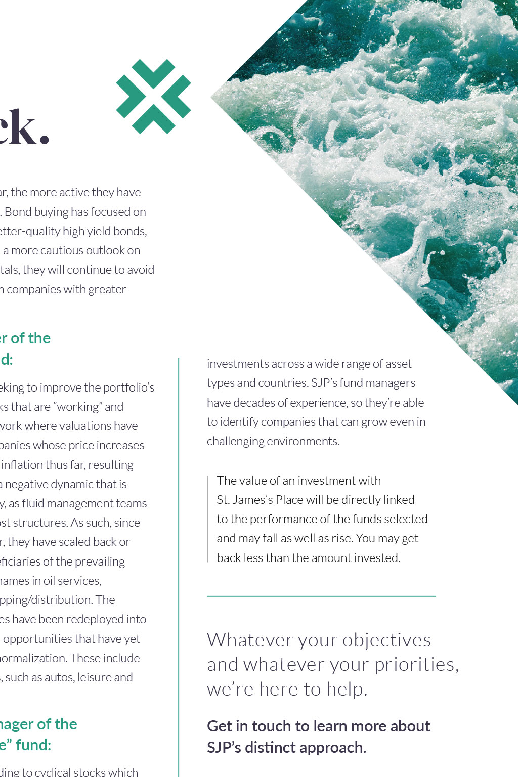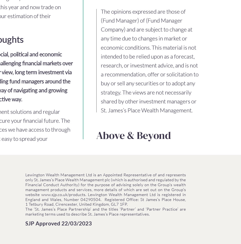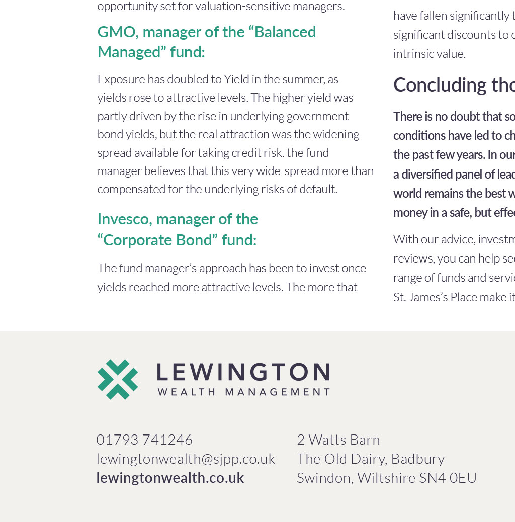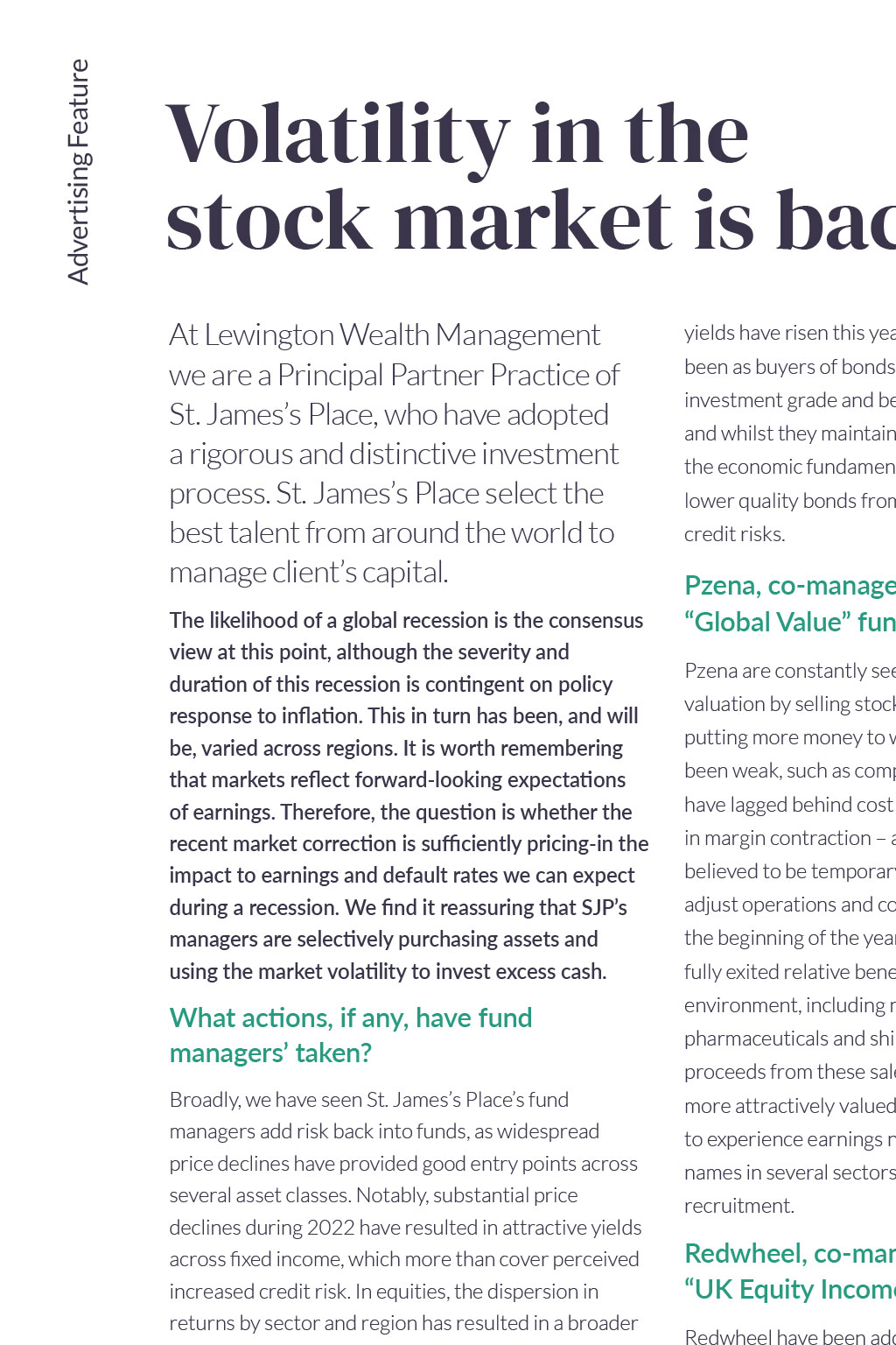 Advertising Feature Volatility in the stock market is back. At Lewington Wealth Management we are a Principal Partner Practice of St. Jamess Place, who have adopted a rigorous and distinctive investment process. St. Jamess Place select the best talent from around the world to manage clients capital. The likelihood of a global recession is the consensus view at this point, although the severity and duration of this recession is contingent on policy response to inflation. This in turn has been, and will be, varied across regions. It is worth remembering that markets reflect forward-looking expectations of earnings. Therefore, the question is whether the recent market correction is sufficiently pricing-in the impact to earnings and default rates we can expect during a recession. We find it reassuring that SJPs managers are selectively purchasing assets and using the market volatility to invest excess cash. yields have risen this year, the more active they have been as buyers of bonds. Bond buying has focused on investment grade and better-quality high yield bonds, and whilst they maintain a more cautious outlook on the economic fundamentals, they will continue to avoid lower quality bonds from companies with greater credit risks. Pzena, co-manager of the Global Value fund: investments across a wide range of asset Pzena are constantly seeking to improve the portfolios types and countries. SJPs fund managers valuation by selling stocks that are working and have decades of experience, so theyre able putting more money to work where valuations have to identify companies that can grow even in been weak, such as companies whose price increases challenging environments. have lagged behind cost inflation thus far, resulting in margin contraction a negative dynamic that is The value of an investment with believed to be temporary, as fluid management teams St. Jamess Place will be directly linked adjust operations and cost structures. As such, since to the performance of the funds selected the beginning of the year, they have scaled back or and may fall as well as rise. You may get fully exited relative beneficiaries of the prevailing back less than the amount invested. What actions, if any, have fund managers taken? environment, including names in oil services, Broadly, we have seen St. Jamess Places fund managers add risk back into funds, as widespread price declines have provided good entry points across several asset classes. Notably, substantial price declines during 2022 have resulted in attractive yields across fixed income, which more than cover perceived increased credit risk. In equities, the dispersion in returns by sector and region has resulted in a broader opportunity set for valuation-sensitive managers. more attractively valued opportunities that have yet GMO, manager of the Balanced Managed fund: pharmaceuticals and shipping/distribution. The proceeds from these sales have been redeployed into recruitment. Whatever your objectives and whatever your priorities, were here to help. Redwheel, co-manager of the UK Equity Income fund: Get in touch to learn more about SJPs distinct approach. to experience earnings normalization. These include names in several sectors, such as autos, leisure and Redwheel have been adding to cyclical stocks which have fallen significantly this year and now trade on significant discounts to our estimation of their intrinsic value. The opinions expressed are those of (Fund Manager) of (Fund Manager Company) and are subject to change at Exposure has doubled to Yield in the summer, as yields rose to attractive levels. The higher yield was partly driven by the rise in underlying government bond yields, but the real attraction was the widening spread available for taking credit risk. the fund manager believes that this very wide-spread more than compensated for the underlying risks of default. Concluding thoughts any time due to changes in market or There is no doubt that social, political and economic intended to be relied upon as a forecast, Invesco, manager of the Corporate Bond fund: money in a safe, but effective way. the past few years. In our view, long term investment via a diversified panel of leading fund managers around the world remains the best way of navigating and growing yields reached more attractive levels. The more that research, or investment advice, and is not a recommendation, offer or solicitation to buy or sell any securities or to adopt any strategy. The views are not necessarily shared by other investment managers or With our advice, investment solutions and regular The fund managers approach has been to invest once 01793 741246 lewingtonwealth@sjpp.co.uk lewingtonwealth.co.uk conditions have led to challenging financial markets over economic conditions. This material is not St. Jamess Place Wealth Management. reviews, you can help secure your financial future. The range of funds and services we have access to through St. Jamess Place make it easy to spread your 2 Watts Barn The Old Dairy, Badbury Swindon, Wiltshire SN4 0EU Above & Beyond Lewington Wealth Management Ltd is an Appointed Representative of and represents only St. Jamess Place Wealth Management plc (which is authorised and regulated by the Financial Conduct Authority) for the purpose of advising solely on the Groups wealth management products and services, more details of which are set out on the Groups website www.sjp.co.uk/products. Lewington Wealth Management Ltd is registered in England and Wales, Number 04290504. Registered Office: St Jamess Place House, 1 Tetbury Road, Cirencester, United Kingdom, GL7 1FP. The St. Jamess Place Partnership and the titles Partner and Partner Practice are marketing terms used to describe St. Jamess Place representatives. SJP Approved 22/03/2023