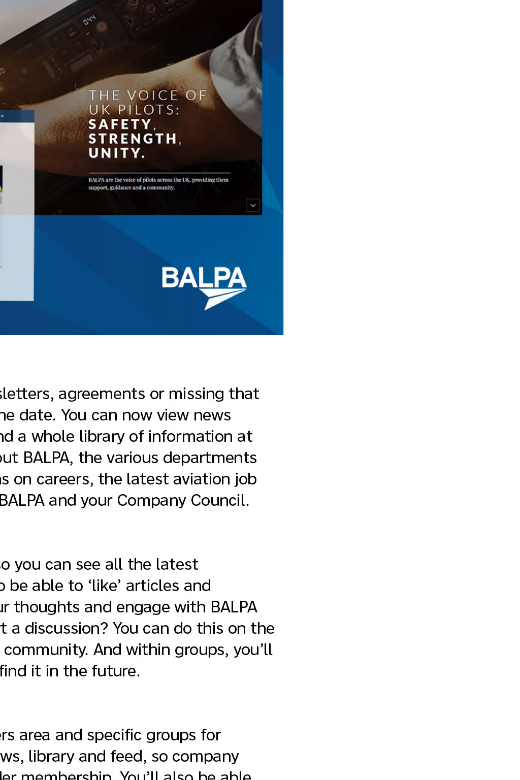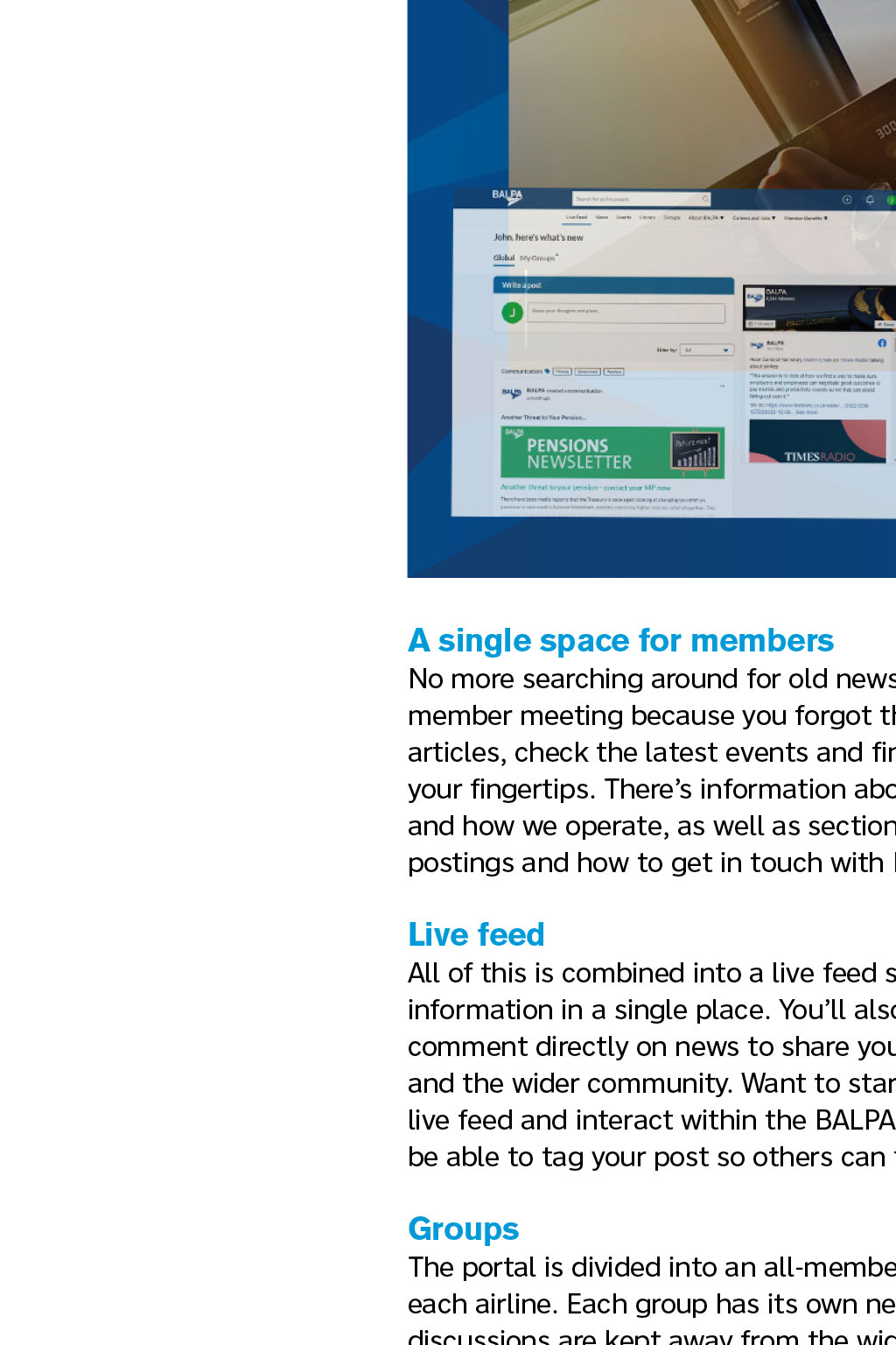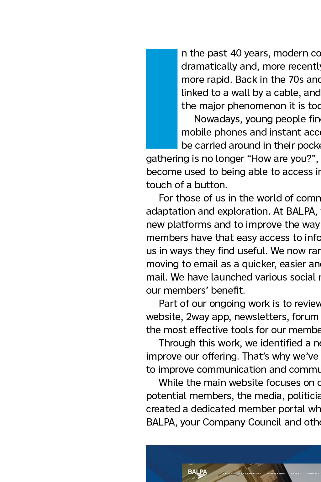 Were delighted to announce our new website and online groups By Nancy Jackson, BALPA Communications and External Relations Manager In the past 40 years, modern communication has altered dramatically and, more recently, that change has been even more rapid. Back in the 70s and 80s, telephones were static, linked to a wall by a cable, and the internet was yet to become the major phenomenon it is today. Nowadays, young people find it hard to imagine a world without mobile phones and instant access to the web on devices that can be carried around in their pocket. The first question at any party or gathering is no longer How are you?, but Whats the WiFi code? We have become used to being able to access information wherever we are, at the touch of a button. For those of us in the world of communications, it means constant adaptation and exploration. At BALPA, we have continued to adapt, to launch new platforms and to improve the way we communicate to ensure our members have that easy access to information and are able to engage with us in ways they find useful. We now rarely send communications by post, moving to email as a quicker, easier and more efficient way of sending you mail. We have launched various social media platforms and the 2Way app for our members benefit. Part of our ongoing work is to review our current platforms, including the website, 2way app, newsletters, forum and social media, and ensure they are the most effective tools for our members. Through this work, we identified a need to update, consolidate and improve our offering. Thats why weve launched our new website and portal, to improve communication and community engagement across BALPA. While the main website focuses on our external audiences such as potential members, the media, politicians, and the public, we have also created a dedicated member portal where you are able to engage with BALPA, your Company Council and other members in a new way. A single space for members No more searching around for old newsletters, agreements or missing that member meeting because you forgot the date. You can now view news articles, check the latest events and find a whole library of information at your fingertips. Theres information about BALPA, the various departments and how we operate, as well as sections on careers, the latest aviation job postings and how to get in touch with BALPA and your Company Council. Live feed All of this is combined into a live feed so you can see all the latest information in a single place. Youll also be able to like articles and comment directly on news to share your thoughts and engage with BALPA and the wider community. Want to start a discussion? You can do this on the live feed and interact within the BALPA community. And within groups, youll be able to tag your post so others can find it in the future. Groups The portal is divided into an all-members area and specific groups for each airline. Each group has its own news, library and feed, so company discussions are kept away from the wider membership. Youll also be able to join groups of interest, so when talking about work gets too much, you can join the discussion in other groups. Whether its sport related, motoring or one of our community groups, youll be able to chat with like-minded members across the BALPA community. How we communicate We realise you want to know whats happening at BALPA, but emails can quickly fill up your inbox, often arrive at inconvenient times and can be hard to find at a later date. So well be starting to change how we communicate. Youll see more regular news items posted on the portal, with the most important news sent out via email or as a digest periodically. That way you can stay informed but when it suits you. The portal will be mobile-friendly too, so you can login wherever you are. It will be regularly updated and fresh, so youll see lots of new pages being created. Out with the old The new platform will mean that the current BALPA forum and website will no longer be used, although the BALPA forum will remain visible for a period of time so members can look back at previous discussions. Both the current website and forum are now several years old and in need of major updates. Recently, we have experienced a number of issues with each platform. Their age has meant our IT providers are largely unable to support their continued operation. This has given the team the opportunity to look at all available options, and to implement a new platform that has a host of new facilities all in one place, and is modern and engaging for our members. Your feedback We know that to ensure the new website and portal stay current, well have to keep up with constant changes to modern technology. We will continue to adapt the offering to ensure we are able to provide the best facilities for BALPA members. Were really looking forward to you trying out the new sites, and are keen to hear your feedback. If you have any comments, please contact communications@balpa.org BALPA WE B S ITE The changing