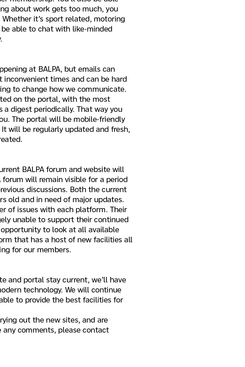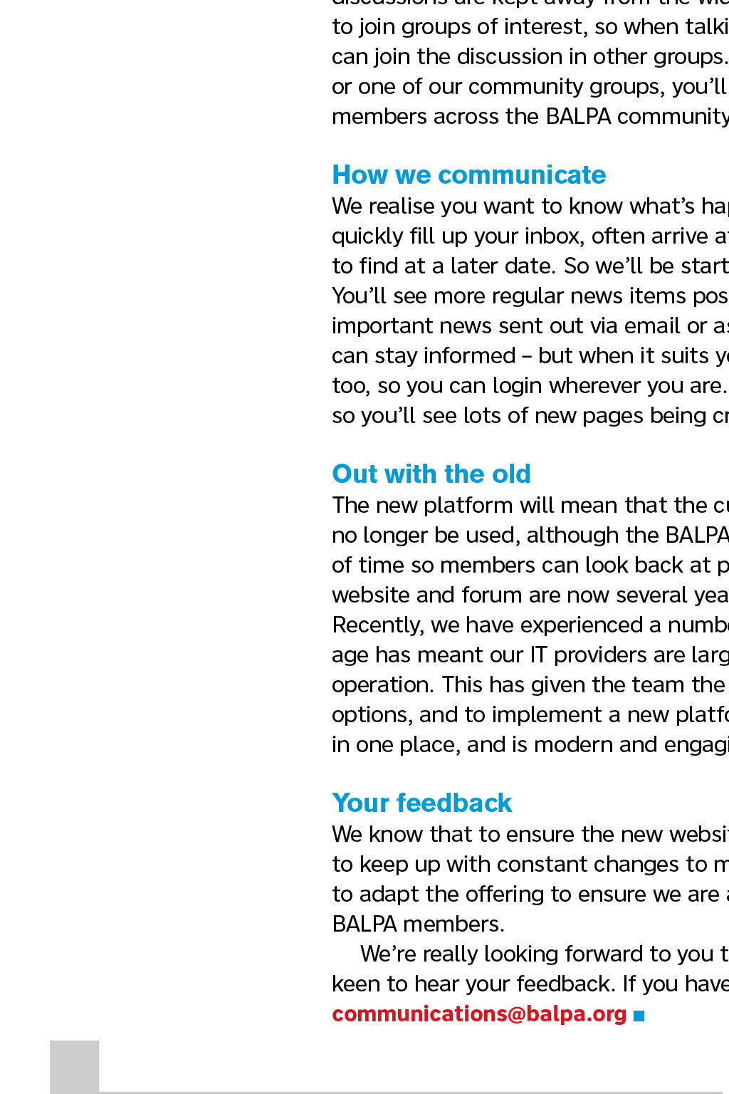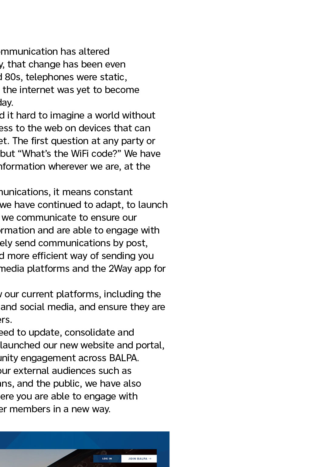 Were delighted to announce our new website and online groups By Nancy Jackson, BALPA Communications and External Relations Manager In the past 40 years, modern communication has altered dramatically and, more recently, that change has been even more rapid. Back in the 70s and 80s, telephones were static, linked to a wall by a cable, and the internet was yet to become the major phenomenon it is today. Nowadays, young people find it hard to imagine a world without mobile phones and instant access to the web on devices that can be carried around in their pocket. The first question at any party or gathering is no longer How are you?, but Whats the WiFi code? We have become used to being able to access information wherever we are, at the touch of a button. For those of us in the world of communications, it means constant adaptation and exploration. At BALPA, we have continued to adapt, to launch new platforms and to improve the way we communicate to ensure our members have that easy access to information and are able to engage with us in ways they find useful. We now rarely send communications by post, moving to email as a quicker, easier and more efficient way of sending you mail. We have launched various social media platforms and the 2Way app for our members benefit. Part of our ongoing work is to review our current platforms, including the website, 2way app, newsletters, forum and social media, and ensure they are the most effective tools for our members. Through this work, we identified a need to update, consolidate and improve our offering. Thats why weve launched our new website and portal, to improve communication and community engagement across BALPA. While the main website focuses on our external audiences such as potential members, the media, politicians, and the public, we have also created a dedicated member portal where you are able to engage with BALPA, your Company Council and other members in a new way. A single space for members No more searching around for old newsletters, agreements or missing that member meeting because you forgot the date. You can now view news articles, check the latest events and find a whole library of information at your fingertips. Theres information about BALPA, the various departments and how we operate, as well as sections on careers, the latest aviation job postings and how to get in touch with BALPA and your Company Council. Live feed All of this is combined into a live feed so you can see all the latest information in a single place. Youll also be able to like articles and comment directly on news to share your thoughts and engage with BALPA and the wider community. Want to start a discussion? You can do this on the live feed and interact within the BALPA community. And within groups, youll be able to tag your post so others can find it in the future. Groups The portal is divided into an all-members area and specific groups for each airline. Each group has its own news, library and feed, so company discussions are kept away from the wider membership. Youll also be able to join groups of interest, so when talking about work gets too much, you can join the discussion in other groups. Whether its sport related, motoring or one of our community groups, youll be able to chat with like-minded members across the BALPA community. How we communicate We realise you want to know whats happening at BALPA, but emails can quickly fill up your inbox, often arrive at inconvenient times and can be hard to find at a later date. So well be starting to change how we communicate. Youll see more regular news items posted on the portal, with the most important news sent out via email or as a digest periodically. That way you can stay informed but when it suits you. The portal will be mobile-friendly too, so you can login wherever you are. It will be regularly updated and fresh, so youll see lots of new pages being created. Out with the old The new platform will mean that the current BALPA forum and website will no longer be used, although the BALPA forum will remain visible for a period of time so members can look back at previous discussions. Both the current website and forum are now several years old and in need of major updates. Recently, we have experienced a number of issues with each platform. Their age has meant our IT providers are largely unable to support their continued operation. This has given the team the opportunity to look at all available options, and to implement a new platform that has a host of new facilities all in one place, and is modern and engaging for our members. Your feedback We know that to ensure the new website and portal stay current, well have to keep up with constant changes to modern technology. We will continue to adapt the offering to ensure we are able to provide the best facilities for BALPA members. Were really looking forward to you trying out the new sites, and are keen to hear your feedback. If you have any comments, please contact communications@balpa.org BALPA WE B S ITE The changing