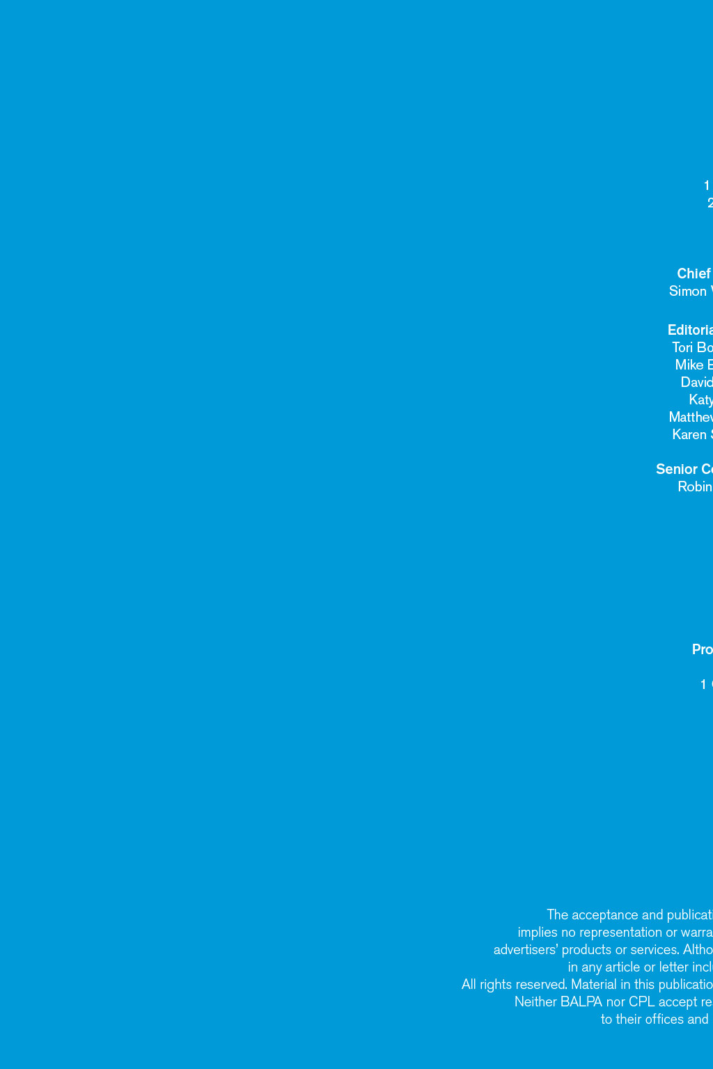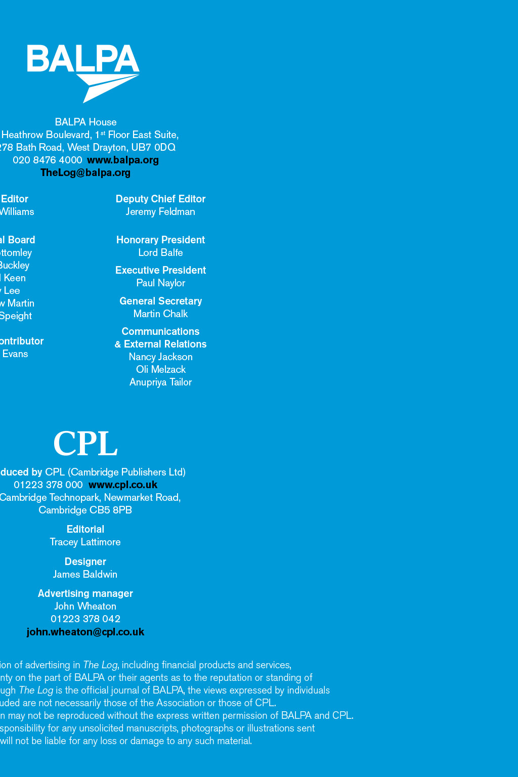 BALPA House 1 Heathrow Boulevard, 1st Floor East Suite, 278 Bath Road, West Drayton, UB7 0DQ 020 8476 4000 www.balpa.org TheLog@balpa.org Chief Editor Simon Williams Deputy Chief Editor Jeremy Feldman Editorial Board Tori Bottomley Mike Buckley Mark Dobson David Keen Katy Lee Matthew Martin Karen Speight Honorary President Lord Balfe Senior Contributor Robin Evans Executive President Paul Naylor General Secretary Martin Chalk Communications & External Relations Nancy Jackson Oli Melzack MAKING EVERY FLIGHT A SAFE FLIGHT Produced by CPL (Cambridge Publishers Ltd) 01223 378 000 www.cpl.co.uk 1 Cambridge Technopark, Newmarket Road, Cambridge CB5 8PB Editorial Tracey Lattimore Designer James Baldwin Advertising manager John Wheaton 01223 378 042 john.wheaton@cpl.co.uk The acceptance and publication of advertising in The Log, including financial products and services, implies no representation or warranty on the part of BALPA or their agents as to the reputation or standing of advertisers products or services. Although The Log is the official journal of BALPA, the views expressed by individuals in any article or letter included are not necessarily those of the Association or those of CPL. All rights reserved. Material in this publication may not be reproduced without the express written permission of BALPA and CPL. Neither BALPA nor CPL accept responsibility for any unsolicited manuscripts, photographs or illustrations sent to their offices and will not be liable for any loss or damage to any such material.