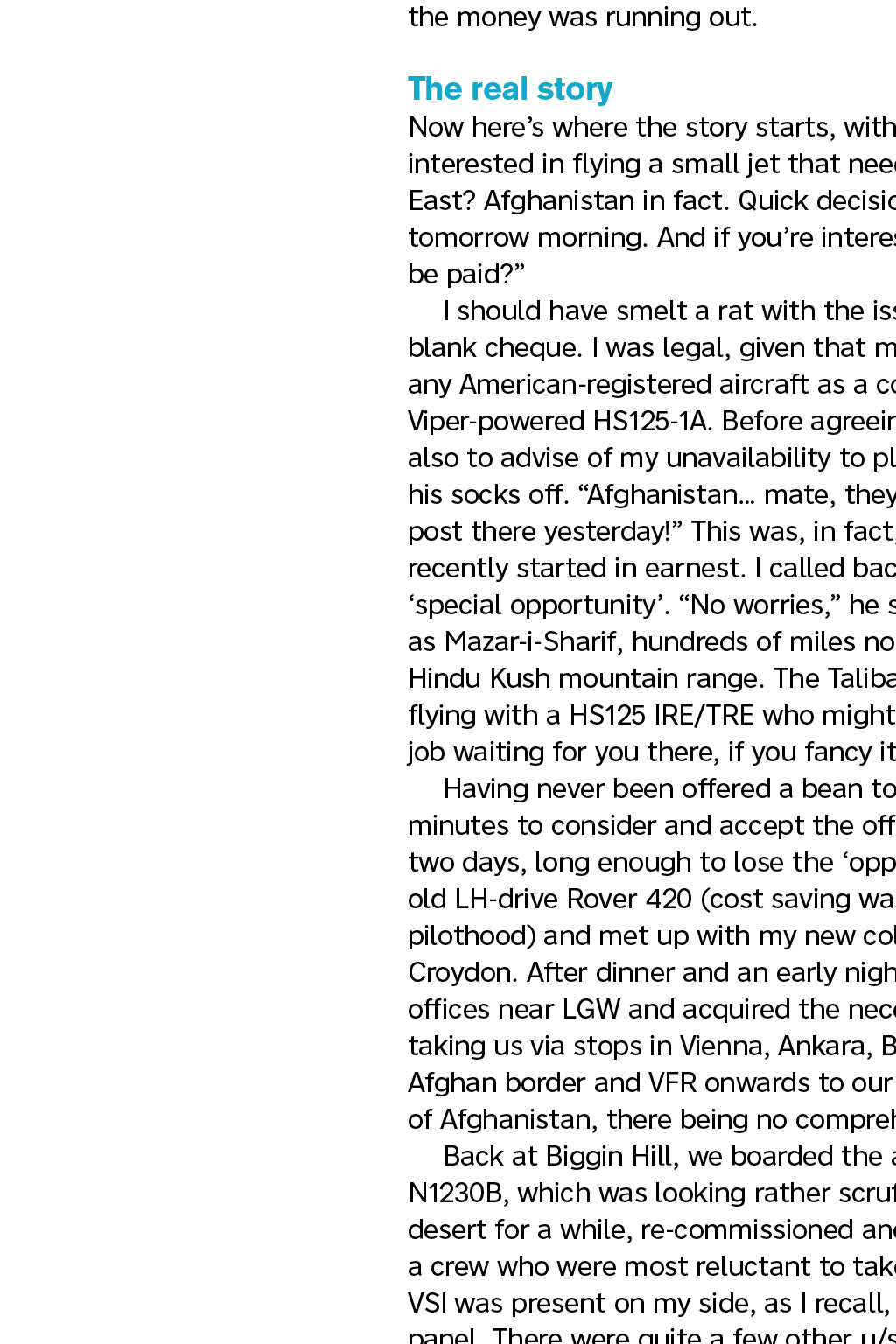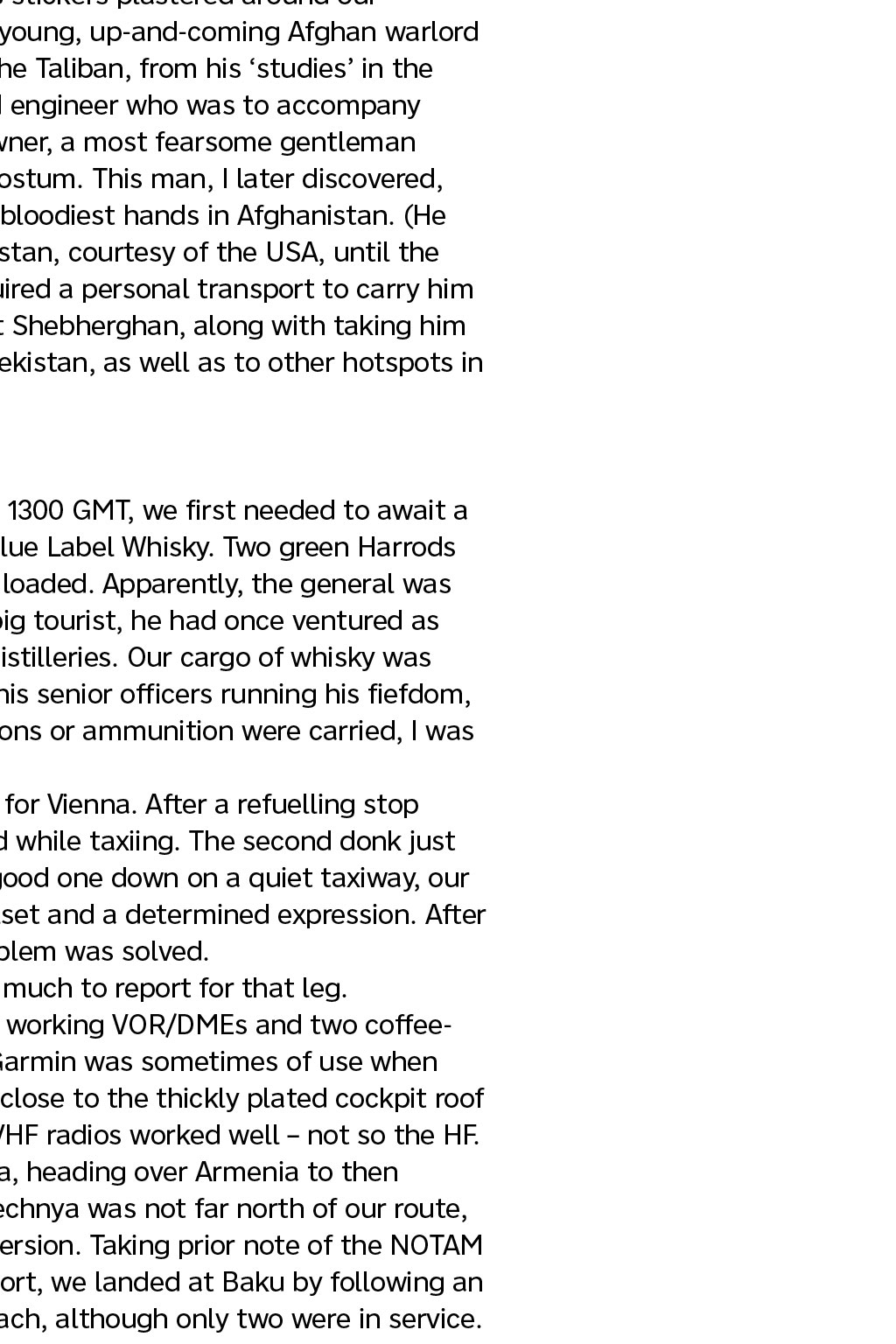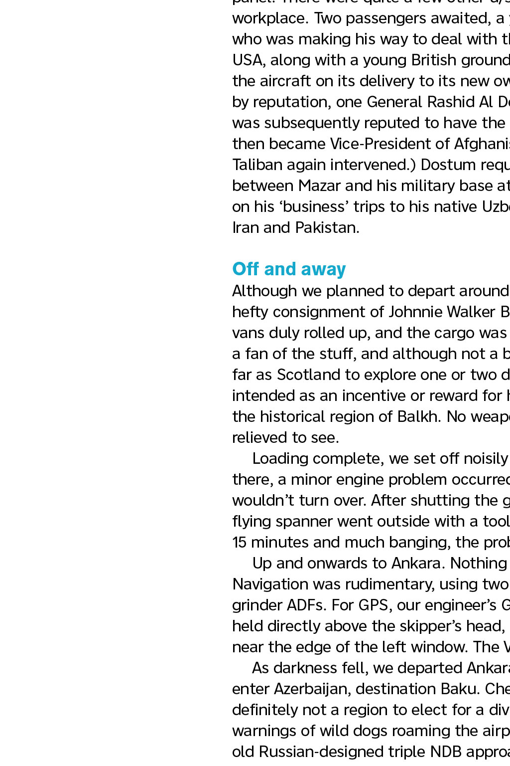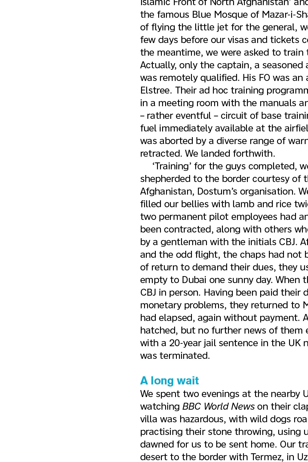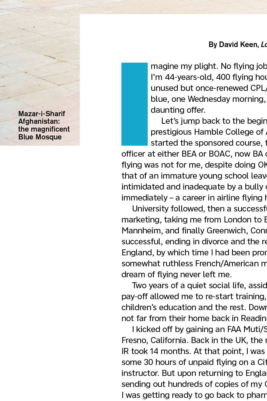 LIFE OF A PILOT A convert mission to Afghanistan was an unusual and risky way to gain hours No way to build hours By David Keen, Log Board member Mazar-i-Sharif Afghanistan: the magnificent Blue Mosque magine my plight. No flying job, with seemingly no opportunities. Im 44-years-old, 400 flying hours, mostly on light singles, and an unused but once-renewed CPL/IR, nearly two years old. Out of the blue, one Wednesday morning, the phone rings with a tempting but daunting offer. Lets jump back to the beginning. At 18, I was accepted at the prestigious Hamble College of Air Training, in Hampshire. Having started the sponsored course, the end point was becoming a second officer at either BEA or BOAC, now BA of course. Nine months in, I decided flying was not for me, despite doing OK on the course. My decision was that of an immature young school leaver, one who had been made to feel intimidated and inadequate by a bully of an instructor. Regret set in almost immediately a career in airline flying had been my childhood dream. University followed, then a successful 18-year career in pharmaceutical marketing, taking me from London to Basel, Switzerland, Philadelphia, Paris, Mannheim, and finally Greenwich, Connecticut. Starting a family was less successful, ending in divorce and the return of my ex-wife and two children to England, by which time I had been promoted to director level in a large and somewhat ruthless French/American multinational. During those years, my dream of flying never left me. Two years of a quiet social life, assiduous saving and a decent tax-free pay-off allowed me to re-start training, while honouring payments for my childrens education and the rest. Downsizing meant living in a virtual squat not far from their home back in Reading. I kicked off by gaining an FAA Muti/Single CPL/IR in three months flat in Fresno, California. Back in the UK, the more arduous BCPL/CPL/Frozen ATPL/ IR took 14 months. At that point, I was able to return to the US and gain some 30 hours of unpaid flying on a Citation 2, thanks to my previous flying instructor. But upon returning to England, there was nothing further, despite sending out hundreds of copies of my CV and making numerous phone calls. I was getting ready to go back to pharmaceuticals at a much lower level now; the money was running out. The real story Now heres where the story starts, with a phone call. Would you be interested in flying a small jet that needs to be delivered to the Middle East? Afghanistan in fact. Quick decision needed. Departing from Biggin Hill tomorrow morning. And if youre interested, how much would you expect to be paid? I should have smelt a rat with the issues of Afghanistan and the potential blank cheque. I was legal, given that my FAA licences permitted me to fly any American-registered aircraft as a co-pilot, this one being an ancient Viper-powered HS125-1A. Before agreeing, I called my brother to consult, and also to advise of my unavailability to play golf that afternoon. He laughed his socks off. Afghanistan mate, they hanged the president from a lamp post there yesterday! This was, in fact, true. The first Taliban campaign had recently started in earnest. I called back the chap who had offered me this special opportunity. No worries, he said. Youll only be taking the jet as far as Mazar-i-Sharif, hundreds of miles north of Kabul, and the other side of the Hindu Kush mountain range. The Taliban will never reach there. And youll be flying with a HS125 IRE/TRE who might even train you on the trip. Theres a job waiting for you there, if you fancy it. Now, is 5,000 a suitable payment? Having never been offered a bean to fly an aircraft, I took about two minutes to consider and accept the offer. In hindsight, I should have taken two days, long enough to lose the opportunity. Instead, I set off in my old LH-drive Rover 420 (cost saving was a big part of the mission towards pilothood) and met up with my new colleague at the old airport hotel in Croydon. After dinner and an early night, we drove to the flight planners offices near LGW and acquired the necessaries for clearances and a route taking us via stops in Vienna, Ankara, Baku. Then on via Turkmenistan to the Afghan border and VFR onwards to our official destination on the other side of Afghanistan, there being no comprehensive ATC coverage for that country. Back at Biggin Hill, we boarded the ancient Viper-powered HS125-1A, N1230B, which was looking rather scruffy. It had been stored in the Nevada desert for a while, re-commissioned and then flown to the UK via Miami by a crew who were most reluctant to take the ship any further eastwards. No VSI was present on my side, as I recall, just a gaping hole in the instrument panel. There were quite a few other u/s stickers plastered around our workplace. Two passengers awaited, a young, up-and-coming Afghan warlord who was making his way to deal with the Taliban, from his studies in the USA, along with a young British ground engineer who was to accompany the aircraft on its delivery to its new owner, a most fearsome gentleman by reputation, one General Rashid Al Dostum. This man, I later discovered, was subsequently reputed to have the bloodiest hands in Afghanistan. (He then became Vice-President of Afghanistan, courtesy of the USA, until the Taliban again intervened.) Dostum required a personal transport to carry him between Mazar and his military base at Shebherghan, along with taking him on his business trips to his native Uzbekistan, as well as to other hotspots in Iran and Pakistan. Off and away Although we planned to depart around 1300 GMT, we first needed to await a hefty consignment of Johnnie Walker Blue Label Whisky. Two green Harrods vans duly rolled up, and the cargo was loaded. Apparently, the general was a fan of the stuff, and although not a big tourist, he had once ventured as far as Scotland to explore one or two distilleries. Our cargo of whisky was intended as an incentive or reward for 