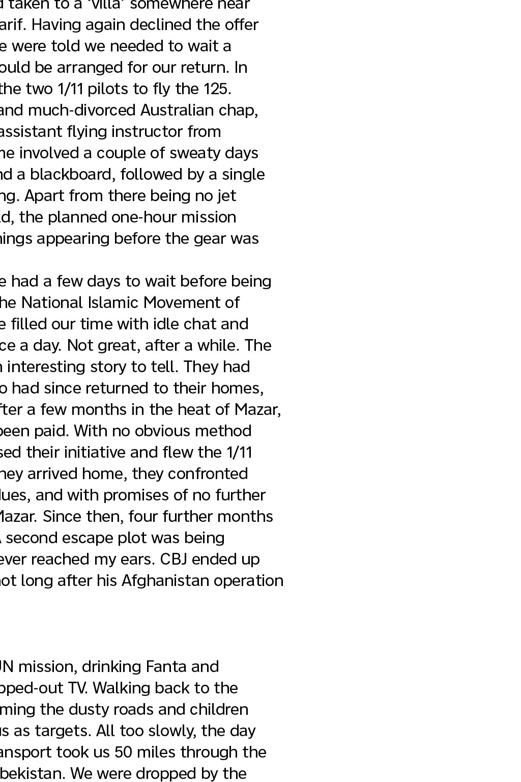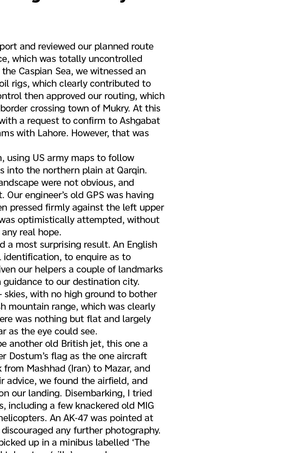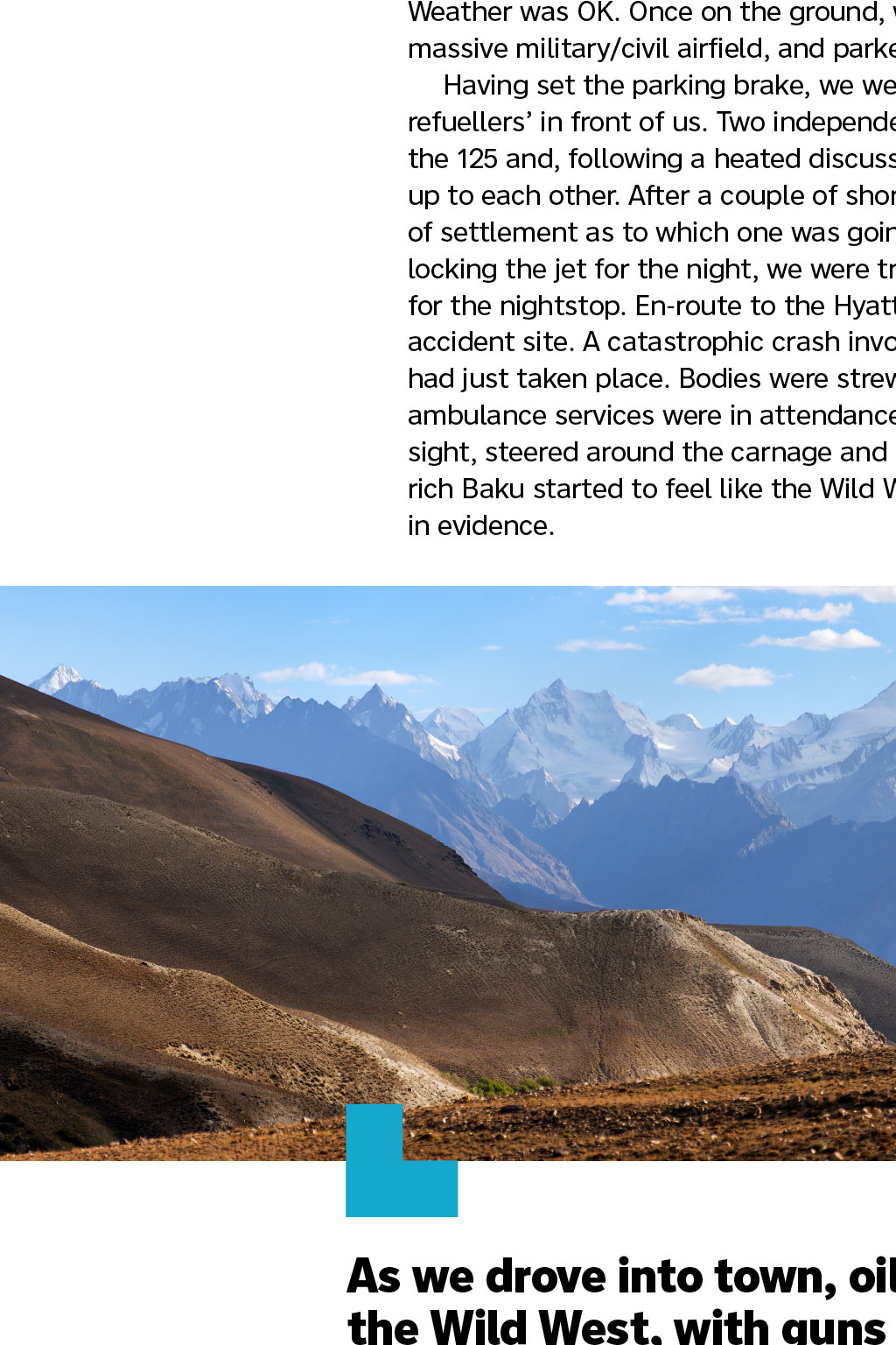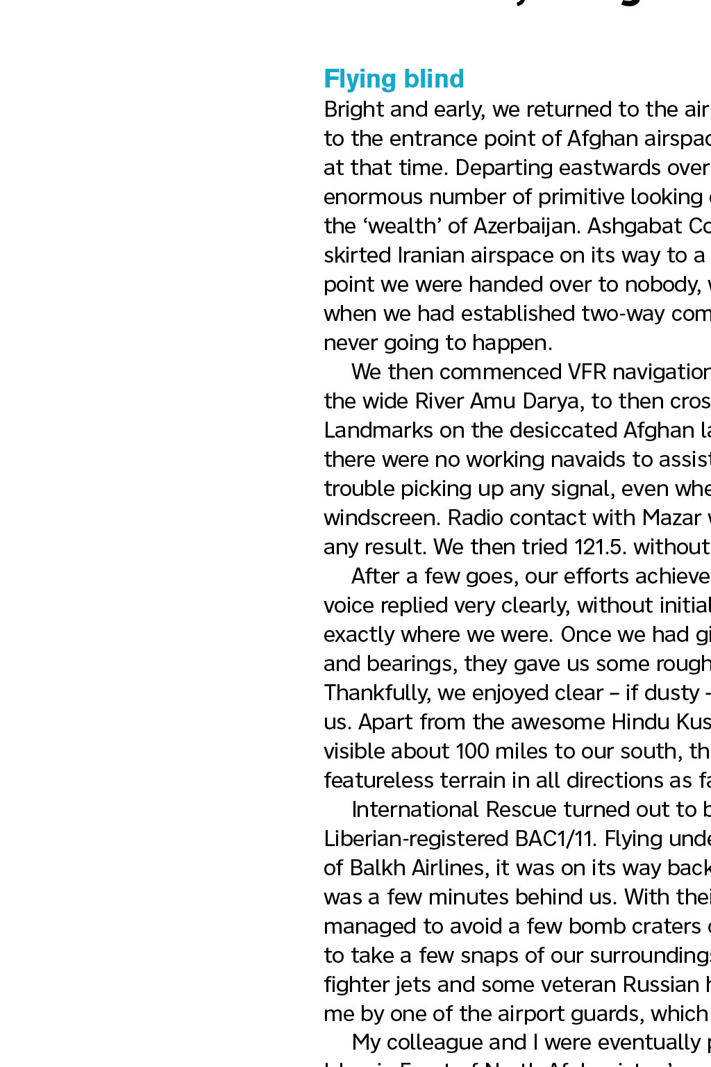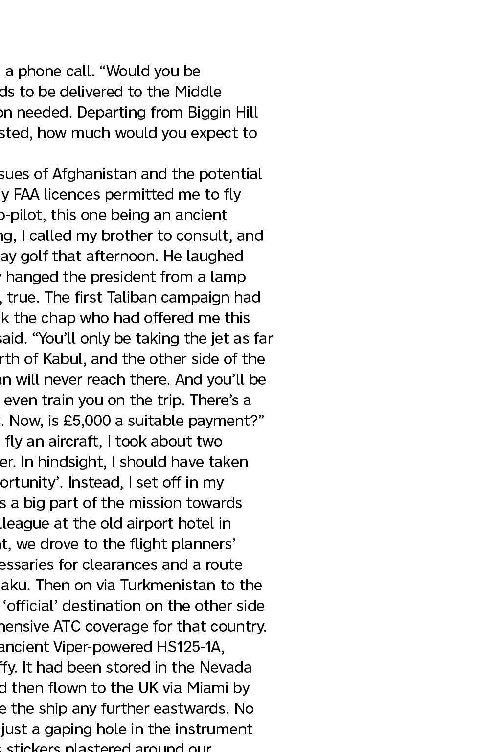 LIFE OF A PILOT A convert mission to Afghanistan was an unusual and risky way to gain hours No way to build hours By David Keen, Log Board member Mazar-i-Sharif Afghanistan: the magnificent Blue Mosque magine my plight. No flying job, with seemingly no opportunities. Im 44-years-old, 400 flying hours, mostly on light singles, and an unused but once-renewed CPL/IR, nearly two years old. Out of the blue, one Wednesday morning, the phone rings with a tempting but daunting offer. Lets jump back to the beginning. At 18, I was accepted at the prestigious Hamble College of Air Training, in Hampshire. Having started the sponsored course, the end point was becoming a second officer at either BEA or BOAC, now BA of course. Nine months in, I decided flying was not for me, despite doing OK on the course. My decision was that of an immature young school leaver, one who had been made to feel intimidated and inadequate by a bully of an instructor. Regret set in almost immediately a career in airline flying had been my childhood dream. University followed, then a successful 18-year career in pharmaceutical marketing, taking me from London to Basel, Switzerland, Philadelphia, Paris, Mannheim, and finally Greenwich, Connecticut. Starting a family was less successful, ending in divorce and the return of my ex-wife and two children to England, by which time I had been promoted to director level in a large and somewhat ruthless French/American multinational. During those years, my dream of flying never left me. Two years of a quiet social life, assiduous saving and a decent tax-free pay-off allowed me to re-start training, while honouring payments for my childrens education and the rest. Downsizing meant living in a virtual squat not far from their home back in Reading. I kicked off by gaining an FAA Muti/Single CPL/IR in three months flat in Fresno, California. Back in the UK, the more arduous BCPL/CPL/Frozen ATPL/ IR took 14 months. At that point, I was able to return to the US and gain some 30 hours of unpaid flying on a Citation 2, thanks to my previous flying instructor. But upon returning to England, there was nothing further, despite sending out hundreds of copies of my CV and making numerous phone calls. I was getting ready to go back to pharmaceuticals at a much lower level now; the money was running out. The real story Now heres where the story starts, with a phone call. Would you be interested in flying a small jet that needs to be delivered to the Middle East? Afghanistan in fact. Quick decision needed. Departing from Biggin Hill tomorrow morning. And if youre interested, how much would you expect to be paid? I should have smelt a rat with the issues of Afghanistan and the potential blank cheque. I was legal, given that my FAA licences permitted me to fly any American-registered aircraft as a co-pilot, this one being an ancient Viper-powered HS125-1A. Before agreeing, I called my brother to consult, and also to advise of my unavailability to play golf that afternoon. He laughed his socks off. Afghanistan mate, they hanged the president from a lamp post there yesterday! This was, in fact, true. The first Taliban campaign had recently started in earnest. I called back the chap who had offered me this special opportunity. No worries, he said. Youll only be taking the jet as far as Mazar-i-Sharif, hundreds of miles north of Kabul, and the other side of the Hindu Kush mountain range. The Taliban will never reach there. And youll be flying with a HS125 IRE/TRE who might even train you on the trip. Theres a job waiting for you there, if you fancy it. Now, is 5,000 a suitable payment? Having never been offered a bean to fly an aircraft, I took about two minutes to consider and accept the offer. In hindsight, I should have taken two days, long enough to lose the opportunity. Instead, I set off in my old LH-drive Rover 420 (cost saving was a big part of the mission towards pilothood) and met up with my new colleague at the old airport hotel in Croydon. After dinner and an early night, we drove to the flight planners offices near LGW and acquired the necessaries for clearances and a route taking us via stops in Vienna, Ankara, Baku. Then on via Turkmenistan to the Afghan border and VFR onwards to our official destination on the other side of Afghanistan, there being no comprehensive ATC coverage for that country. Back at Biggin Hill, we boarded the ancient Viper-powered HS125-1A, N1230B, which was looking rather scruffy. It had been stored in the Nevada desert for a while, re-commissioned and then flown to the UK via Miami by a crew who were most reluctant to take the ship any further eastwards. No VSI was present on my side, as I recall, just a gaping hole in the instrument panel. There were quite a few other u/s stickers plastered around our workplace. Two passengers awaited, a young, up-and-coming Afghan warlord who was making his way to deal with the Taliban, from his studies in the USA, along with a young British ground engineer who was to accompany the aircraft on its delivery to its new owner, a most fearsome gentleman by reputation, one General Rashid Al Dostum. This man, I later discovered, was subsequently reputed to have the bloodiest hands in Afghanistan. (He then became Vice-President of Afghanistan, courtesy of the USA, until the Taliban again intervened.) Dostum required a personal transport to carry him between Mazar and his military base at Shebherghan, along with taking him on his business trips to his native Uzbekistan, as well as to other hotspots in Iran and Pakistan. Off and away Although we planned to depart around 1300 GMT, we first needed to await a hefty consignment of Johnnie Walker Blue Label Whisky. Two green Harrods vans duly rolled up, and the cargo was loaded. Apparently, the general was a fan of the stuff, and although not a big tourist, he had once ventured as far as Scotland to explore one or two distilleries. Our cargo of whisky was intended as an incentive or reward for 
