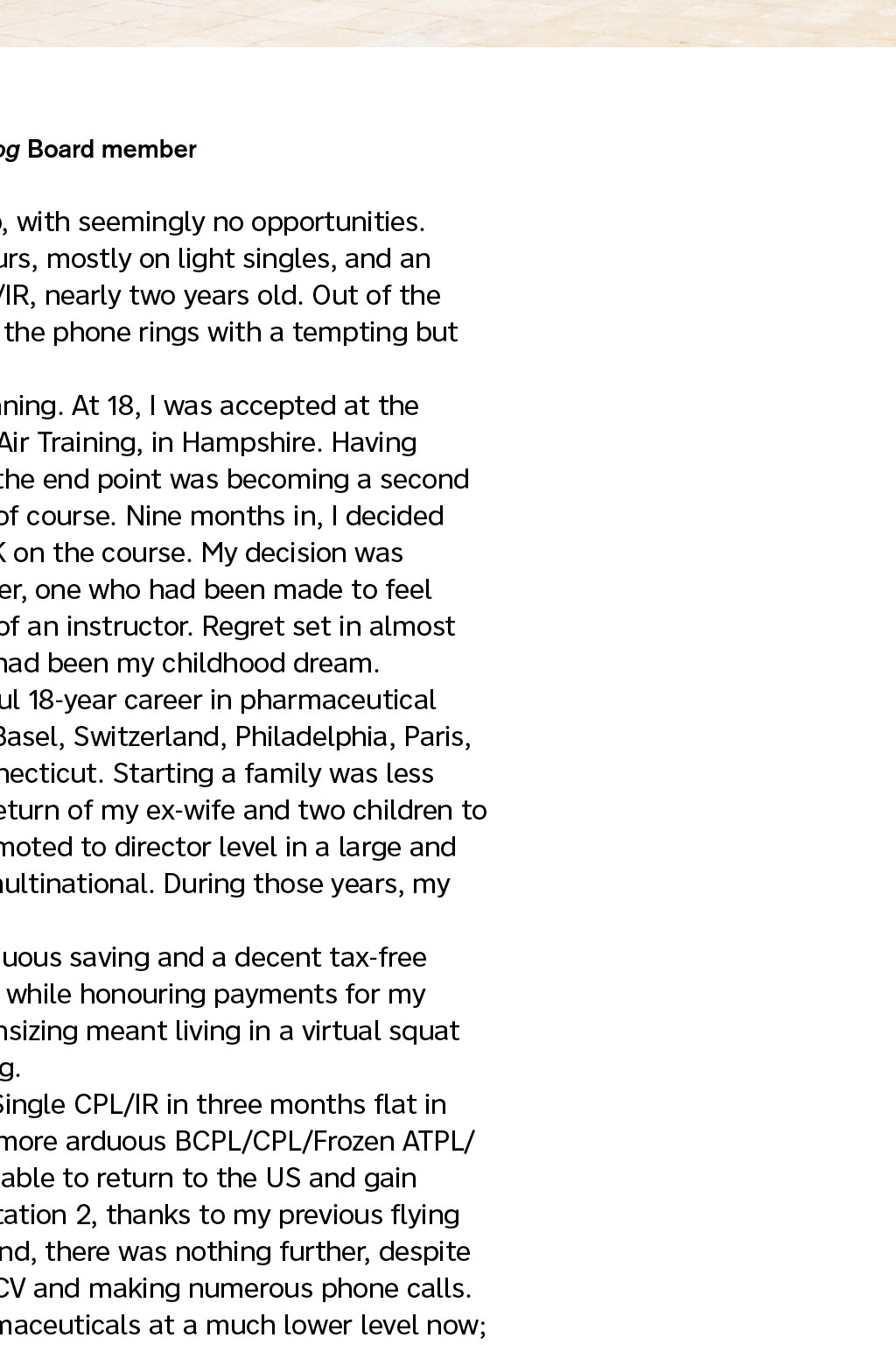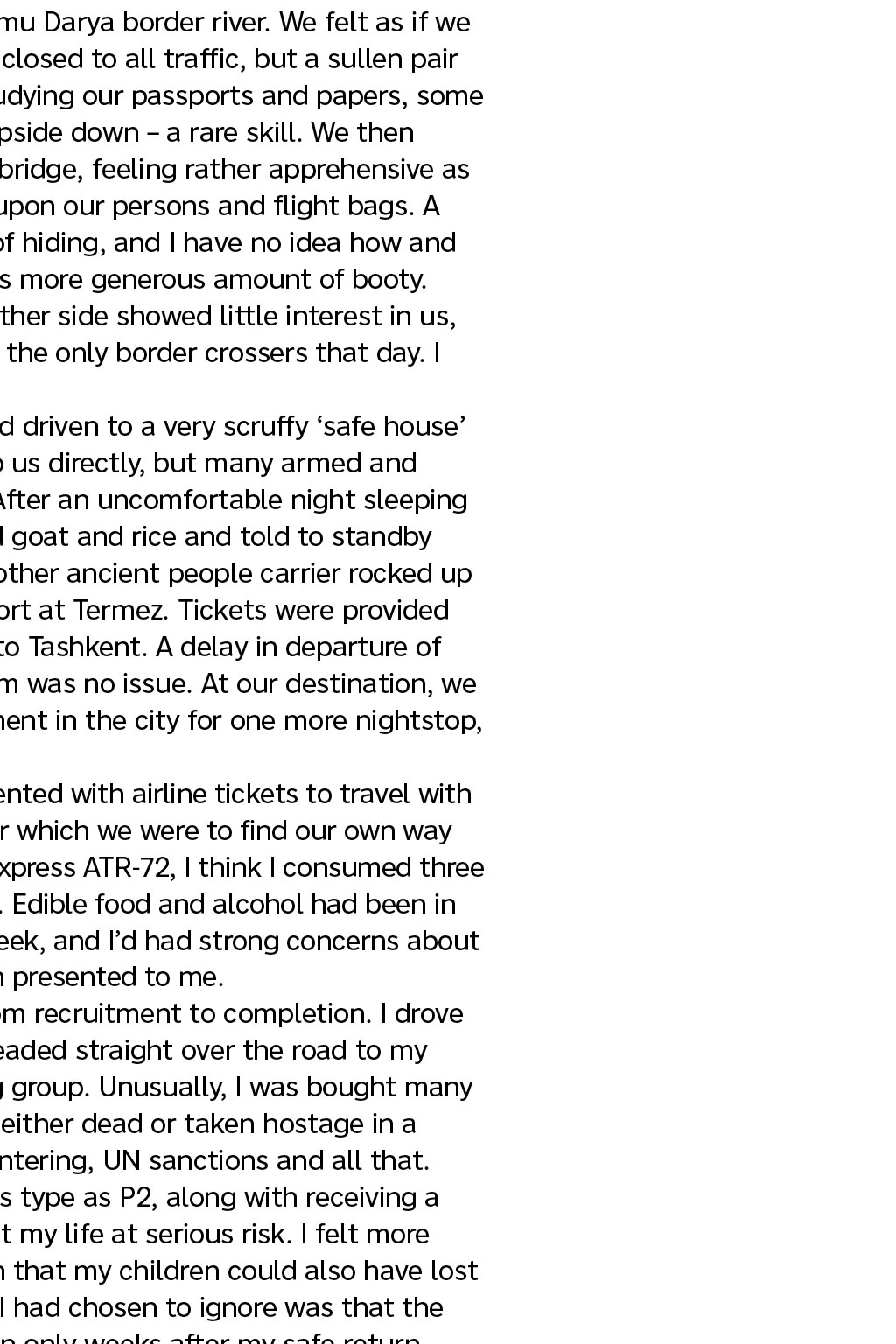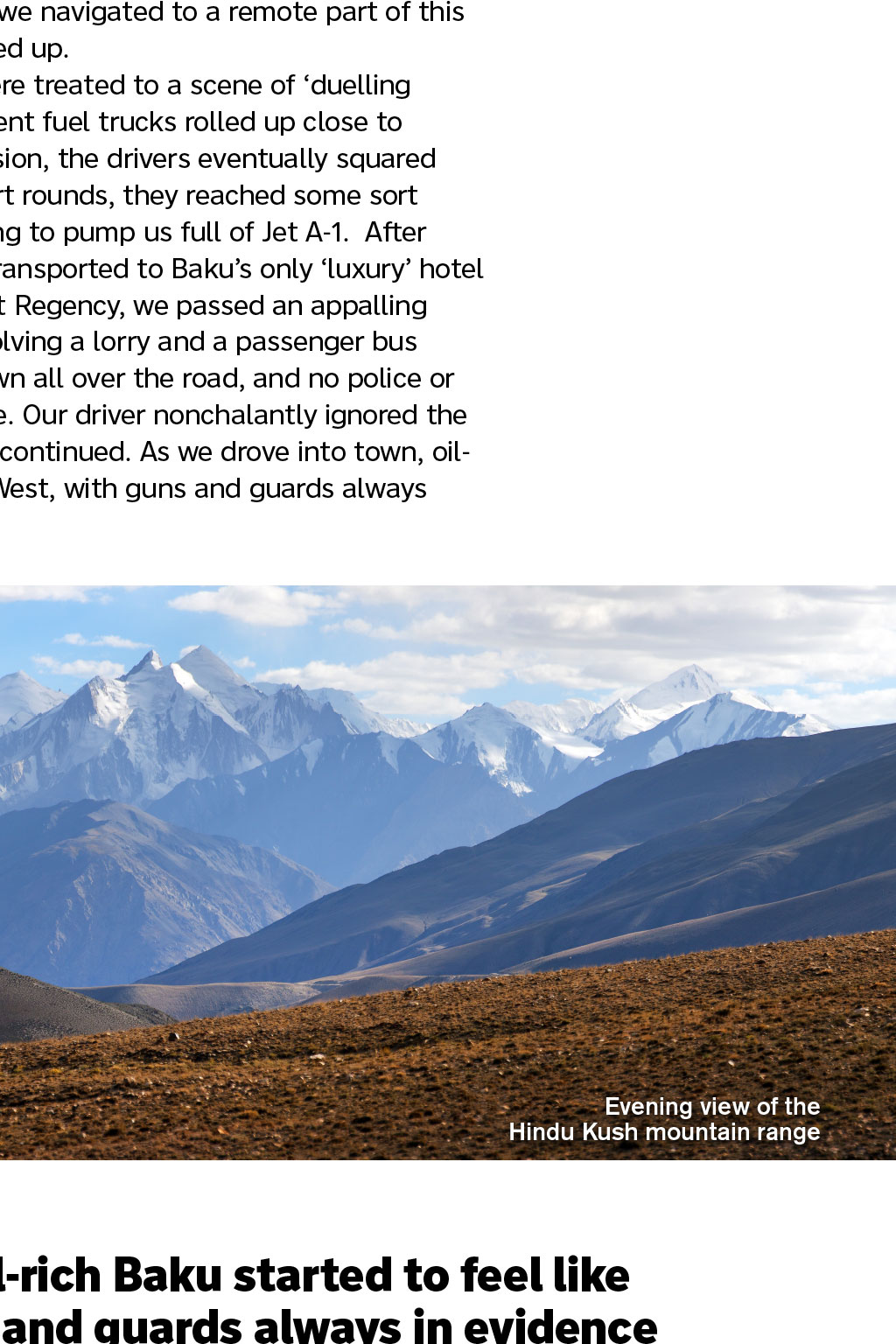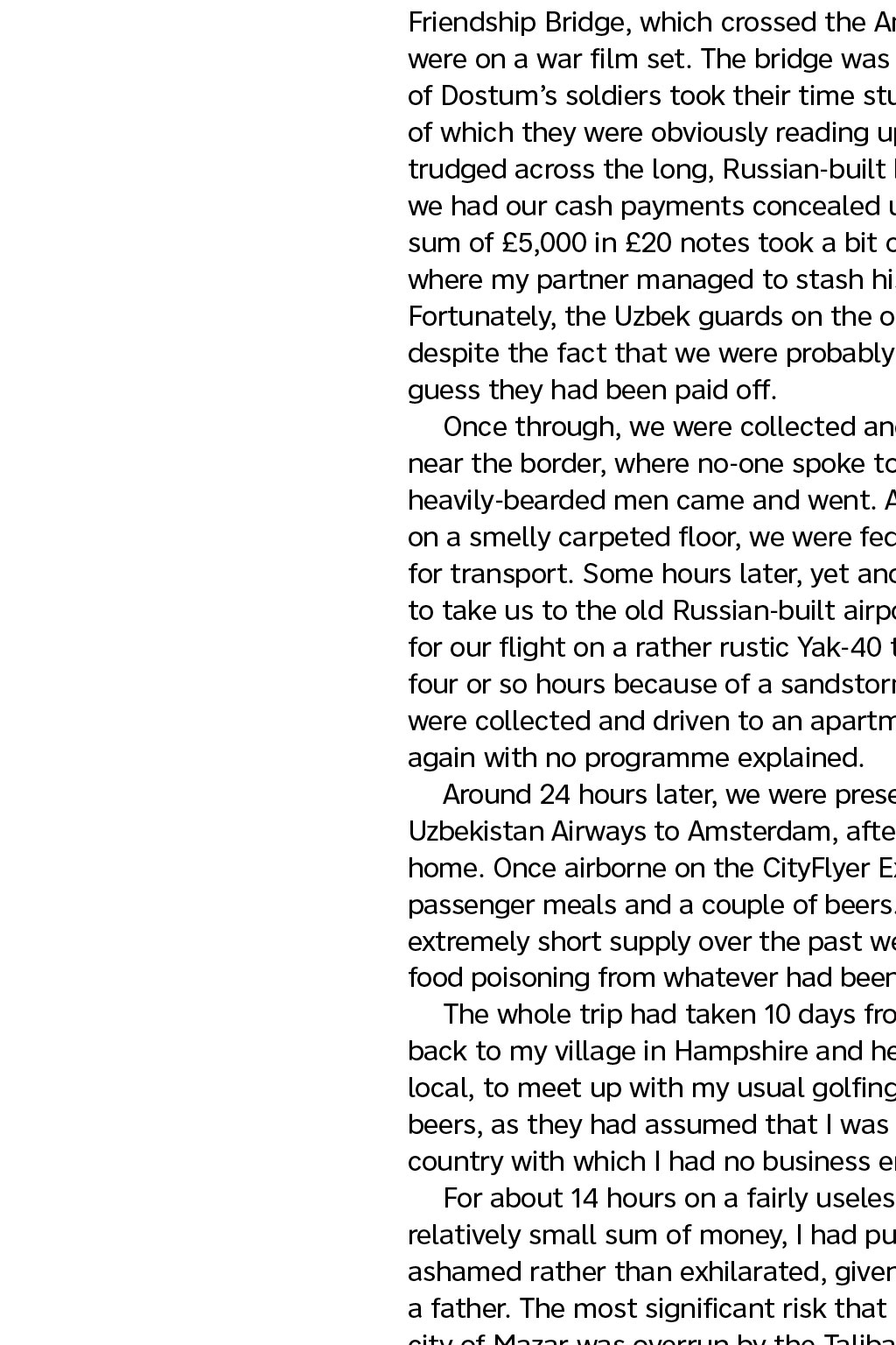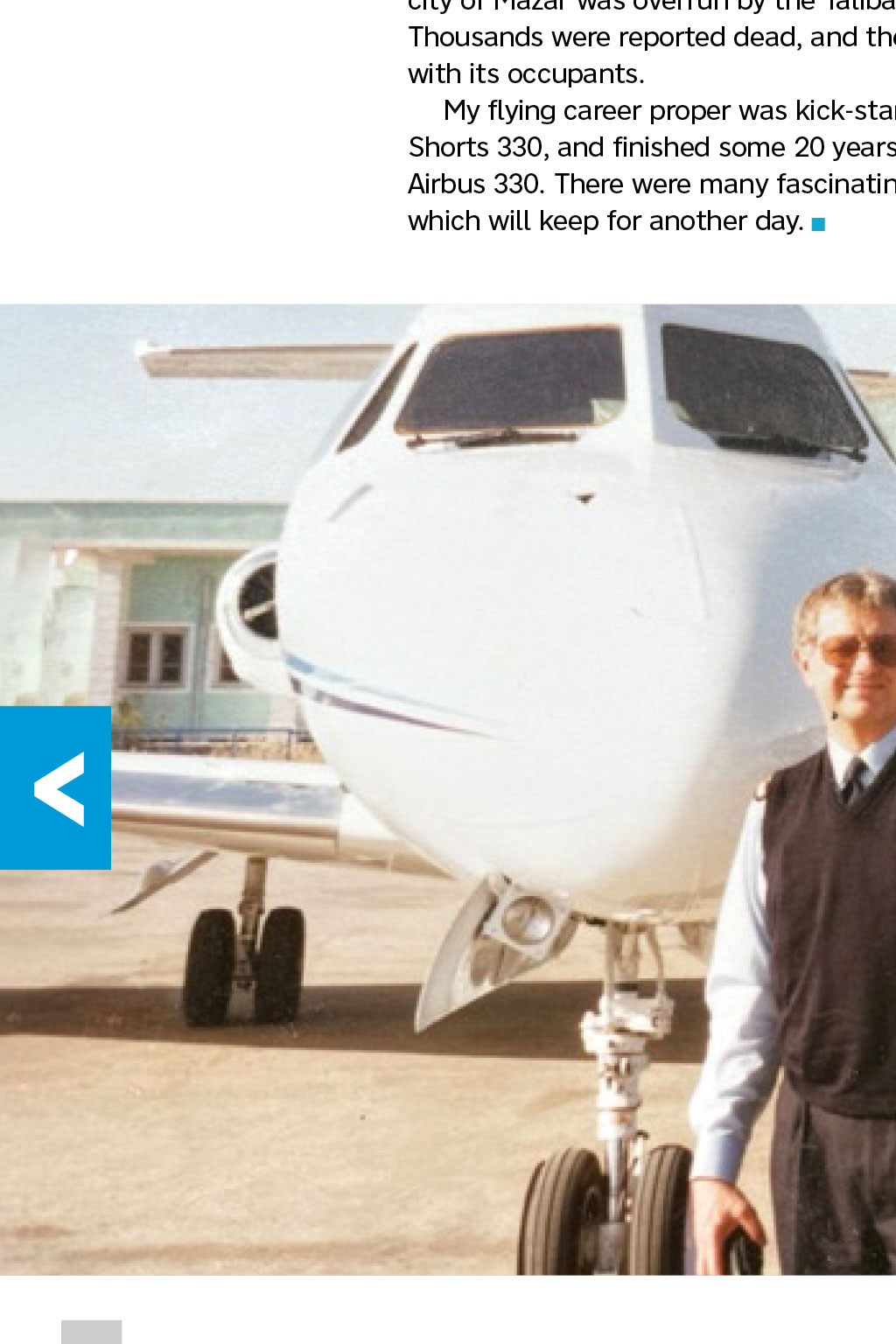 LIFE OF A PILOT A convert mission to Afghanistan was an unusual and risky way to gain hours No way to build hours By David Keen, Log Board member Mazar-i-Sharif Afghanistan: the magnificent Blue Mosque magine my plight. No flying job, with seemingly no opportunities. Im 44-years-old, 400 flying hours, mostly on light singles, and an unused but once-renewed CPL/IR, nearly two years old. Out of the blue, one Wednesday morning, the phone rings with a tempting but daunting offer. Lets jump back to the beginning. At 18, I was accepted at the prestigious Hamble College of Air Training, in Hampshire. Having started the sponsored course, the end point was becoming a second officer at either BEA or BOAC, now BA of course. Nine months in, I decided flying was not for me, despite doing OK on the course. My decision was that of an immature young school leaver, one who had been made to feel intimidated and inadequate by a bully of an instructor. Regret set in almost immediately a career in airline flying had been my childhood dream. University followed, then a successful 18-year career in pharmaceutical marketing, taking me from London to Basel, Switzerland, Philadelphia, Paris, Mannheim, and finally Greenwich, Connecticut. Starting a family was less successful, ending in divorce and the return of my ex-wife and two children to England, by which time I had been promoted to director level in a large and somewhat ruthless French/American multinational. During those years, my dream of flying never left me. Two years of a quiet social life, assiduous saving and a decent tax-free pay-off allowed me to re-start training, while honouring payments for my childrens education and the rest. Downsizing meant living in a virtual squat not far from their home back in Reading. I kicked off by gaining an FAA Muti/Single CPL/IR in three months flat in Fresno, California. Back in the UK, the more arduous BCPL/CPL/Frozen ATPL/ IR took 14 months. At that point, I was able to return to the US and gain some 30 hours of unpaid flying on a Citation 2, thanks to my previous flying instructor. But upon returning to England, there was nothing further, despite sending out hundreds of copies of my CV and making numerous phone calls. I was getting ready to go back to pharmaceuticals at a much lower level now; the money was running out. The real story Now heres where the story starts, with a phone call. Would you be interested in flying a small jet that needs to be delivered to the Middle East? Afghanistan in fact. Quick decision needed. Departing from Biggin Hill tomorrow morning. And if youre interested, how much would you expect to be paid? I should have smelt a rat with the issues of Afghanistan and the potential blank cheque. I was legal, given that my FAA licences permitted me to fly any American-registered aircraft as a co-pilot, this one being an ancient Viper-powered HS125-1A. Before agreeing, I called my brother to consult, and also to advise of my unavailability to play golf that afternoon. He laughed his socks off. Afghanistan mate, they hanged the president from a lamp post there yesterday! This was, in fact, true. The first Taliban campaign had recently started in earnest. I called back the chap who had offered me this special opportunity. No worries, he said. Youll only be taking the jet as far as Mazar-i-Sharif, hundreds of miles north of Kabul, and the other side of the Hindu Kush mountain range. The Taliban will never reach there. And youll be flying with a HS125 IRE/TRE who might even train you on the trip. Theres a job waiting for you there, if you fancy it. Now, is 5,000 a suitable payment? Having never been offered a bean to fly an aircraft, I took about two minutes to consider and accept the offer. In hindsight, I should have taken two days, long enough to lose the opportunity. Instead, I set off in my old LH-drive Rover 420 (cost saving was a big part of the mission towards pilothood) and met up with my new colleague at the old airport hotel in Croydon. After dinner and an early night, we drove to the flight planners offices near LGW and acquired the necessaries for clearances and a route taking us via stops in Vienna, Ankara, Baku. Then on via Turkmenistan to the Afghan border and VFR onwards to our official destination on the other side of Afghanistan, there being no comprehensive ATC coverage for that country. Back at Biggin Hill, we boarded the ancient Viper-powered HS125-1A, N1230B, which was looking rather scruffy. It had been stored in the Nevada desert for a while, re-commissioned and then flown to the UK via Miami by a crew who were most reluctant to take the ship any further eastwards. No VSI was present on my side, as I recall, just a gaping hole in the instrument panel. There were quite a few other u/s stickers plastered around our workplace. Two passengers awaited, a young, up-and-coming Afghan warlord who was making his way to deal with the Taliban, from his studies in the USA, along with a young British ground engineer who was to accompany the aircraft on its delivery to its new owner, a most fearsome gentleman by reputation, one General Rashid Al Dostum. This man, I later discovered, was subsequently reputed to have the bloodiest hands in Afghanistan. (He then became Vice-President of Afghanistan, courtesy of the USA, until the Taliban again intervened.) Dostum required a personal transport to carry him between Mazar and his military base at Shebherghan, along with taking him on his business trips to his native Uzbekistan, as well as to other hotspots in Iran and Pakistan. Off and away Although we planned to depart around 1300 GMT, we first needed to await a hefty consignment of Johnnie Walker Blue Label Whisky. Two green Harrods vans duly rolled up, and the cargo was loaded. Apparently, the general was a fan of the stuff, and although not a big tourist, he had once ventured as far as Scotland to explore one or two distilleries. Our cargo of whisky was intended as an incentive or reward for 
