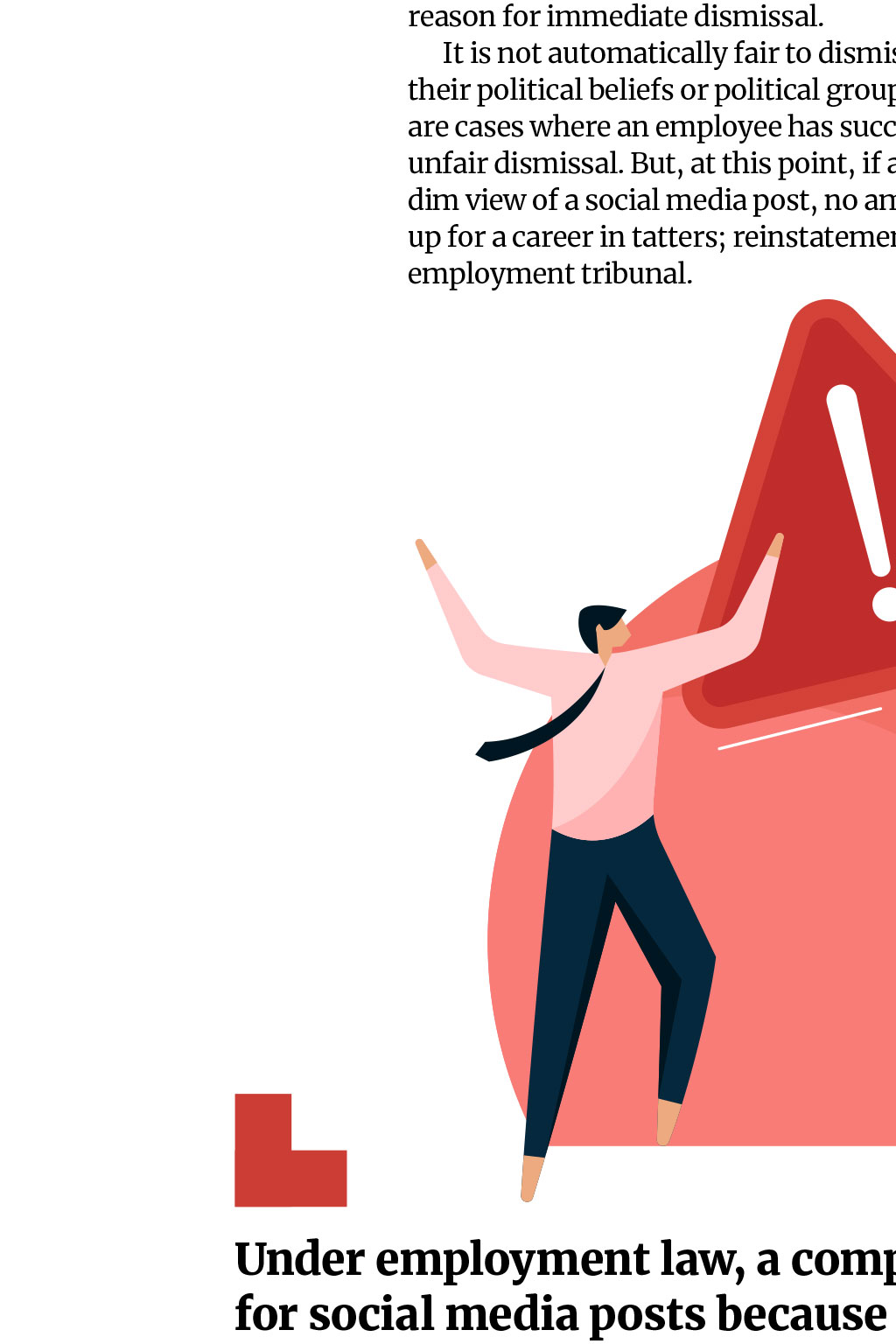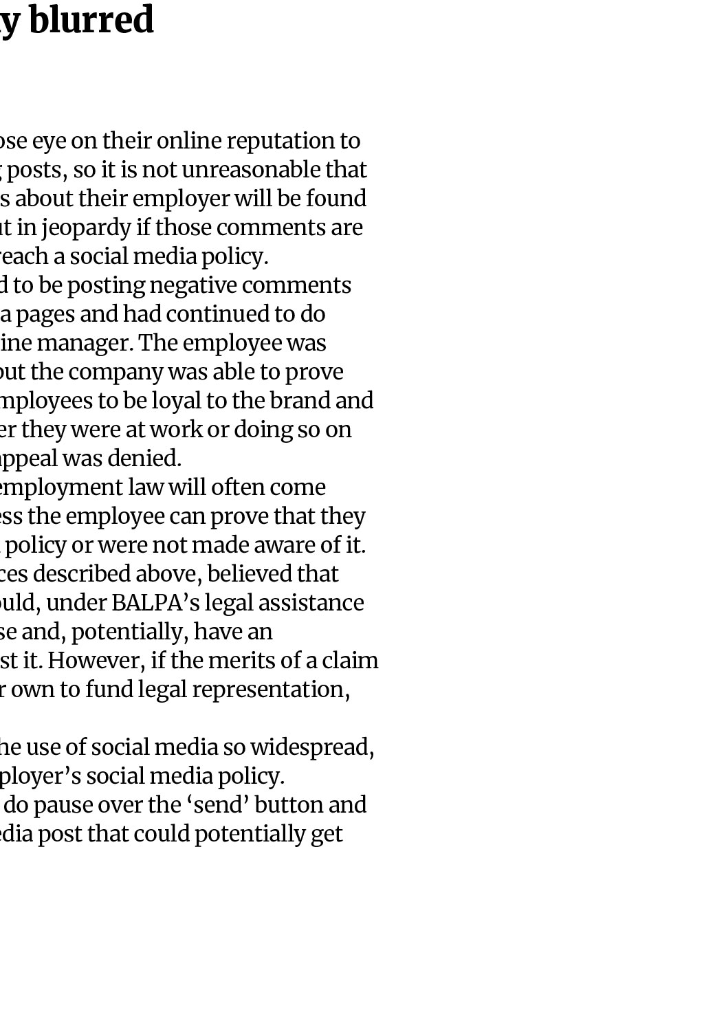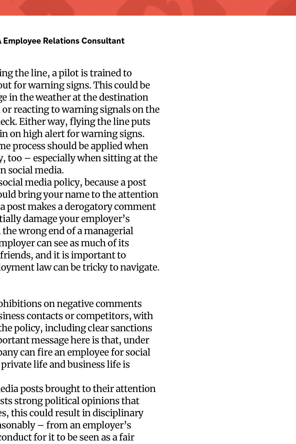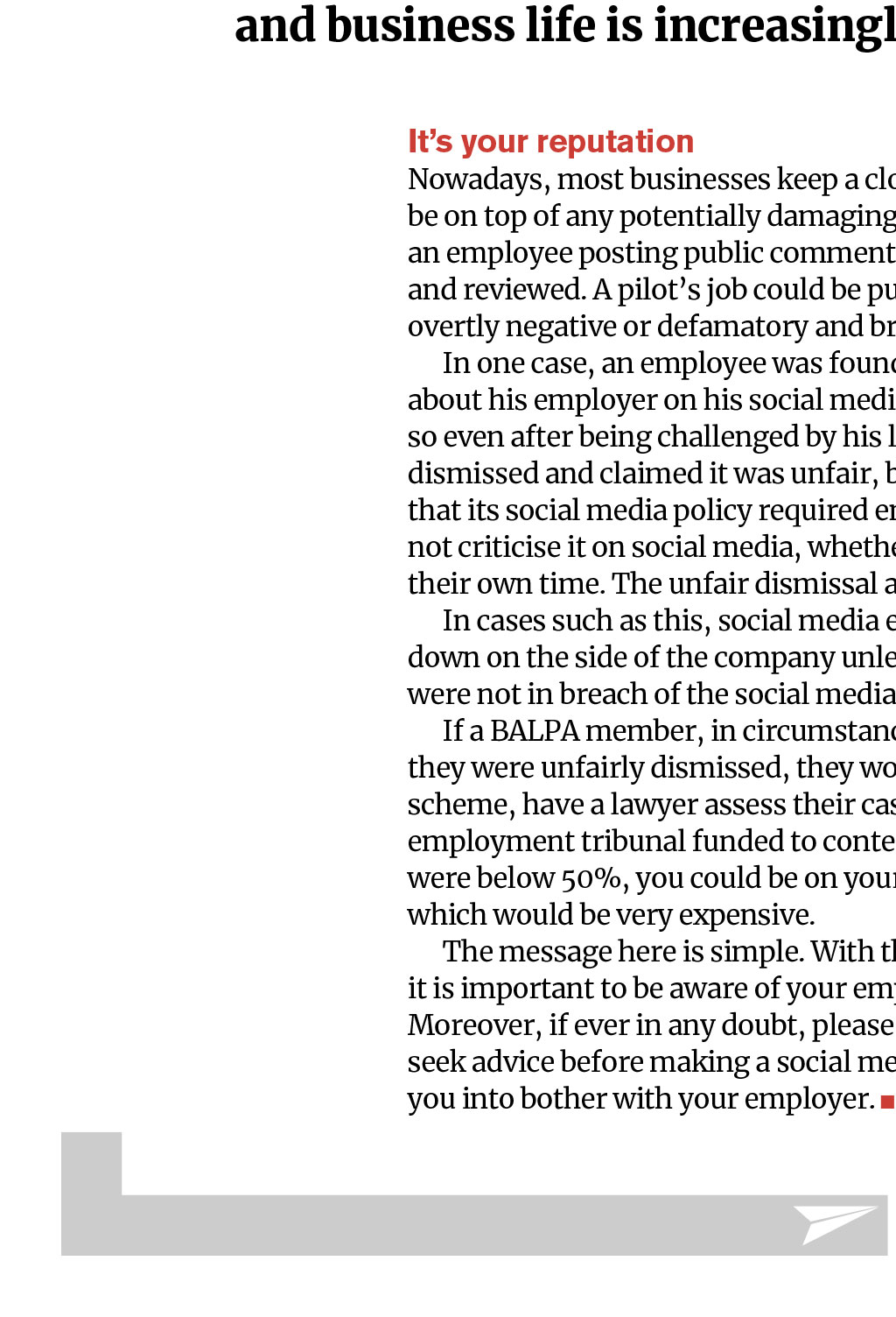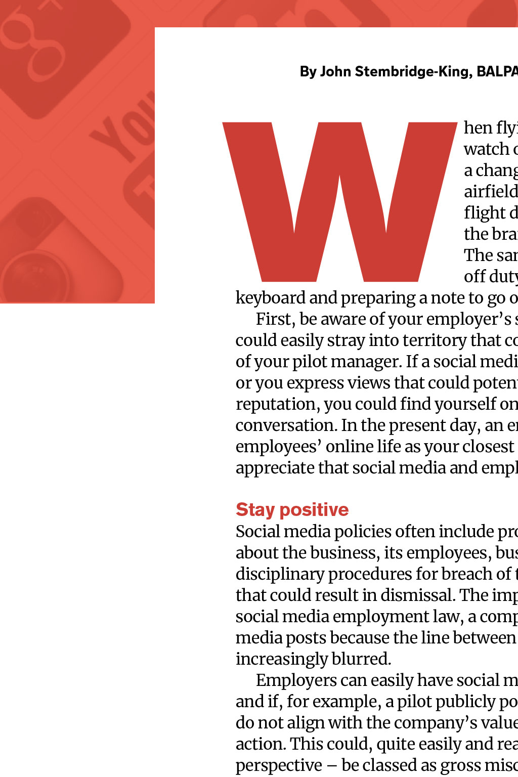 By John Stembridge-King, BALPA Employee Relations Consultant When flying the line, a pilot is trained to watch out for warning signs. This could be a change in the weather at the destination airfield or reacting to warning signals on the flight deck. Either way, flying the line puts the brain on high alert for warning signs. The same process should be applied when off duty, too especially when sitting at the keyboard and preparing a note to go on social media. First, be aware of your employers social media policy, because a post could easily stray into territory that could bring your name to the attention of your pilot manager. If a social media post makes a derogatory comment or you express views that could potentially damage your employers reputation, you could find yourself on the wrong end of a managerial conversation. In the present day, an employer can see as much of its employees online life as your closest friends, and it is important to appreciate that social media and employment law can be tricky to navigate. Stay positive Social media policies often include prohibitions on negative comments about the business, its employees, business contacts or competitors, with disciplinary procedures for breach of the policy, including clear sanctions that could result in dismissal. The important message here is that, under social media employment law, a company can fire an employee for social media posts because the line between private life and business life is increasingly blurred. Employers can easily have social media posts brought to their attention and if, for example, a pilot publicly posts strong political opinions that do not align with the companys values, this could result in disciplinary action. This could, quite easily and reasonably from an employers perspective be classed as gross misconduct for it to be seen as a fair reason for immediate dismissal. It is not automatically fair to dismiss someone because of, for example, their political beliefs or political groups to which they belong, and there are cases where an employee has successfully sued their employer for unfair dismissal. But, at this point, if an employer took a serious and dim view of a social media post, no amount of compensation could make up for a career in tatters; reinstatement is not a common remedy at an employment tribunal. Under employment law, a company can fire an employee for social media posts because the line between private and business life is increasingly blurred Its your reputation Nowadays, most businesses keep a close eye on their online reputation to be on top of any potentially damaging posts, so it is not unreasonable that an employee posting public comments about their employer will be found and reviewed. A pilots job could be put in jeopardy if those comments are overtly negative or defamatory and breach a social media policy. In one case, an employee was found to be posting negative comments about his employer on his social media pages and had continued to do so even after being challenged by his line manager. The employee was dismissed and claimed it was unfair, but the company was able to prove that its social media policy required employees to be loyal to the brand and not criticise it on social media, whether they were at work or doing so on their own time. The unfair dismissal appeal was denied. In cases such as this, social media employment law will often come down on the side of the company unless the employee can prove that they were not in breach of the social media policy or were not made aware of it. If a BALPA member, in circumstances described above, believed that they were unfairly dismissed, they would, under BALPAs legal assistance scheme, have a lawyer assess their case and, potentially, have an employment tribunal funded to contest it. However, if the merits of a claim were below 50%, you could be on your own to fund legal representation, which would be very expensive. The message here is simple. With the use of social media so widespread, it is important to be aware of your employers social media policy. Moreover, if ever in any doubt, please do pause over the send button and seek advice before making a social media post that could potentially get you into bother with your employer. SOCIAL MEDIA The social side