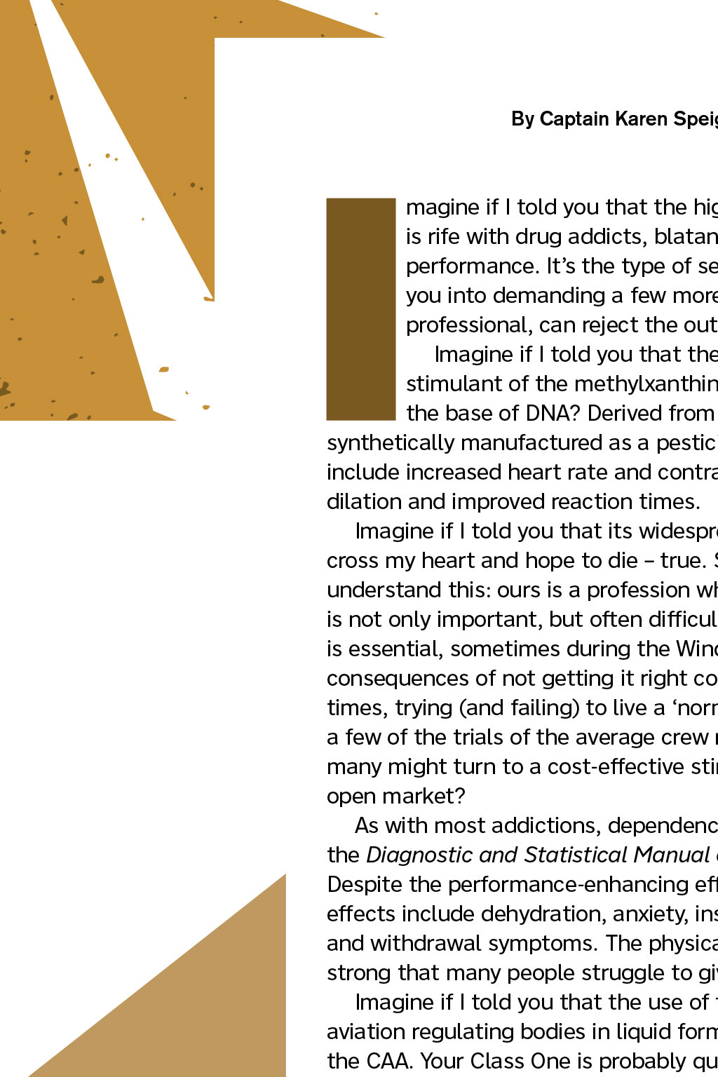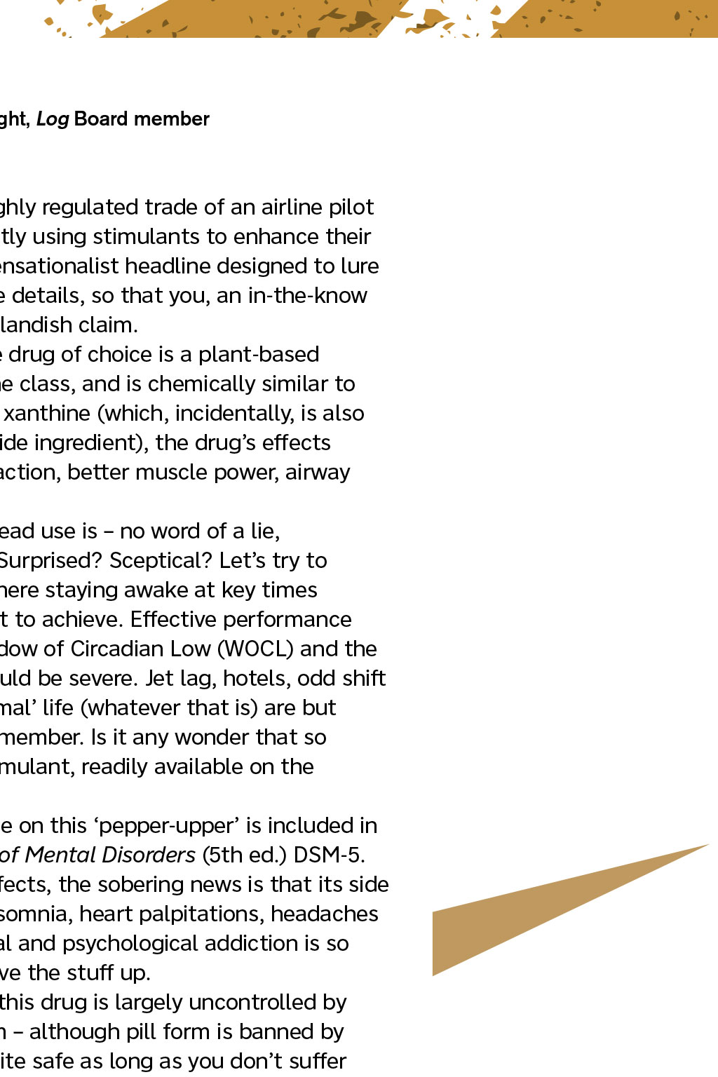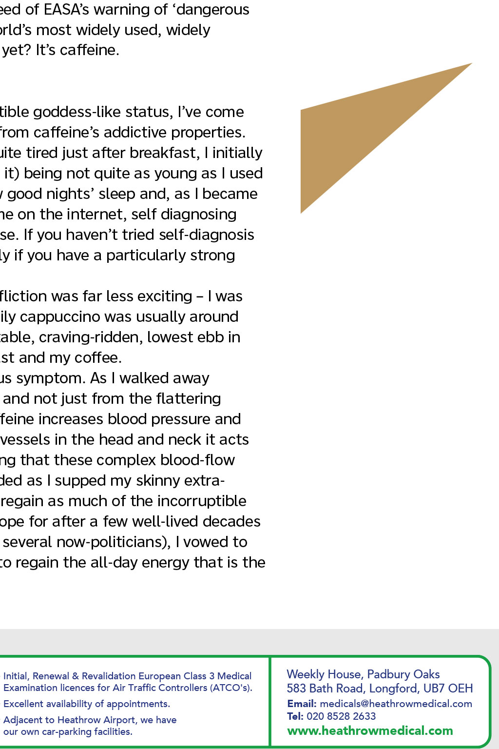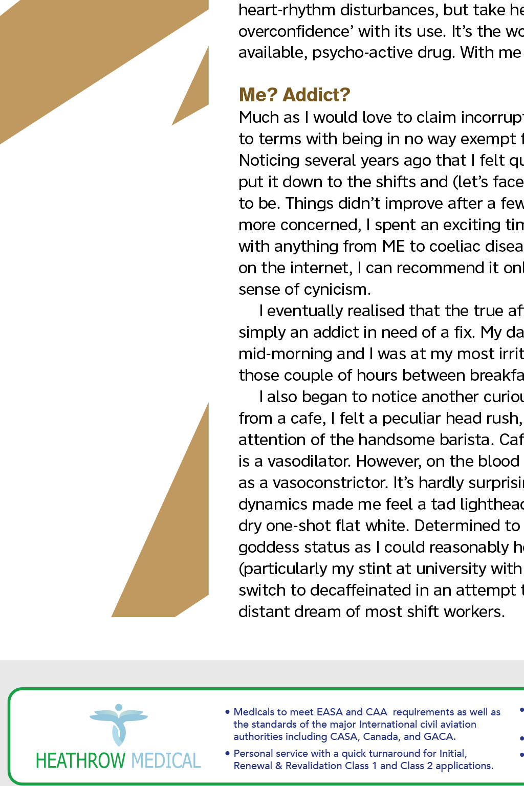 STIMULANTS Wired? Are you under the influence? By Captain Karen Speight, Log Board member magine if I told you that the highly regulated trade of an airline pilot is rife with drug addicts, blatantly using stimulants to enhance their performance. Its the type of sensationalist headline designed to lure you into demanding a few more details, so that you, an in-the-know professional, can reject the outlandish claim. Imagine if I told you that the drug of choice is a plant-based stimulant of the methylxanthine class, and is chemically similar to the base of DNA? Derived from xanthine (which, incidentally, is also synthetically manufactured as a pesticide ingredient), the drugs effects include increased heart rate and contraction, better muscle power, airway dilation and improved reaction times. Imagine if I told you that its widespread use is no word of a lie, cross my heart and hope to die true. Surprised? Sceptical? Lets try to understand this: ours is a profession where staying awake at key times is not only important, but often difficult to achieve. Effective performance is essential, sometimes during the Window of Circadian Low (WOCL) and the consequences of not getting it right could be severe. Jet lag, hotels, odd shift times, trying (and failing) to live a normal life (whatever that is) are but a few of the trials of the average crew member. Is it any wonder that so many might turn to a cost-effective stimulant, readily available on the open market? As with most addictions, dependence on this pepper-upper is included in the Diagnostic and Statistical Manual of Mental Disorders (5th ed.) DSM-5. Despite the performance-enhancing effects, the sobering news is that its side effects include dehydration, anxiety, insomnia, heart palpitations, headaches and withdrawal symptoms. The physical and psychological addiction is so strong that many people struggle to give the stuff up. Imagine if I told you that the use of this drug is largely uncontrolled by aviation regulating bodies in liquid form although pill form is banned by the CAA. Your Class One is probably quite safe as long as you dont suffer heart-rhythm disturbances, but take heed of EASAs warning of dangerous overconfidence with its use. Its the worlds most widely used, widely available, psycho-active drug. With me yet? Its caffeine. Me? Addict? Much as I would love to claim incorruptible goddess-like status, Ive come to terms with being in no way exempt from caffeines addictive properties. Noticing several years ago that I felt quite tired just after breakfast, I initially put it down to the shifts and (lets face it) being not quite as young as I used to be. Things didnt improve after a few good nights sleep and, as I became more concerned, I spent an exciting time on the internet, self diagnosing with anything from ME to coeliac disease. If you havent tried self-diagnosis on the internet, I can recommend it only if you have a particularly strong sense of cynicism. I eventually realised that the true affliction was far less exciting I was simply an addict in need of a fix. My daily cappuccino was usually around mid-morning and I was at my most irritable, craving-ridden, lowest ebb in those couple of hours between breakfast and my coffee. I also began to notice another curious symptom. As I walked away from a cafe, I felt a peculiar head rush, and not just from the flattering attention of the handsome barista. Caffeine increases blood pressure and is a vasodilator. However, on the blood vessels in the head and neck it acts as a vasoconstrictor. Its hardly surprising that these complex blood-flow dynamics made me feel a tad lightheaded as I supped my skinny extradry one-shot flat white. Determined to regain as much of the incorruptible goddess status as I could reasonably hope for after a few well-lived decades (particularly my stint at university with several now-politicians), I vowed to switch to decaffeinated in an attempt to regain the all-day energy that is the distant dream of most shift workers. Examination licences for Air Trafc Controllers (ATCO s). Weekly House, Padbury Oaks 583 Bath Road, Longford, UB7 OEH our own car-parking facilities. www.heathrowmedical.com Medicals to meet EASA and CAA requirements as well as Initial, Renewal & Revalidation European Class 3 Medical Personal service with a quick turnaround for Initial, Excellent availability of appointments. Adjacent to Heathrow Airport, we have the standards of the major International civil aviation authorities including CASA, Canada, and GACA. Renewal & Revalidation Class 1 and Class 2 applications. Your body is tricked into ignoring signals that you are tired and your already depleted battery is pushed hard for more juice Science-y bit If you fancy cutting down, you may want to silence your inner picket line of resistance with the wot it does to you science-y bit. Its quite an eye-opener. The longer you are awake, the more a neurotransmitter called adenosine builds up. This makes you feel drowsy when it binds to receptors in the brain. You feel tired and, eventually (hopefully not during approach to a major international airport) fall asleep. Caffeine has a sneaky little trick up its sleeve though it blocks the adenosine receptors so they cant send the message about you being tired. This stimulates various other centres in your central nervous system, which affect your heart, breathing and blood flow. Some of the brains own natural stimulants start to work more effectively eg. dopamine (the feelgood neurotransmitter). Adrenaline is also secreted as a result, and your body switches into a wired, ready-for-action state. Sadly, the story doesnt end there on the heady high of chemicals. Your brain is clever it adapts. Cells start growing more adenosine receptors and fewer adrenaline receptors, to maintain the status quo. So now, to get that lovely buzzy alive feeling from your morning espresso, you need two cups. In fact, just to feel normal, you need your standard fix.