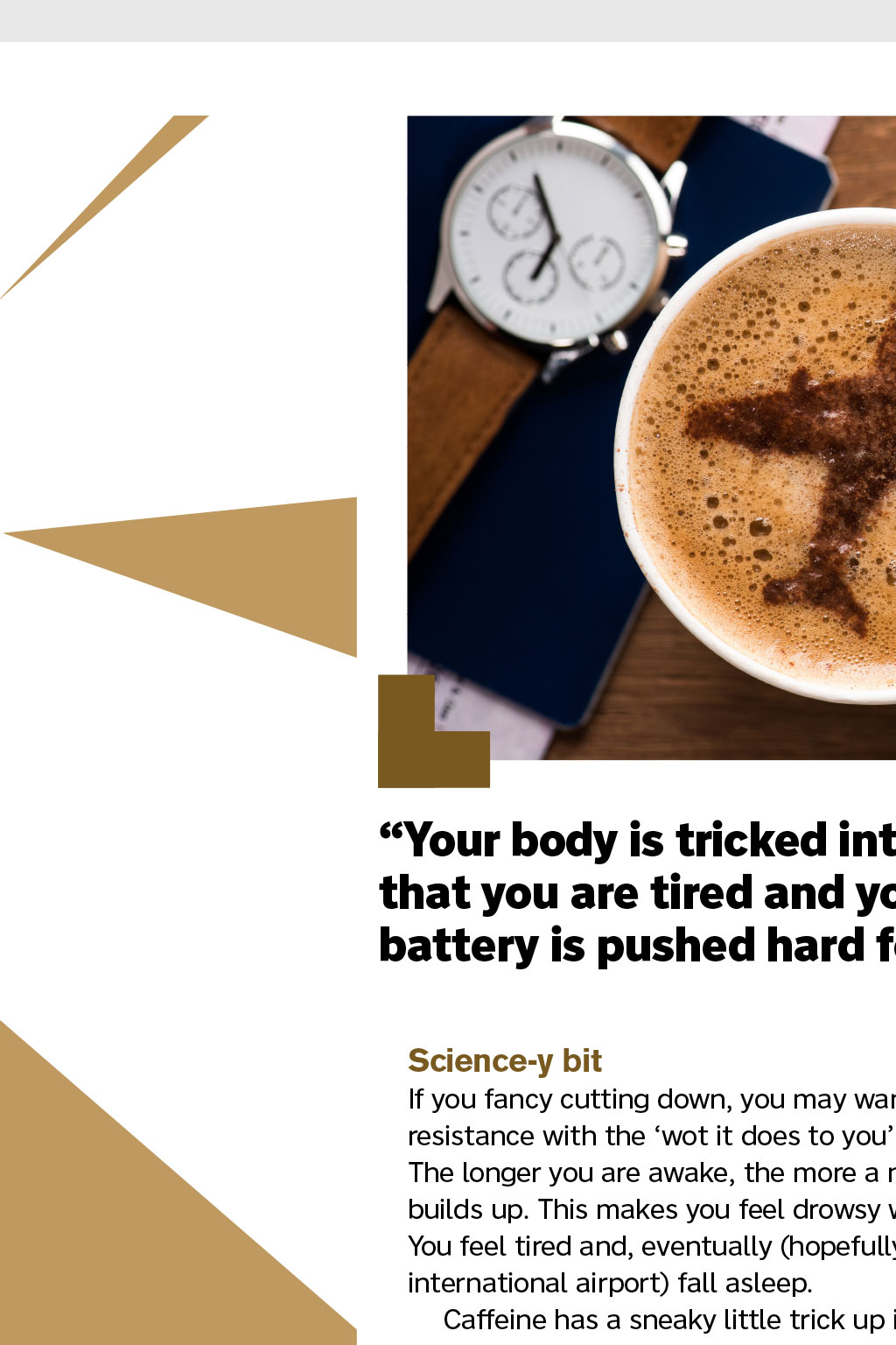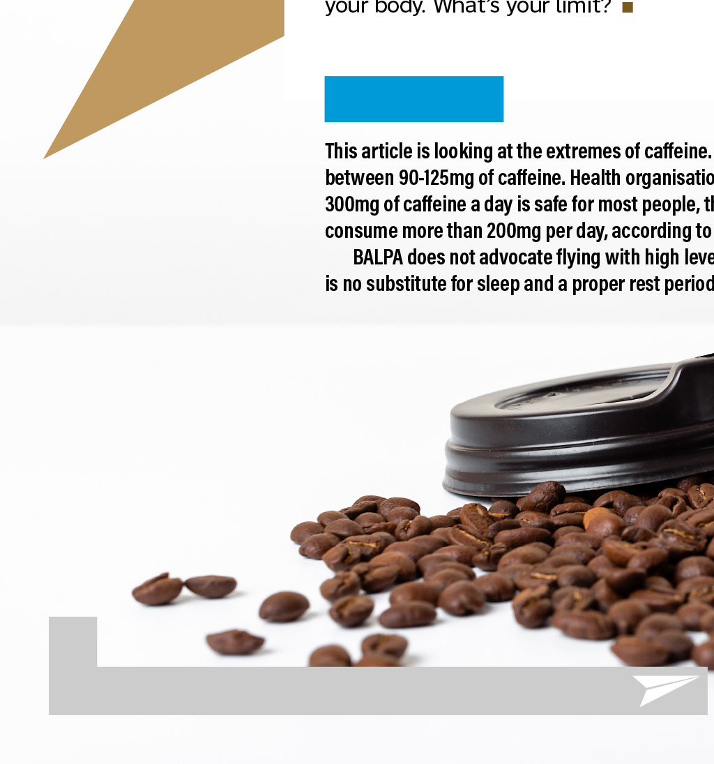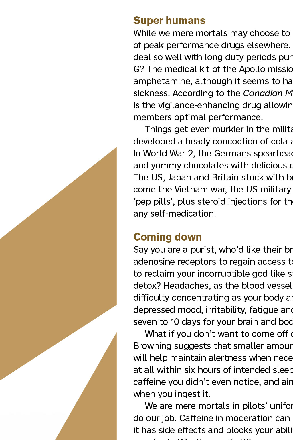 STIMULANTS Wired? Are you under the influence? By Captain Karen Speight, Log Board member magine if I told you that the highly regulated trade of an airline pilot is rife with drug addicts, blatantly using stimulants to enhance their performance. Its the type of sensationalist headline designed to lure you into demanding a few more details, so that you, an in-the-know professional, can reject the outlandish claim. Imagine if I told you that the drug of choice is a plant-based stimulant of the methylxanthine class, and is chemically similar to the base of DNA? Derived from xanthine (which, incidentally, is also synthetically manufactured as a pesticide ingredient), the drugs effects include increased heart rate and contraction, better muscle power, airway dilation and improved reaction times. Imagine if I told you that its widespread use is no word of a lie, cross my heart and hope to die true. Surprised? Sceptical? Lets try to understand this: ours is a profession where staying awake at key times is not only important, but often difficult to achieve. Effective performance is essential, sometimes during the Window of Circadian Low (WOCL) and the consequences of not getting it right could be severe. Jet lag, hotels, odd shift times, trying (and failing) to live a normal life (whatever that is) are but a few of the trials of the average crew member. Is it any wonder that so many might turn to a cost-effective stimulant, readily available on the open market? As with most addictions, dependence on this pepper-upper is included in the Diagnostic and Statistical Manual of Mental Disorders (5th ed.) DSM-5. Despite the performance-enhancing effects, the sobering news is that its side effects include dehydration, anxiety, insomnia, heart palpitations, headaches and withdrawal symptoms. The physical and psychological addiction is so strong that many people struggle to give the stuff up. Imagine if I told you that the use of this drug is largely uncontrolled by aviation regulating bodies in liquid form although pill form is banned by the CAA. Your Class One is probably quite safe as long as you dont suffer heart-rhythm disturbances, but take heed of EASAs warning of dangerous overconfidence with its use. Its the worlds most widely used, widely available, psycho-active drug. With me yet? Its caffeine. Me? Addict? Much as I would love to claim incorruptible goddess-like status, Ive come to terms with being in no way exempt from caffeines addictive properties. Noticing several years ago that I felt quite tired just after breakfast, I initially put it down to the shifts and (lets face it) being not quite as young as I used to be. Things didnt improve after a few good nights sleep and, as I became more concerned, I spent an exciting time on the internet, self diagnosing with anything from ME to coeliac disease. If you havent tried self-diagnosis on the internet, I can recommend it only if you have a particularly strong sense of cynicism. I eventually realised that the true affliction was far less exciting I was simply an addict in need of a fix. My daily cappuccino was usually around mid-morning and I was at my most irritable, craving-ridden, lowest ebb in those couple of hours between breakfast and my coffee. I also began to notice another curious symptom. As I walked away from a cafe, I felt a peculiar head rush, and not just from the flattering attention of the handsome barista. Caffeine increases blood pressure and is a vasodilator. However, on the blood vessels in the head and neck it acts as a vasoconstrictor. Its hardly surprising that these complex blood-flow dynamics made me feel a tad lightheaded as I supped my skinny extradry one-shot flat white. Determined to regain as much of the incorruptible goddess status as I could reasonably hope for after a few well-lived decades (particularly my stint at university with several now-politicians), I vowed to switch to decaffeinated in an attempt to regain the all-day energy that is the distant dream of most shift workers. Examination licences for Air Trafc Controllers (ATCO s). Weekly House, Padbury Oaks 583 Bath Road, Longford, UB7 OEH our own car-parking facilities. www.heathrowmedical.com Medicals to meet EASA and CAA requirements as well as Initial, Renewal & Revalidation European Class 3 Medical Personal service with a quick turnaround for Initial, Excellent availability of appointments. Adjacent to Heathrow Airport, we have the standards of the major International civil aviation authorities including CASA, Canada, and GACA. Renewal & Revalidation Class 1 and Class 2 applications. Your body is tricked into ignoring signals that you are tired and your already depleted battery is pushed hard for more juice Science-y bit If you fancy cutting down, you may want to silence your inner picket line of resistance with the wot it does to you science-y bit. Its quite an eye-opener. The longer you are awake, the more a neurotransmitter called adenosine builds up. This makes you feel drowsy when it binds to receptors in the brain. You feel tired and, eventually (hopefully not during approach to a major international airport) fall asleep. Caffeine has a sneaky little trick up its sleeve though it blocks the adenosine receptors so they cant send the message about you being tired. This stimulates various other centres in your central nervous system, which affect your heart, breathing and blood flow. Some of the brains own natural stimulants start to work more effectively eg. dopamine (the feelgood neurotransmitter). Adrenaline is also secreted as a result, and your body switches into a wired, ready-for-action state. Sadly, the story doesnt end there on the heady high of chemicals. Your brain is clever it adapts. Cells start growing more adenosine receptors and fewer adrenaline receptors, to maintain the status quo. So now, to get that lovely buzzy alive feeling from your morning espresso, you need two cups. In fact, just to feel normal, you need your standard fix.