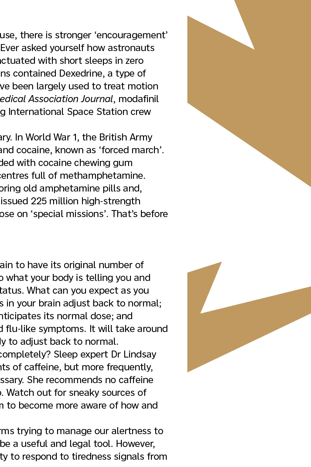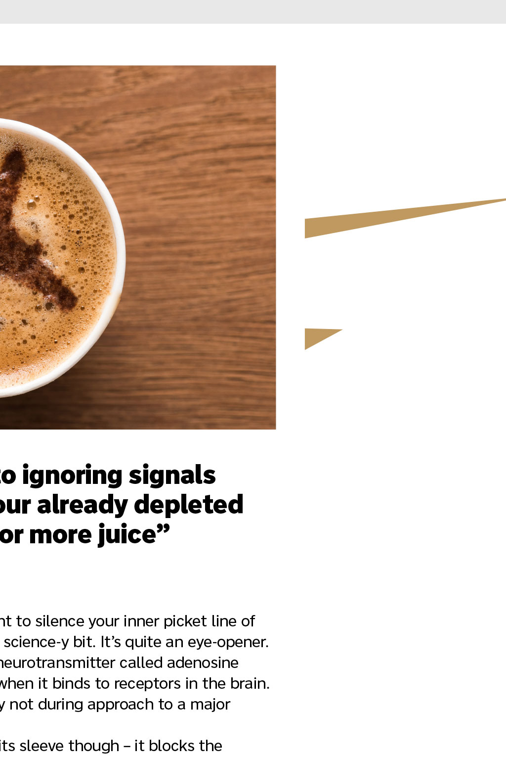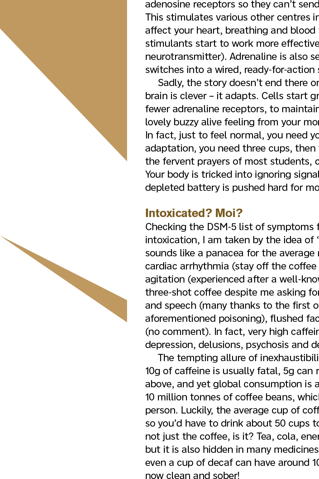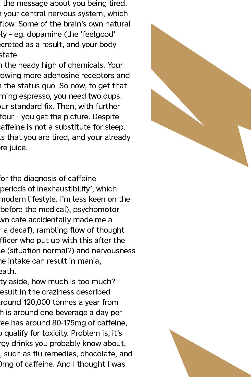 STIMULANTS Wired? Are you under the influence? By Captain Karen Speight, Log Board member magine if I told you that the highly regulated trade of an airline pilot is rife with drug addicts, blatantly using stimulants to enhance their performance. Its the type of sensationalist headline designed to lure you into demanding a few more details, so that you, an in-the-know professional, can reject the outlandish claim. Imagine if I told you that the drug of choice is a plant-based stimulant of the methylxanthine class, and is chemically similar to the base of DNA? Derived from xanthine (which, incidentally, is also synthetically manufactured as a pesticide ingredient), the drugs effects include increased heart rate and contraction, better muscle power, airway dilation and improved reaction times. Imagine if I told you that its widespread use is no word of a lie, cross my heart and hope to die true. Surprised? Sceptical? Lets try to understand this: ours is a profession where staying awake at key times is not only important, but often difficult to achieve. Effective performance is essential, sometimes during the Window of Circadian Low (WOCL) and the consequences of not getting it right could be severe. Jet lag, hotels, odd shift times, trying (and failing) to live a normal life (whatever that is) are but a few of the trials of the average crew member. Is it any wonder that so many might turn to a cost-effective stimulant, readily available on the open market? As with most addictions, dependence on this pepper-upper is included in the Diagnostic and Statistical Manual of Mental Disorders (5th ed.) DSM-5. Despite the performance-enhancing effects, the sobering news is that its side effects include dehydration, anxiety, insomnia, heart palpitations, headaches and withdrawal symptoms. The physical and psychological addiction is so strong that many people struggle to give the stuff up. Imagine if I told you that the use of this drug is largely uncontrolled by aviation regulating bodies in liquid form although pill form is banned by the CAA. Your Class One is probably quite safe as long as you dont suffer heart-rhythm disturbances, but take heed of EASAs warning of dangerous overconfidence with its use. Its the worlds most widely used, widely available, psycho-active drug. With me yet? Its caffeine. Me? Addict? Much as I would love to claim incorruptible goddess-like status, Ive come to terms with being in no way exempt from caffeines addictive properties. Noticing several years ago that I felt quite tired just after breakfast, I initially put it down to the shifts and (lets face it) being not quite as young as I used to be. Things didnt improve after a few good nights sleep and, as I became more concerned, I spent an exciting time on the internet, self diagnosing with anything from ME to coeliac disease. If you havent tried self-diagnosis on the internet, I can recommend it only if you have a particularly strong sense of cynicism. I eventually realised that the true affliction was far less exciting I was simply an addict in need of a fix. My daily cappuccino was usually around mid-morning and I was at my most irritable, craving-ridden, lowest ebb in those couple of hours between breakfast and my coffee. I also began to notice another curious symptom. As I walked away from a cafe, I felt a peculiar head rush, and not just from the flattering attention of the handsome barista. Caffeine increases blood pressure and is a vasodilator. However, on the blood vessels in the head and neck it acts as a vasoconstrictor. Its hardly surprising that these complex blood-flow dynamics made me feel a tad lightheaded as I supped my skinny extradry one-shot flat white. Determined to regain as much of the incorruptible goddess status as I could reasonably hope for after a few well-lived decades (particularly my stint at university with several now-politicians), I vowed to switch to decaffeinated in an attempt to regain the all-day energy that is the distant dream of most shift workers. Examination licences for Air Trafc Controllers (ATCO s). Weekly House, Padbury Oaks 583 Bath Road, Longford, UB7 OEH our own car-parking facilities. www.heathrowmedical.com Medicals to meet EASA and CAA requirements as well as Initial, Renewal & Revalidation European Class 3 Medical Personal service with a quick turnaround for Initial, Excellent availability of appointments. Adjacent to Heathrow Airport, we have the standards of the major International civil aviation authorities including CASA, Canada, and GACA. Renewal & Revalidation Class 1 and Class 2 applications. Your body is tricked into ignoring signals that you are tired and your already depleted battery is pushed hard for more juice Science-y bit If you fancy cutting down, you may want to silence your inner picket line of resistance with the wot it does to you science-y bit. Its quite an eye-opener. The longer you are awake, the more a neurotransmitter called adenosine builds up. This makes you feel drowsy when it binds to receptors in the brain. You feel tired and, eventually (hopefully not during approach to a major international airport) fall asleep. Caffeine has a sneaky little trick up its sleeve though it blocks the adenosine receptors so they cant send the message about you being tired. This stimulates various other centres in your central nervous system, which affect your heart, breathing and blood flow. Some of the brains own natural stimulants start to work more effectively eg. dopamine (the feelgood neurotransmitter). Adrenaline is also secreted as a result, and your body switches into a wired, ready-for-action state. Sadly, the story doesnt end there on the heady high of chemicals. Your brain is clever it adapts. Cells start growing more adenosine receptors and fewer adrenaline receptors, to maintain the status quo. So now, to get that lovely buzzy alive feeling from your morning espresso, you need two cups. In fact, just to feel normal, you need your standard fix.