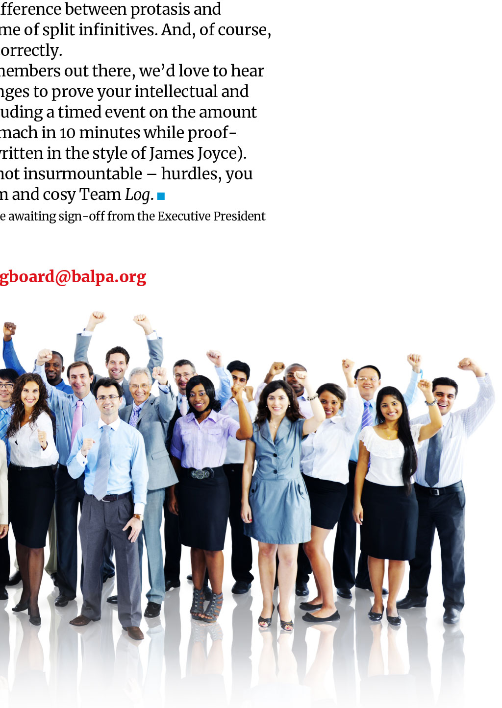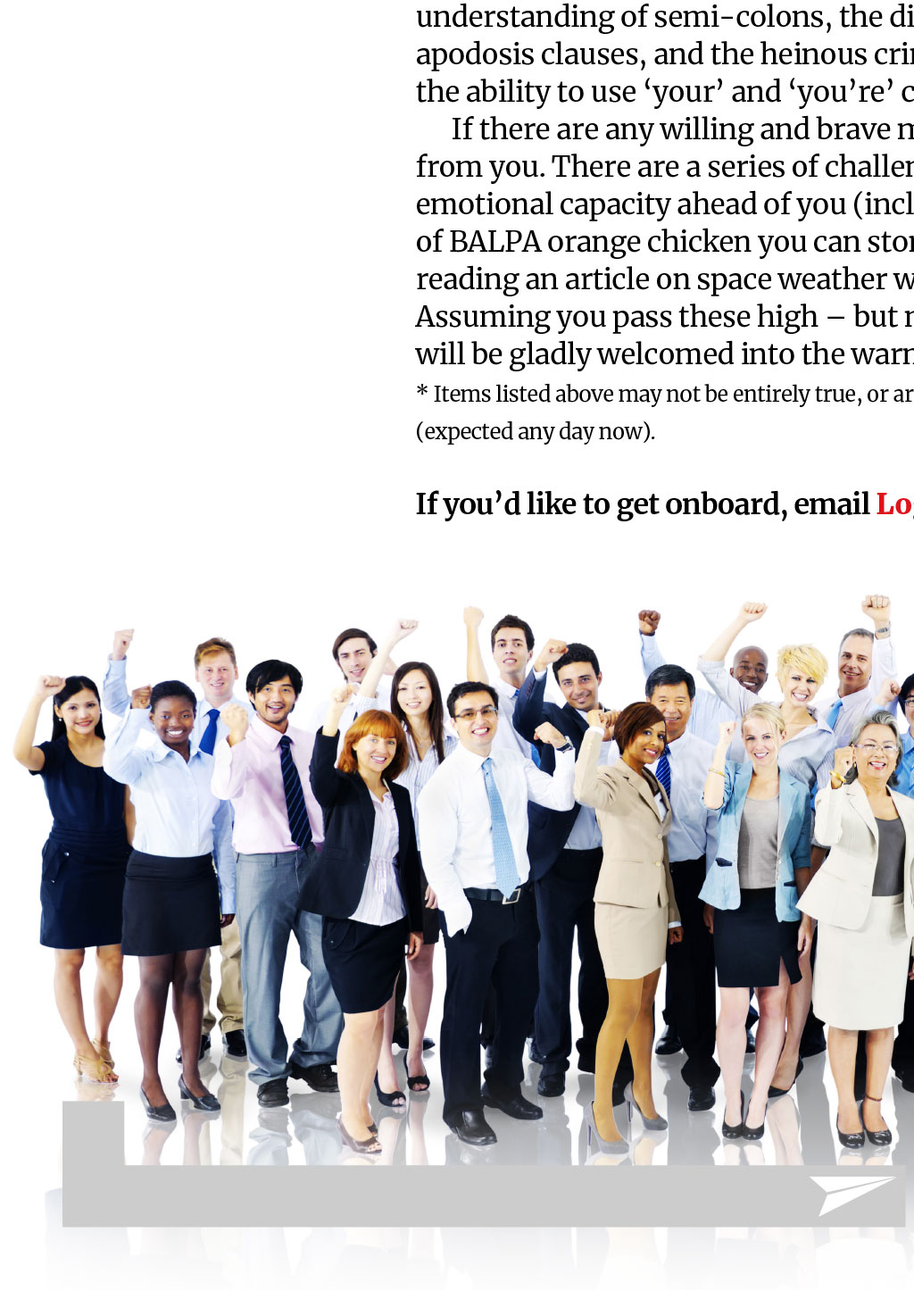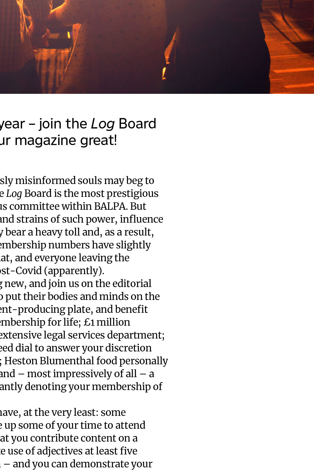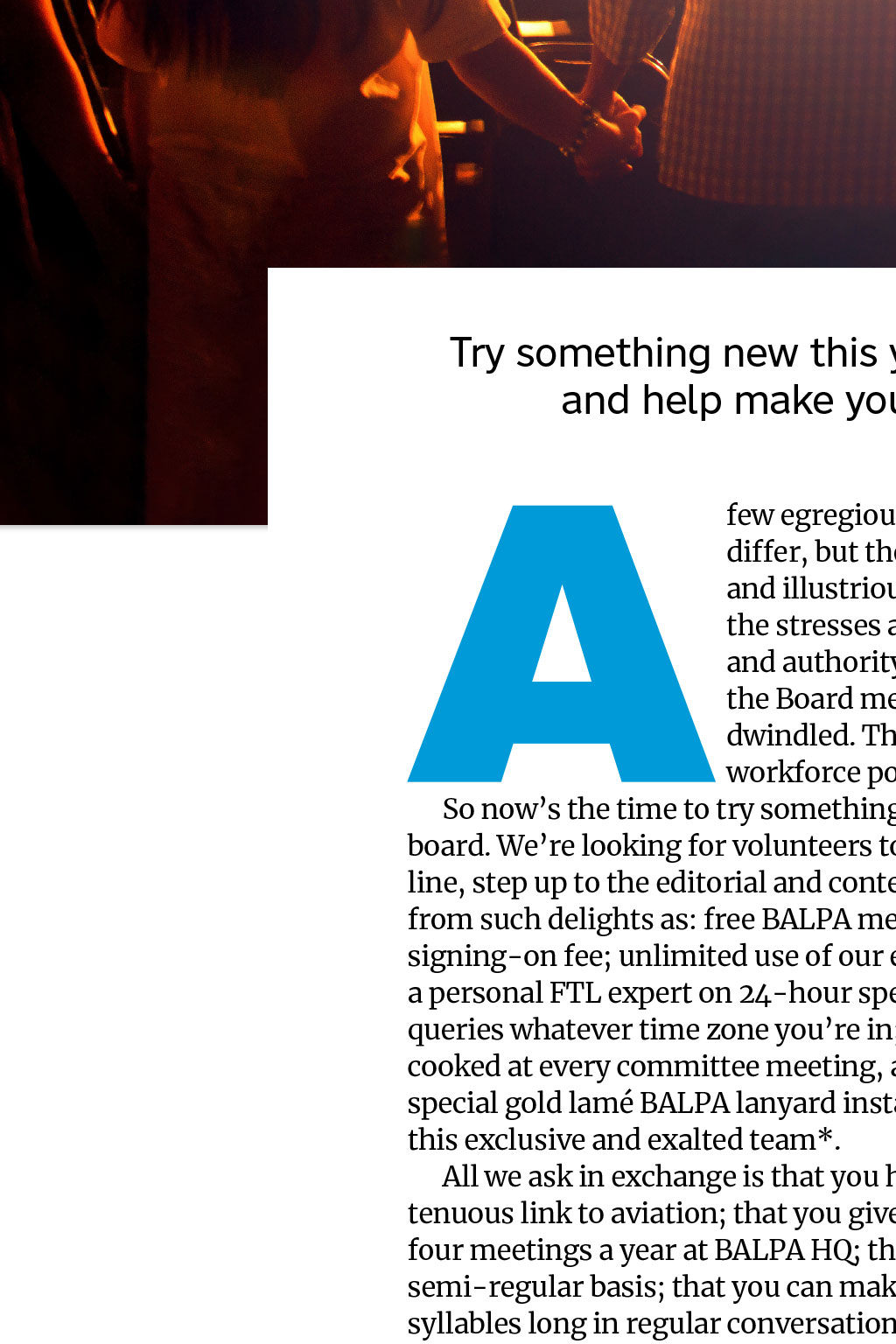 THE LOG BOARD Try something new this year Join the Log Board and help make your magazine great! few egregiously misinformed souls may beg to differ, but the Log Board is the most prestigious and illustrious committee within BALPA. But the stresses and strains of such power, influence and authority bear a heavy toll and, as a result, the Board membership numbers have slightly dwindled. That, and everyone leaving the workforce post-Covid (apparently). So nows the time to try something new, and join us on the editorial board. Were looking for volunteers to put their bodies and minds on the line, step up to the editorial and content-producing plate, and benefit from such delights as: free BALPA membership for life; 1 million signing-on fee; unlimited use of our extensive legal services department; a personal FTL expert on 24-hour speed dial to answer your discretion queries whatever time zone youre in; Heston Blumenthal food personally cooked at every committee meeting, and most impressively of all a special gold lam BALPA lanyard instantly denoting your membership of this exclusive and exalted team*. All we ask in exchange is that you have, at the very least: some tenuous link to aviation; that you give up some of your time to attend four meetings a year at BALPA HQ; that you contribute content on a semi-regular basis; that you can make use of adjectives at least five syllables long in regular conversation and you can demonstrate your understanding of semi-colons, the difference between protasis and apodosis clauses, and the heinous crime of split infinitives. And, of course, the ability to use your and youre correctly. If there are any willing and brave members out there, wed love to hear from you. There are a series of challenges to prove your intellectual and emotional capacity ahead of you (including a timed event on the amount of BALPA orange chicken you can stomach in 10 minutes while proofreading an article on space weather written in the style of James Joyce). Assuming you pass these high but not insurmountable hurdles, you will be gladly welcomed into the warm and cosy Team Log. * Items listed above may not be entirely true, or are awaiting sign-off from the Executive President (expected any day now). If youd like to get onboard, email Logboard@balpa.org
