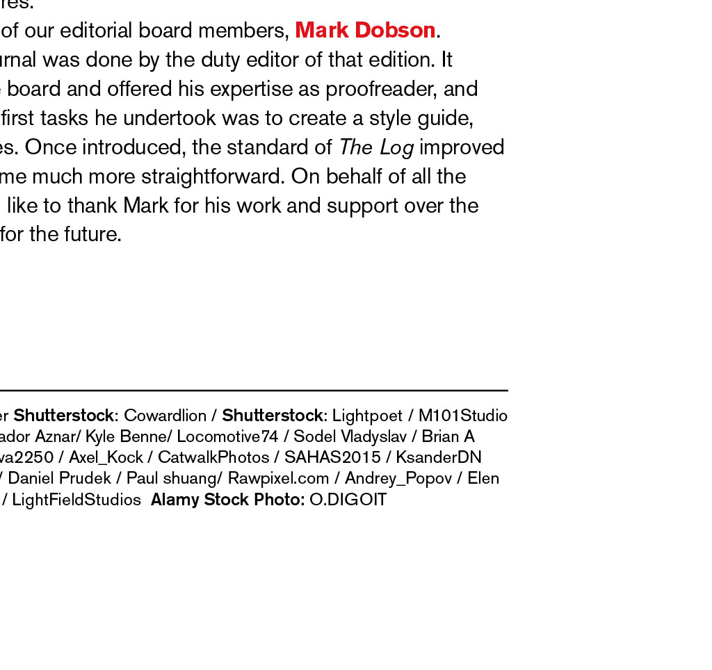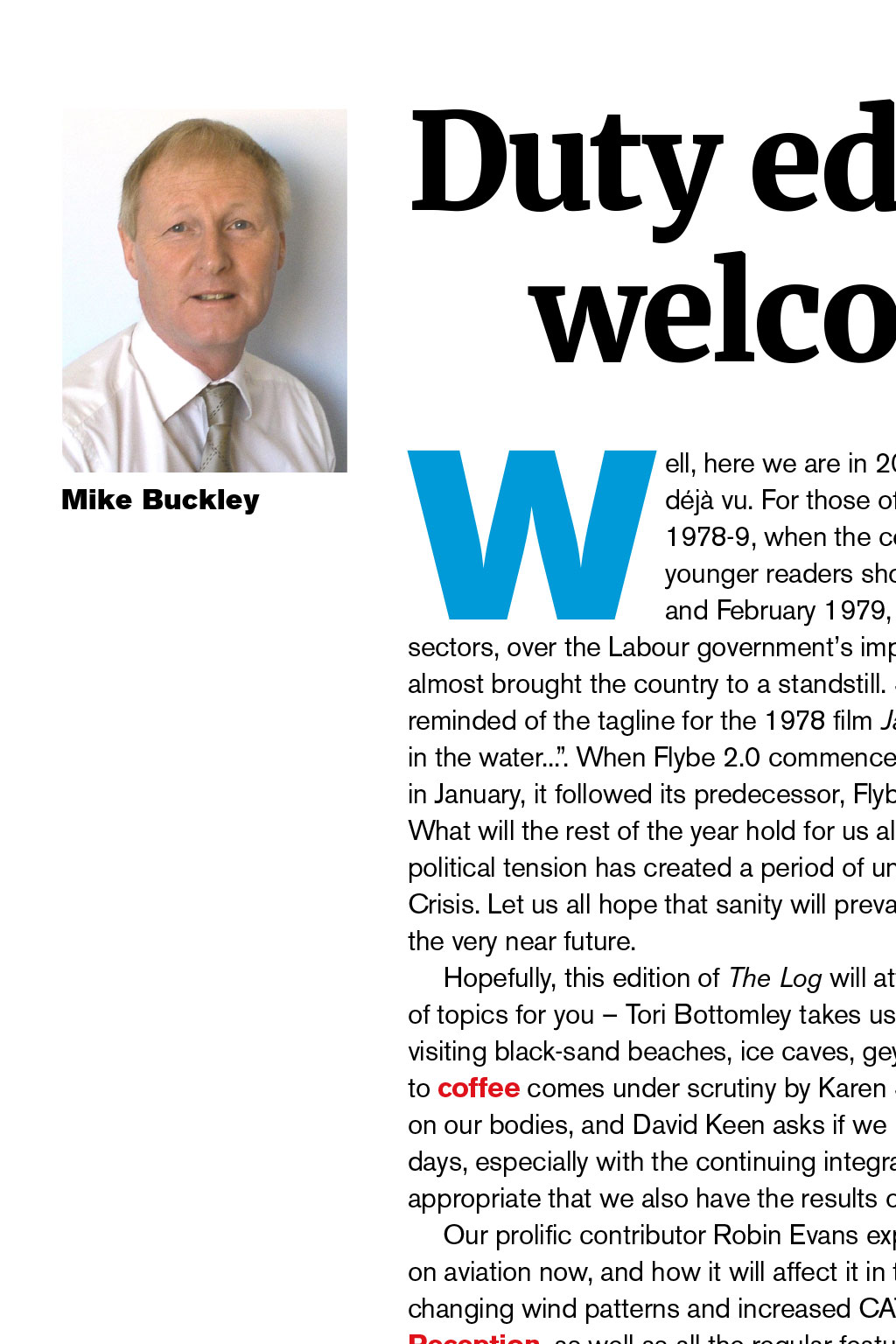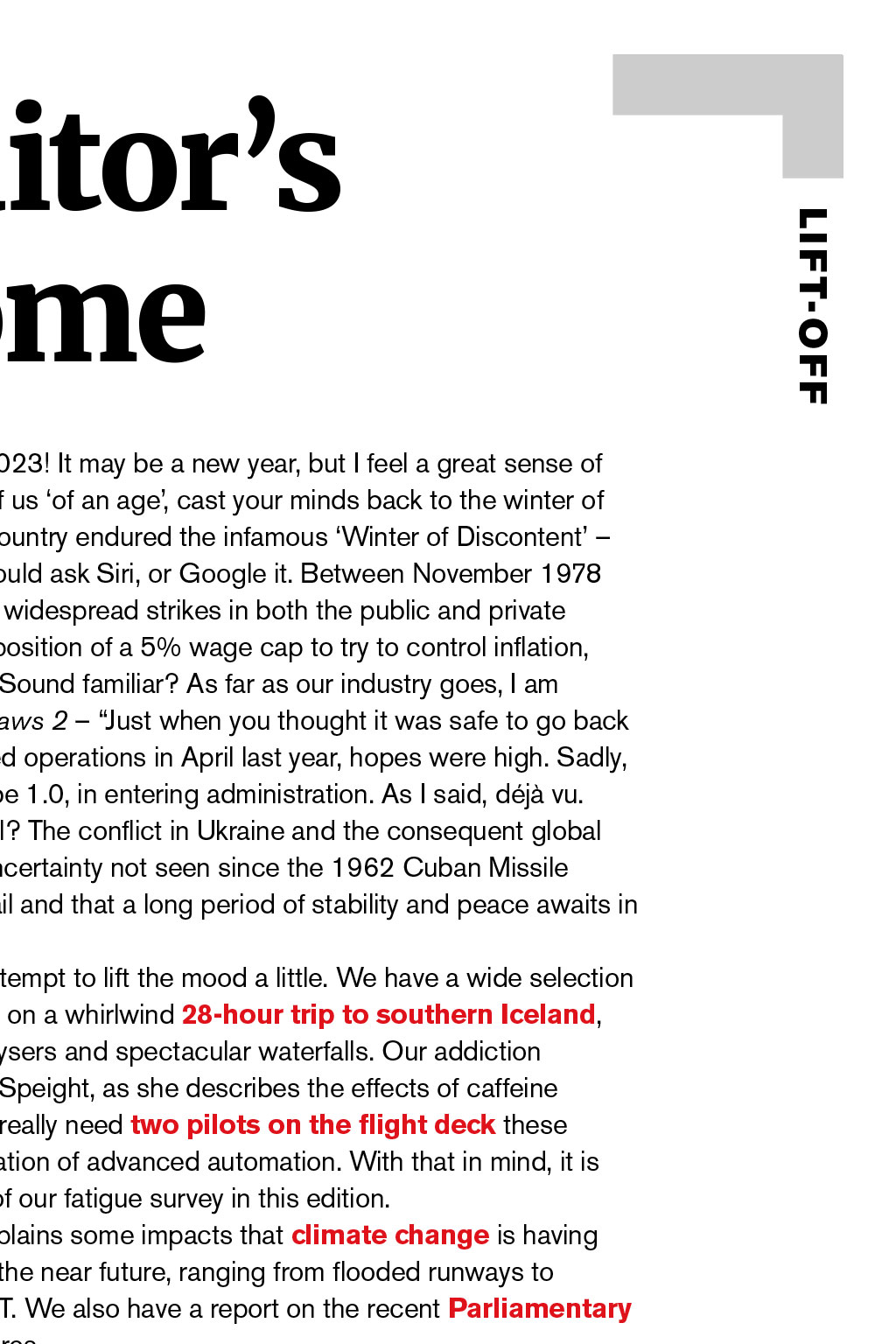 Mike Buckley Well, here we are in 2023! It may be a new year, but I feel a great sense of deja vu. For those of us of an age, cast your minds back to the winter of 1978-9, when the country endured the infamous Winter of Discontent younger readers should ask Siri, or Google it. Between November 1978 and February 1979, widespread strikes in both the public and private sectors, over the Labour governments imposition of a 5% wage cap to try to control inflation, almost brought the country to a standstill. Sound familiar? As far as our industry goes, I am reminded of the tagline for the 1978 film Jaws 2 Just when you thought it was safe to go back in the water.... When Flybe 2.0 commenced operations in April last year, hopes were high. Sadly, in January, it followed its predecessor, Flybe 1.0, in entering administration. As I said, dj vu. What will the rest of the year hold for us all? The conflict in Ukraine and the consequent global political tension has created a period of uncertainty not seen since the 1962 Cuban Missile Crisis. Let us all hope that sanity will prevail and that a long period of stability and peace awaits in the very near future. Hopefully, this edition of The Log will attempt to lift the mood a little. We have a wide selection of topics for you Tori Bottomley takes us on a whirlwind 28-hour trip to southern Iceland, visiting black-sand beaches, ice caves, geysers and spectacular waterfalls. Our addiction to coffee comes under scrutiny by Karen Speight, as she describes the effects of caffeine on our bodies, and David Keen asks if we really need two pilots on the flight deck these days, especially with the continuing integration of advanced automation. With that in mind, it is appropriate that we also have the results of our fatigue survey in this edition. Our prolific contributor Robin Evans explains some impacts that climate change is having on aviation now, and how it will affect it in the near future, ranging from flooded runways to changing wind patterns and increased CAT. We also have a report on the recent Parliamentary Reception, as well as all the regular features. Finally, we have to say goodbye to one of our editorial board members, Mark Dobson. Around 25 years ago, proofreading the journal was done by the duty editor of that edition. It wasnt always perfect. Mark contacted the board and offered his expertise as proofreader, and he was immediately accepted. One of the first tasks he undertook was to create a style guide, complete with spelling and grammar guides. Once introduced, the standard of The Log improved noticeably, and the job of the editors became much more straightforward. On behalf of all the board members, past and present, I would like to thank Mark for his work and support over the past 25 years, and wish him the very best for the future. Good reading folks! Picture credits, where not shown or supplied: Cover Shutterstock: Cowardlion / Shutterstock: Lightpoet / M101Studio / Ekapol Sirachainan / Ekkaphan Chongchiteua / Salvador Aznar/ Kyle Benne/ Locomotive74 / Sodel Vladyslav / Brian A Jackson/ Plampy / Maksim Denisenko / Marinamiltusova2250 / Axel_Kock / CatwalkPhotos / SAHAS2015 / KsanderDN / Michael715 / Apghedia / Antlii / Mark Time Author / Daniel Prudek / Paul shuang/ Rawpixel.com / Andrey_Popov / Elen Photo / Bhushan Raj Timla iStock.com: Stefanholm / LightFieldStudios Alamy Stock Photo: O.DIGOIT LIFT-OFF Duty editors welcome