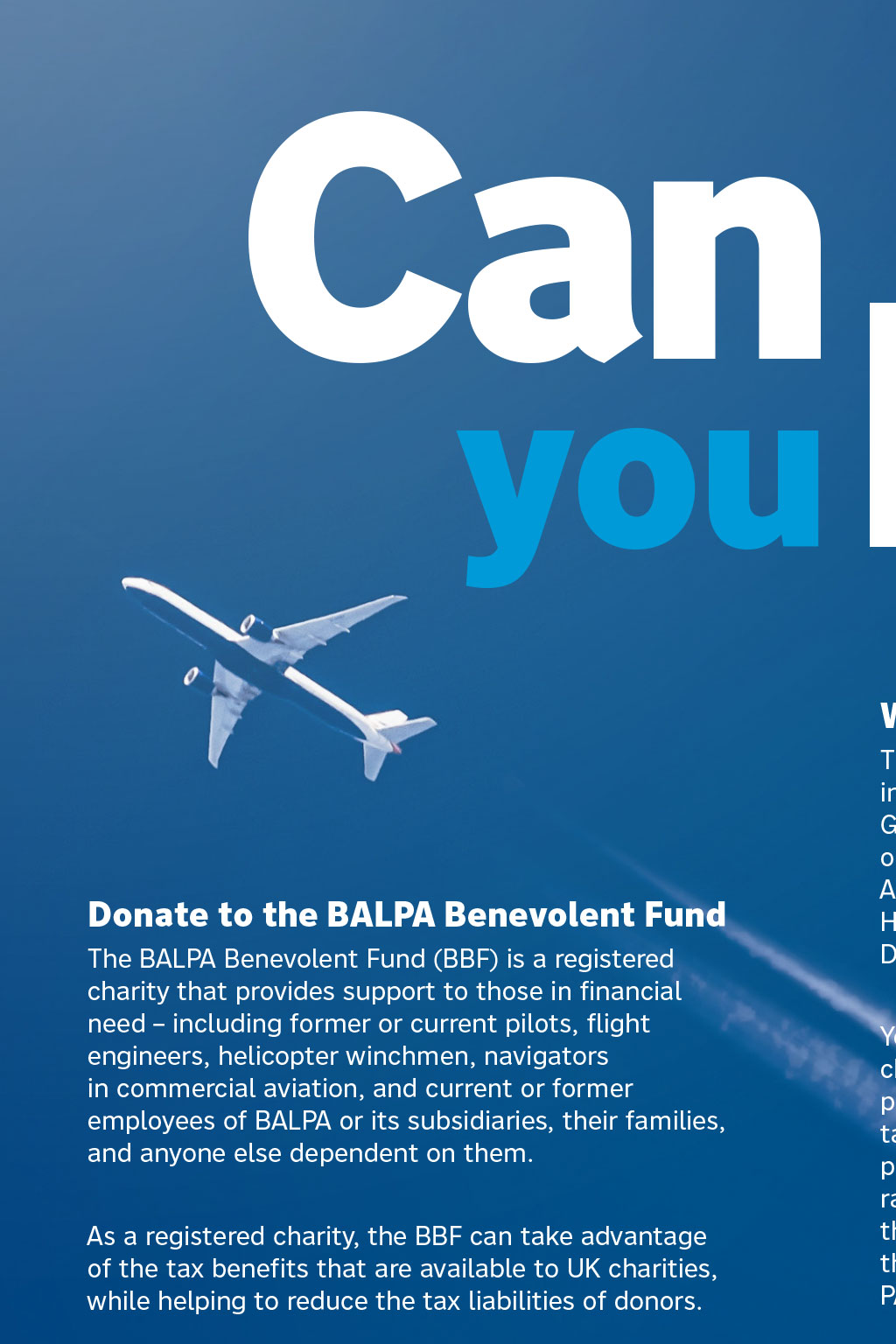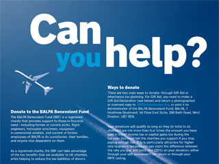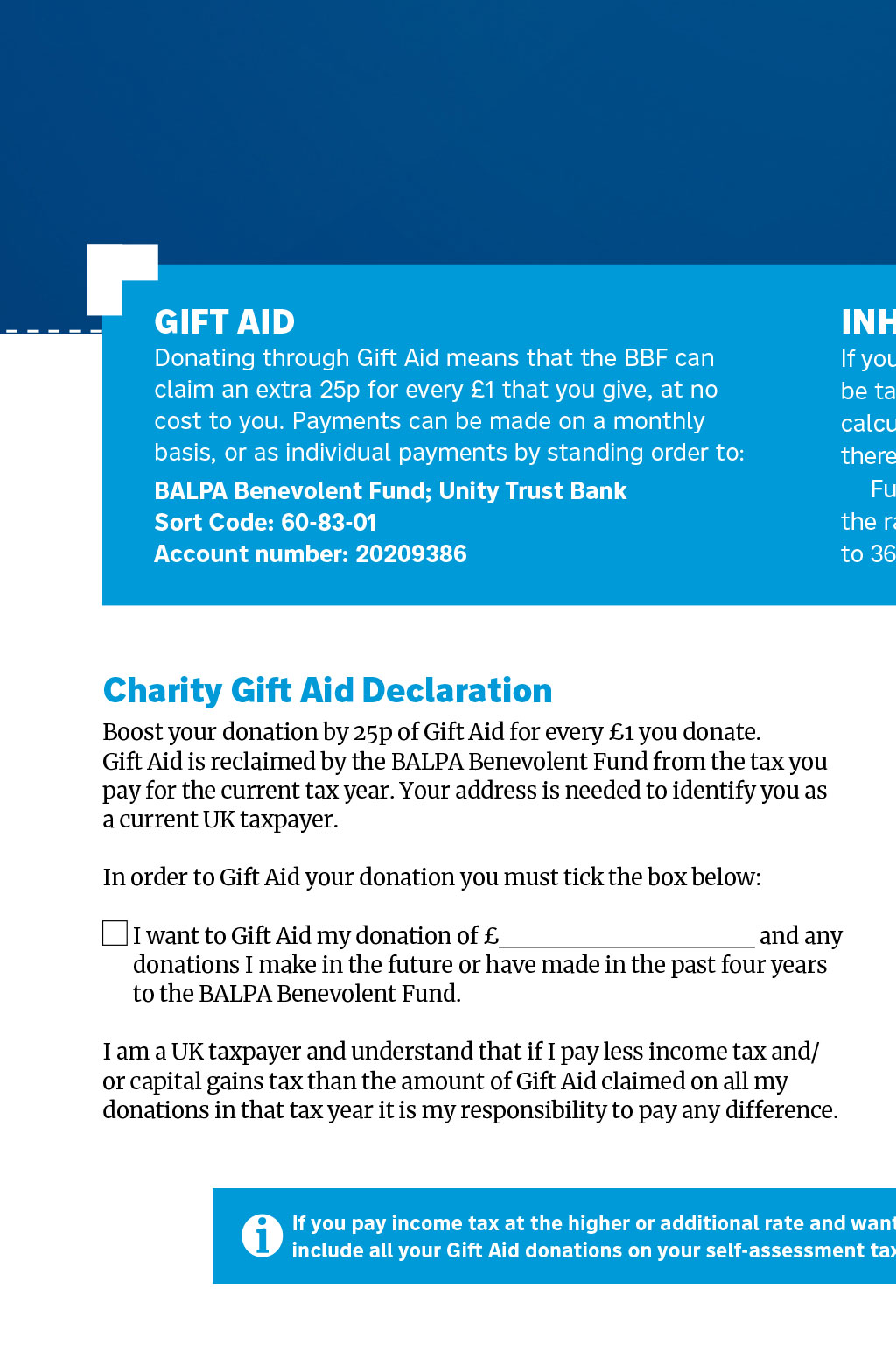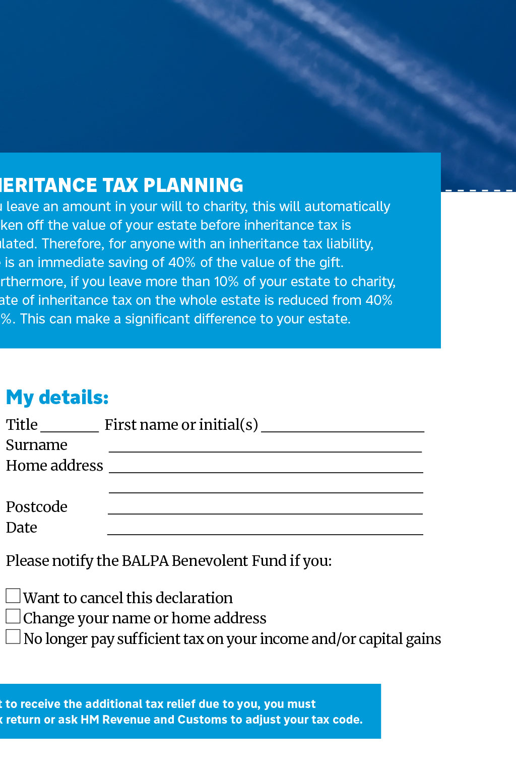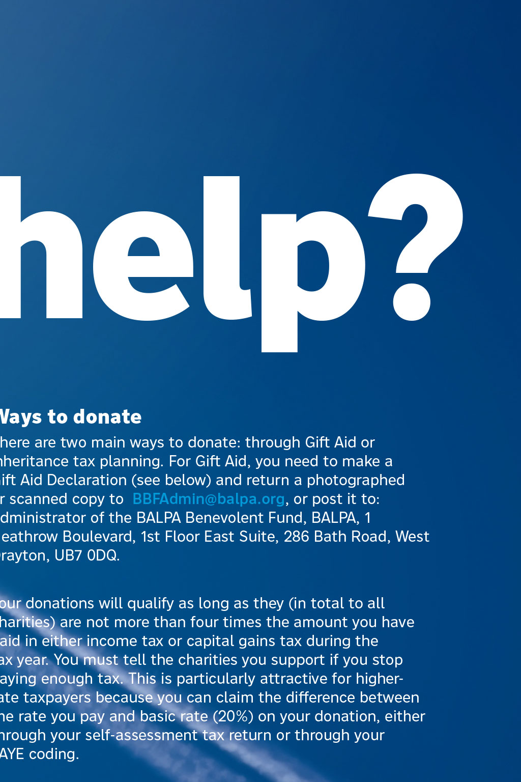 Can you help? Ways to donate There are two main ways to donate: through Gift Aid or inheritance tax planning. For Gift Aid, you need to make a Gift Aid Declaration (see below) and return a photographed or scanned copy to BBFAdmin@balpa.org, or post it to: Administrator of the BALPA Benevolent Fund, BALPA, 1 Heathrow Boulevard, 1st Floor East Suite, 286 Bath Road, West Drayton, UB7 0DQ. Donate to the BALPA Benevolent Fund The BALPA Benevolent Fund (BBF) is a registered charity that provides support to those in financial need including former or current pilots, flight engineers, helicopter winchmen, navigators in commercial aviation, and current or former employees of BALPA or its subsidiaries, their families, and anyone else dependent on them. Your donations will qualify as long as they (in total to all charities) are not more than four times the amount you have paid in either income tax or capital gains tax during the tax year. You must tell the charities you support if you stop paying enough tax. This is particularly attractive for higherrate taxpayers because you can claim the difference between the rate you pay and basic rate (20%) on your donation, either through your self-assessment tax return or through your PAYE coding. As a registered charity, the BBF can take advantage of the tax benefits that are available to UK charities, while helping to reduce the tax liabilities of donors. GIFT AID Donating through Gift Aid means that the BBF can claim an extra 25p for every 1 that you give, at no cost to you. Payments can be made on a monthly basis, or as individual payments by standing order to: BALPA Benevolent Fund; Unity Trust Bank Sort Code: 60-83-01 Account number: 20209386 INHERITANCE TAX PLANNING If you leave an amount in your will to charity, this will automatically be taken off the value of your estate before inheritance tax is calculated. Therefore, for anyone with an inheritance tax liability, there is an immediate saving of 40% of the value of the gift. Furthermore, if you leave more than 10% of your estate to charity, the rate of inheritance tax on the whole estate is reduced from 40% to 36%. This can make a significant difference to your estate. Charity Gift Aid Declaration My details: Boost your donation by 25p of Gift Aid for every 1 you donate. Gift Aid is reclaimed by the BALPA Benevolent Fund from the tax you pay for the current tax year. Your address is needed to identify you as a current UK taxpayer. Title _____ First name or initial(s) _________ ______ Surname ___________________________ Home address ___________________________ ___________________________ Postcode _________________________ ___ Date _________________________ ___ In order to Gift Aid your donation you must tick the box below: I want to Gift Aid my donation of ______________ and any donations I make in the future or have made in the past four years to the BALPA Benevolent Fund. I am a UK taxpayer and understand that if I pay less income tax and/ or capital gains tax than the amount of Gift Aid claimed on all my donations in that tax year it is my responsibility to pay any difference. Please notify the BALPA Benevolent Fund if you: Want to cancel this declaration Change your name or home address N o longer pay sufficient tax on your income and/or capital gains If you pay income tax at the higher or additional rate and want to receive the additional tax relief due to you, you must include all your Gift Aid donations on your self-assessment tax return or ask HM Revenue and Customs to adjust your tax code.