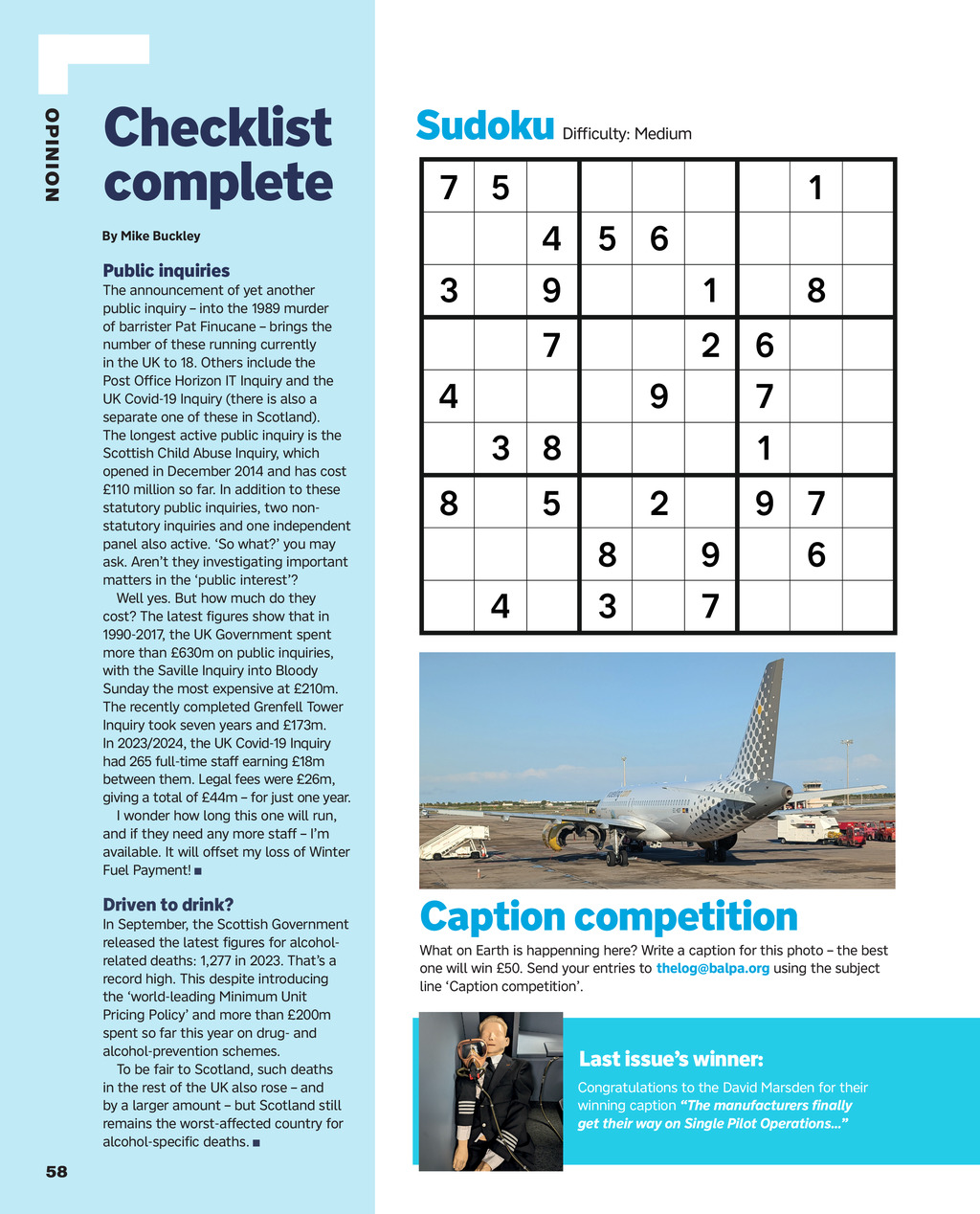 OPINION Checklist complete Sudoku 7 5 The announcement of yet another public inquiry into the 1989 murder of barrister Pat Finucane brings the number of these running currently in the UK to 18. Others include the Post Office Horizon IT Inquiry and the UK Covid-19 Inquiry (there is also a separate one of these in Scotland). The longest active public inquiry is the Scottish Child Abuse Inquiry, which opened in December 2014 and has cost 110 million so far. In addition to these statutory public inquiries, two nonstatutory inquiries and one independent panel also active. So what? you may ask. Arent they investigating important matters in the public interest? Well yes. But how much do they cost? The latest figures show that in 1990-2017, the UK Government spent more than 630m on public inquiries, with the Saville Inquiry into Bloody Sunday the most expensive at 210m. The recently completed Grenfell Tower Inquiry took seven years and 173m. In 2023/2024, the UK Covid-19 Inquiry had 265 full-time staff earning 18m between them. Legal fees were 26m, giving a total of 44m for just one year. I wonder how long this one will run, and if they need any more staff Im available. It will offset my loss of Winter Fuel Payment! Driven to drink? In September, the Scottish Government released the latest figures for alcoholrelated deaths: 1,277 in 2023. Thats a record high. This despite introducing the world-leading Minimum Unit Pricing Policy and more than 200m spent so far this year on drug- and alcohol-prevention schemes. To be fair to Scotland, such deaths in the rest of the UK also rose and by a larger amount but Scotland still remains the worst-affected country for alcohol-specific deaths. 1 4 9 By Mike Buckley Public inquiries Difficulty: Medium 3 5 6 1 7 3 8 5 4 B m t a in g s R a t fl 2 6 9 7 1 4 8 8 2 8 3 9 7 9 6 7 I fo a t w c I n Caption competition D What on Earth is happenning here? Write a caption for this photo the best one will win 50. Send your entries to thelog@balpa.org using the subject line Caption competition. 2 f Last issues winner: E Congratulations to the David Marsden for their winning caption The manufacturers finally get their way on Single Pilot Operations 58 THE LOG Autumn 24 pp58-59 Checklist.indd 58 13/11/2024 14:48