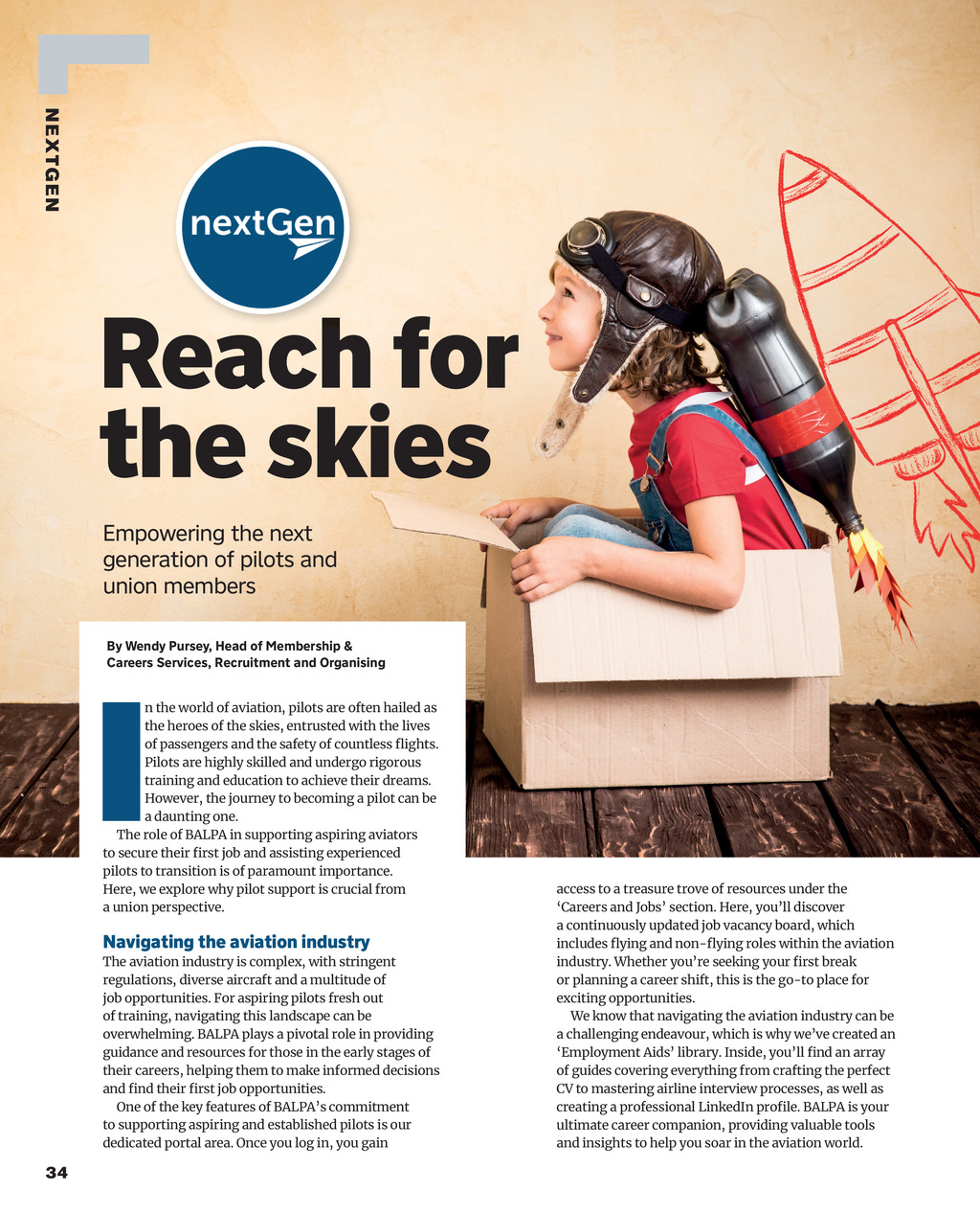 N E X TG E N Reach for the skies Empowering the next generation of pilots and union members By Wendy Pursey, Head of Membership & Careers Services, Recruitment and Organising I n the world of aviation, pilots are often hailed as the heroes of the skies, entrusted with the lives of passengers and the safety of countless flights. Pilots are highly skilled and undergo rigorous training and education to achieve their dreams. However, the journey to becoming a pilot can be a daunting one. The role of BALPA in supporting aspiring aviators to secure their first job and assisting experienced pilots to transition is of paramount importance. Here, we explore why pilot support is crucial from a union perspective. Navigating the aviation industry The aviation industry is complex, with stringent regulations, diverse aircraft and a multitude of job opportunities. For aspiring pilots fresh out of training, navigating this landscape can be overwhelming. BALPA plays a pivotal role in providing guidance and resources for those in the early stages of their careers, helping them to make informed decisions and find their first job opportunities. One of the key features of BALPAs commitment to supporting aspiring and established pilots is our dedicated portal area. Once you log in, you gain access to a treasure trove of resources under the Careers and Jobs section. Here, youll discover a continuously updated job vacancy board, which includes flying and non-flying roles within the aviation industry. Whether youre seeking your first break or planning a career shift, this is the go-to place for exciting opportunities. We know that navigating the aviation industry can be a challenging endeavour, which is why weve created an Employment Aids library. Inside, youll find an array of guides covering everything from crafting the perfect CV to mastering airline interview processes, as well as creating a professional LinkedIn profile. BALPA is your ultimate career companion, providing valuable tools and insights to help you soar in the aviation world. 34 THE LOG Win 24 pp34-35 NextGen.indd 34 01/12/2023 14:51