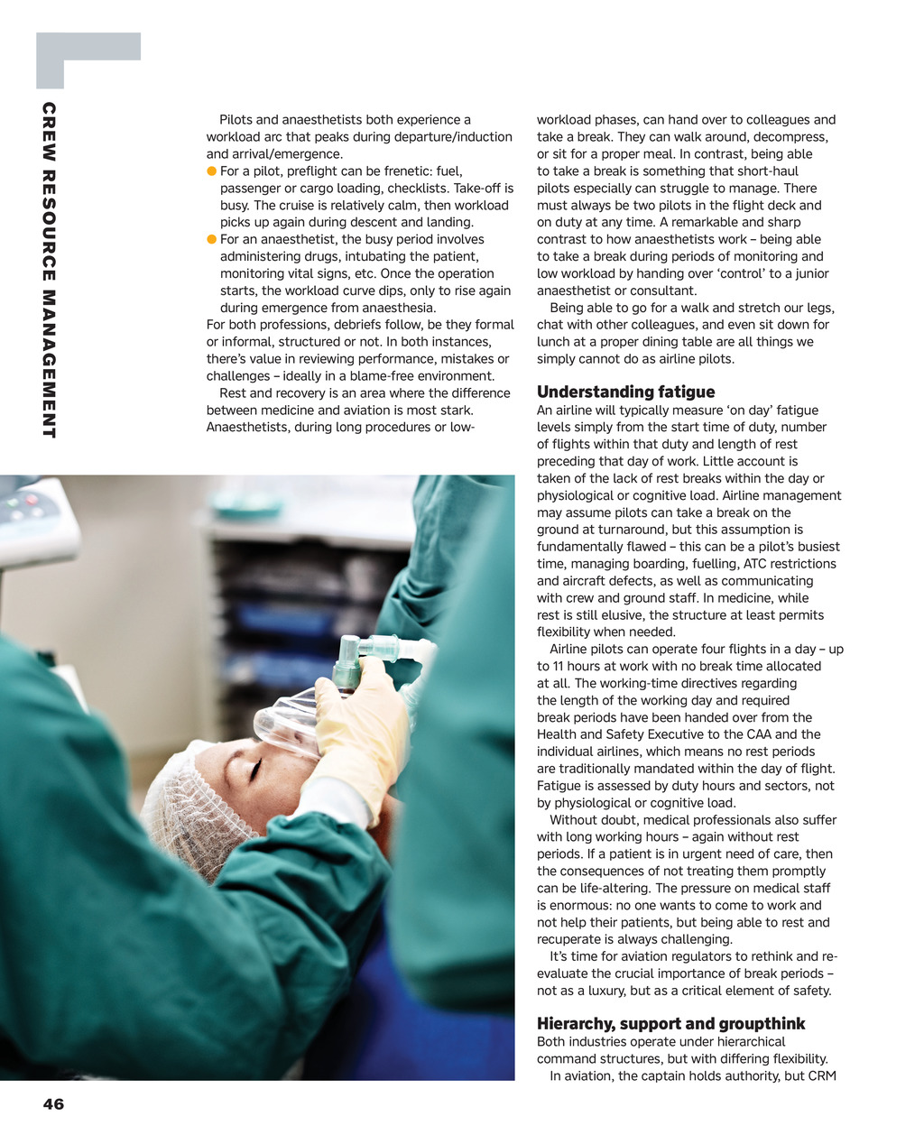 C R E W R E SO U R C E M A N AG E M E N T Pilots and anaesthetists both experience a workload arc that peaks during departure/induction and arrival/emergence. For a pilot, preflight can be frenetic: fuel, passenger or cargo loading, checklists. Take-off is busy. The cruise is relatively calm, then workload picks up again during descent and landing. For an anaesthetist, the busy period involves administering drugs, intubating the patient, monitoring vital signs, etc. Once the operation starts, the workload curve dips, only to rise again during emergence from anaesthesia. For both professions, debriefs follow, be they formal or informal, structured or not. In both instances, theres value in reviewing performance, mistakes or challenges ideally in a blame-free environment. Rest and recovery is an area where the difference between medicine and aviation is most stark. Anaesthetists, during long procedures or low- workload phases, can hand over to colleagues and take a break. They can walk around, decompress, or sit for a proper meal. In contrast, being able to take a break is something that short-haul pilots especially can struggle to manage. There must always be two pilots in the flight deck and on duty at any time. A remarkable and sharp contrast to how anaesthetists work being able to take a break during periods of monitoring and low workload by handing over control to a junior anaesthetist or consultant. Being able to go for a walk and stretch our legs, chat with other colleagues, and even sit down for lunch at a proper dining table are all things we simply cannot do as airline pilots. Understanding fatigue An airline will typically measure on day fatigue levels simply from the start time of duty, number of flights within that duty and length of rest preceding that day of work. Little account is taken of the lack of rest breaks within the day or physiological or cognitive load. Airline management may assume pilots can take a break on the ground at turnaround, but this assumption is fundamentally flawed this can be a pilots busiest time, managing boarding, fuelling, ATC restrictions and aircraft defects, as well as communicating with crew and ground staff. In medicine, while rest is still elusive, the structure at least permits flexibility when needed. Airline pilots can operate four flights in a day up to 11 hours at work with no break time allocated at all. The working-time directives regarding the length of the working day and required break periods have been handed over from the Health and Safety Executive to the CAA and the individual airlines, which means no rest periods are traditionally mandated within the day of flight. Fatigue is assessed by duty hours and sectors, not by physiological or cognitive load. Without doubt, medical professionals also suffer with long working hours again without rest periods. If a patient is in urgent need of care, then the consequences of not treating them promptly can be life-altering. The pressure on medical staff is enormous: no one wants to come to work and not help their patients, but being able to rest and recuperate is always challenging. Its time for aviation regulators to rethink and reevaluate the crucial importance of break periods not as a luxury, but as a critical element of safety. Hierarchy, support and groupthink Both industries operate under hierarchical command structures, but with differing flexibility. In aviation, the captain holds authority, but CRM 46 THE LOG Summer 25 pp44-47 CRM.indd 46 09/07/2025 15:48