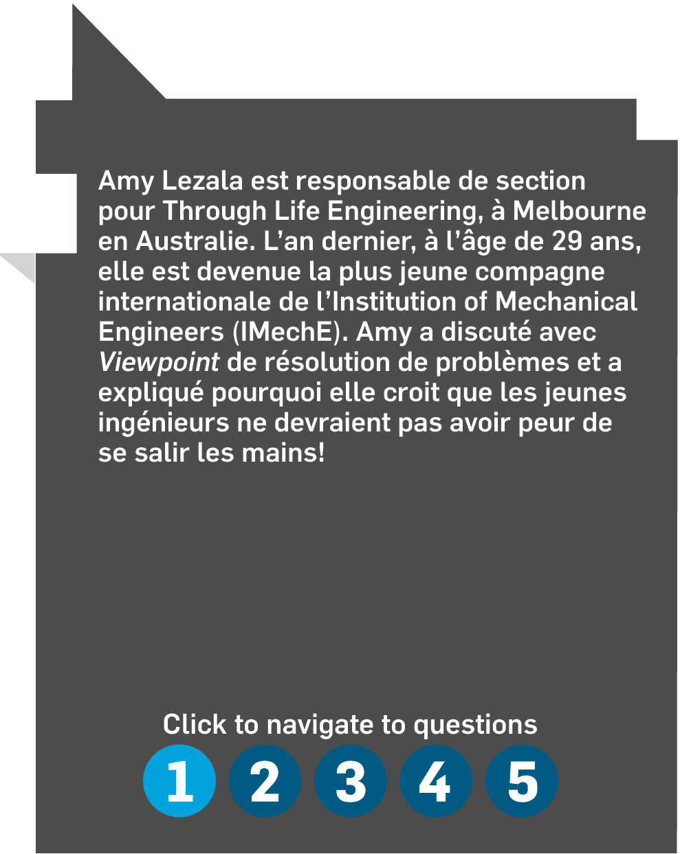 Entrevue de 60 secondes ENTREVUE CLAIR AVEC... Amy Lezala TexTe: ANDREW BENNETT PhoTo: BRETT BROGAN Amy Lezala est responsable de section pour Through Life Engineering, Melbourne en Australie. Lan dernier, lge de 29 ans, elle est devenue la plus jeune compagne internationale de lInstitution of Mechanical Engineers (IMechE). Amy a discut avec Viewpoint de rsolution de problmes et a expliqu pourquoi elle croit que les jeunes ingnieurs ne devraient pas avoir peur de se salir les mains! Click to navigate to questions 12345 Quest-ce que a vous a fait de devenir la plus jeune compagne internationale de lIMechE, et quels conseils donneriez-vous de jeunes femmes qui envisagent une carrire en ingnierie? Ctait extraordinaire. Jtais reste au bureau tard ce soir-l, et jai t trs excite lorsque jai reu le courriel. Cest une superbe reconnaissance de mon travail acharn. Pour ce qui est dun message lancer aux femmes en particulier, ce sujet me chicote toujours un peu. Je naime pas diviser les ingnieurs entre femmes ou hommes je vois toujours plutt des ingnieurs qui se passionnent pour ce quils font. Mon conseil pour tous les jeunes ingnieurs : si vous voulez quelque chose, lancez-vous sa poursuite. 12345 Quest-ce qui vous plat le plus de votre travail? La rsolution de problmes. Tout au long de ma carrire, jai toujours ador la varit et le fait davoir penser toute la dure de vie , ce qui mes yeux est de lingnierie durable : trouver des solutions qui optimisent la maintenance et la valeur des actifs. Click to navigate to questions 12345 Quels conseils donneriez-vous quelquun qui se lance en ingnierie ferroviaire? Passez du temps au dpt ou sur la ligne de production. Apprenez connatre le produit en le touchant de vos mains; rampez sous le train pour dcouvrir la fonction et lemplacement de chaque pice. Pendant que jtais dans un dpt au cours de mon programme pour diplms, je rinstallais un tuyau sous un train, et une bote obstruait la fixation. Ctait trs difficile raccorder. Un des installateurs qui supervisait mon travail ma dit, un sourire en coin : Souviens-toi de a, la prochaine fois que tu concevras un train. Je ne lai jamais oubli. 12345 Quest-ce que tout visiteur en Australie devrait faire sans faute? Pour explorer la nature, rendez-vous au Queensland et au Territoire du Nord. Au Queensland, dcouvrez les les Moreton et Fraser en 4x4, ou allez faire de la plonge parmi les poissons tropicaux. Et pour la culture et la vie nocturne, cest Melbourne quil faut aller. 12345 snclavalin.com