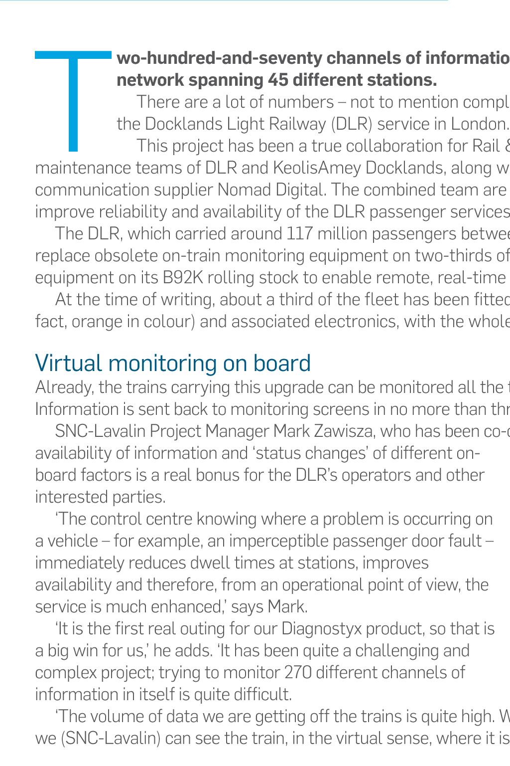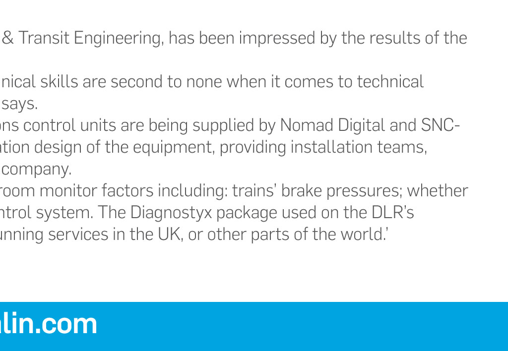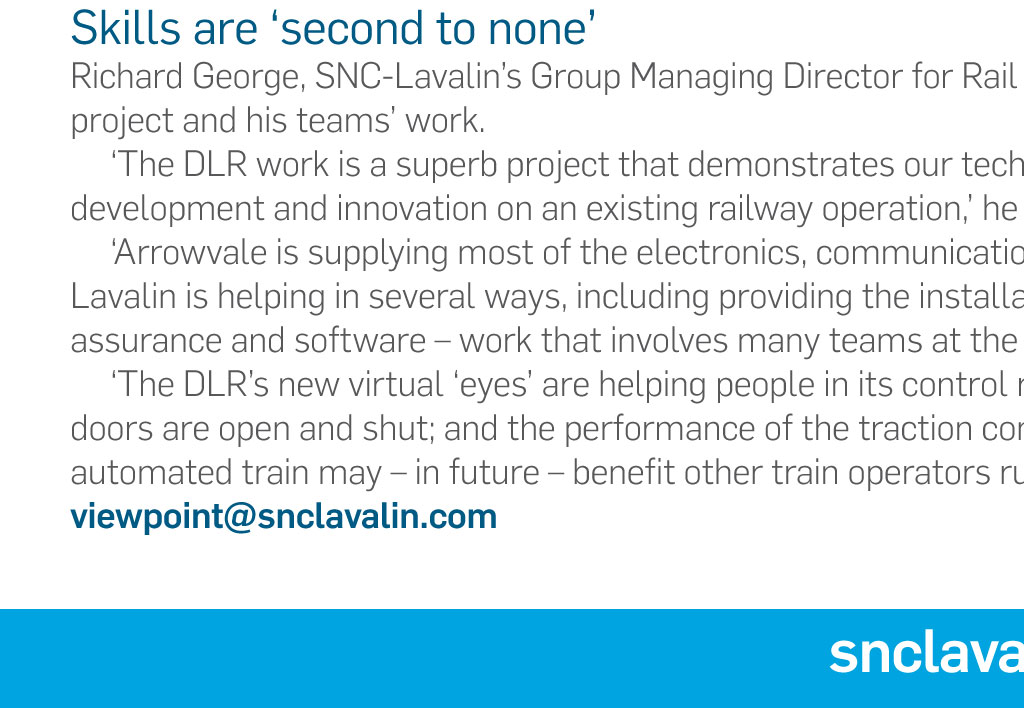 Projects Ride on time With DLR ‘Black box’ project Monitoring part of the train fleet on London’s Docklands Light Railway in real time is becoming a reality, thanks to an innovative SNC-Lavalin project that showcases both technical skills and close partnership working Words Andrew Bennett Two-hundred-and-seventy channels of information available 24/7. Ninety- four vehicles running on a network spanning 45 different stations. There are a lot of numbers – not to mention complexity – involved in SNC-Lavalin’s latest project to help improve the Docklands Light Railway (DLR) service in London. This project has been a true collaboration for Rail & Transit, working with the rolling stock engineering and maintenance teams of DLR and KeolisAmey Docklands, along with the lead contractor Arrowvale Electronics and communication supplier Nomad Digital. The combined team are delivering a challenging and innovative scheme that will help improve reliability and availability of the DLR passenger services. The DLR, which carried around 117 million passengers between April 2015 and March 2016, asked the main contractor to replace obsolete on-train monitoring equipment on two-thirds of its rolling stock fleet. The client also wanted to upgrade the equipment on its B92K rolling stock to enable remote, real-time monitoring of this fleet – a new capability. At the time of writing, about a third of the fleet has been fitted with its new rail-equivalent ‘black box’ recorders (which are, in fact, orange in colour) and associated electronics, with the whole upgrade due for completion by December this year. Virtual monitoring on board Already, the trains carrying this upgrade can be monitored all the time they are in service, wherever they are on the DLR network. Information is sent back to monitoring screens in no more than three seconds. SNC-Lavalin Project Manager Mark Zawisza, who has been co-ordinating the project work, says the immediate real-time availability of information and ‘status changes’ of different on- board factors is a real bonus for the DLR’s operators and other interested parties. ‘The control centre knowing where a problem is occurring on a vehicle – for example, an imperceptible passenger door fault – immediately reduces dwell times at stations, improves availability and therefore, from an operational point of view, the service is much enhanced,’ says Mark. It has been quite a challenging and complex project; trying to monitor 270 different channels of information in itself is quite difficult Mark Zawisza Project Manager ‘It is the first real outing for our Diagnostyx product, so that is a big win for us,’ he adds. ‘It has been quite a challenging and complex project; trying to monitor 270 different channels of information in itself is quite difficult. ‘The volume of data we are getting off the trains is quite high. We have had to overcome quite a lot of challenges. The fact that we (SNC-Lavalin) can see the train, in the virtual sense, where it is and what it is doing in real time, for me, is very rewarding.’ Skills are ‘second to none’ Richard George, SNC-Lavalin’s Group Managing Director for Rail & Transit Engineering, has been impressed by the results of the project and his teams’ work. ‘The DLR work is a superb project that demonstrates our technical skills are second to none when it comes to technical development and innovation on an existing railway operation,’ he says. ‘Arrowvale is supplying most of the electronics, communications control units are being supplied by Nomad Digital and SNC-Lavalin is helping in several ways, including providing the installation design of the equipment, providing installation teams, assurance and software – work that involves many teams at the company. ‘The DLR’s new virtual ‘eyes’ are helping people in its control room monitor factors including: trains’ brake pressures; whether doors are open and shut; and the performance of the traction control system. The Diagnostyx package used on the DLR’s automated train may – in future – benefit other train operators running services in the UK, or other parts of the world.’ viewpoint@snclavalin.com snclavalin.com Projects