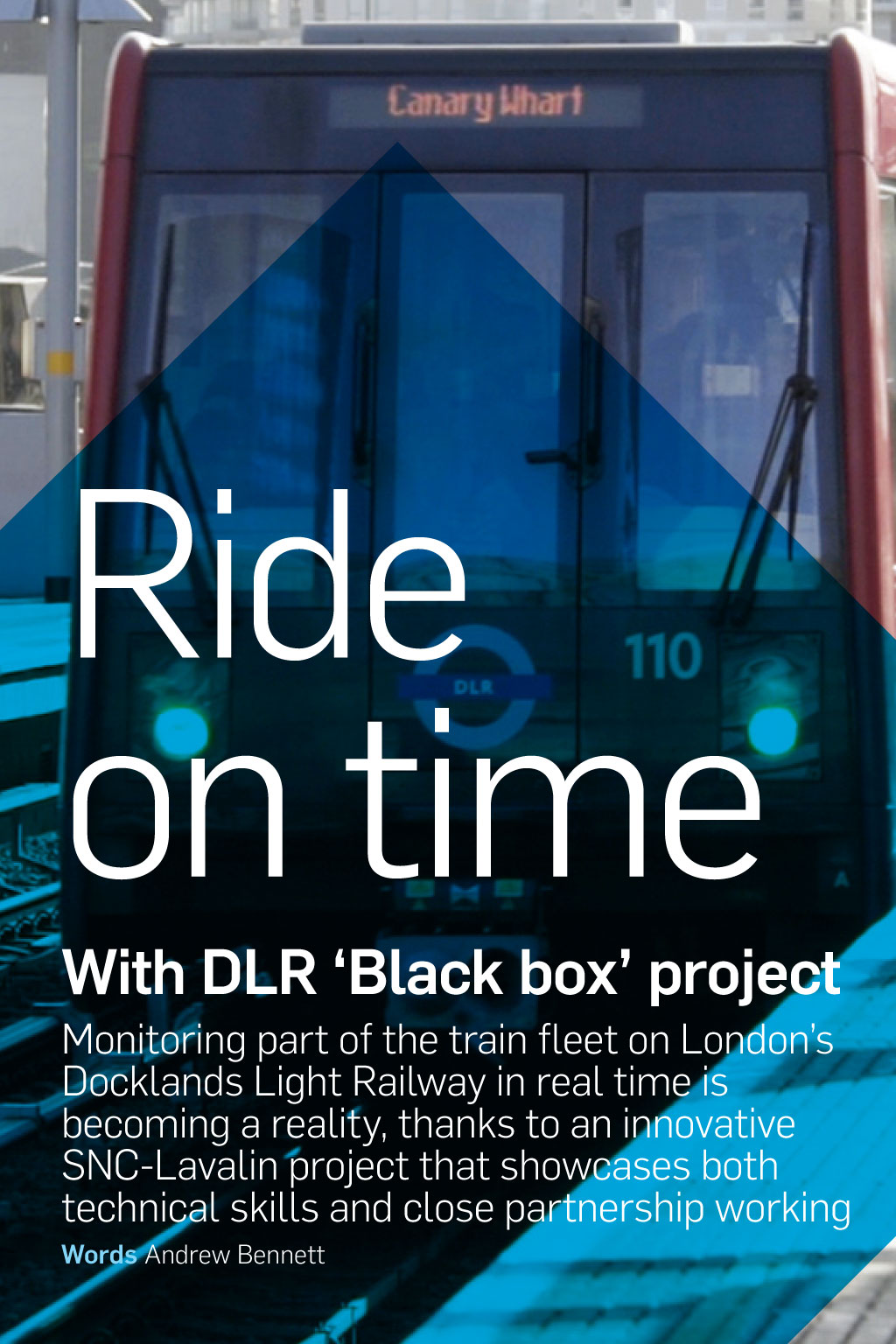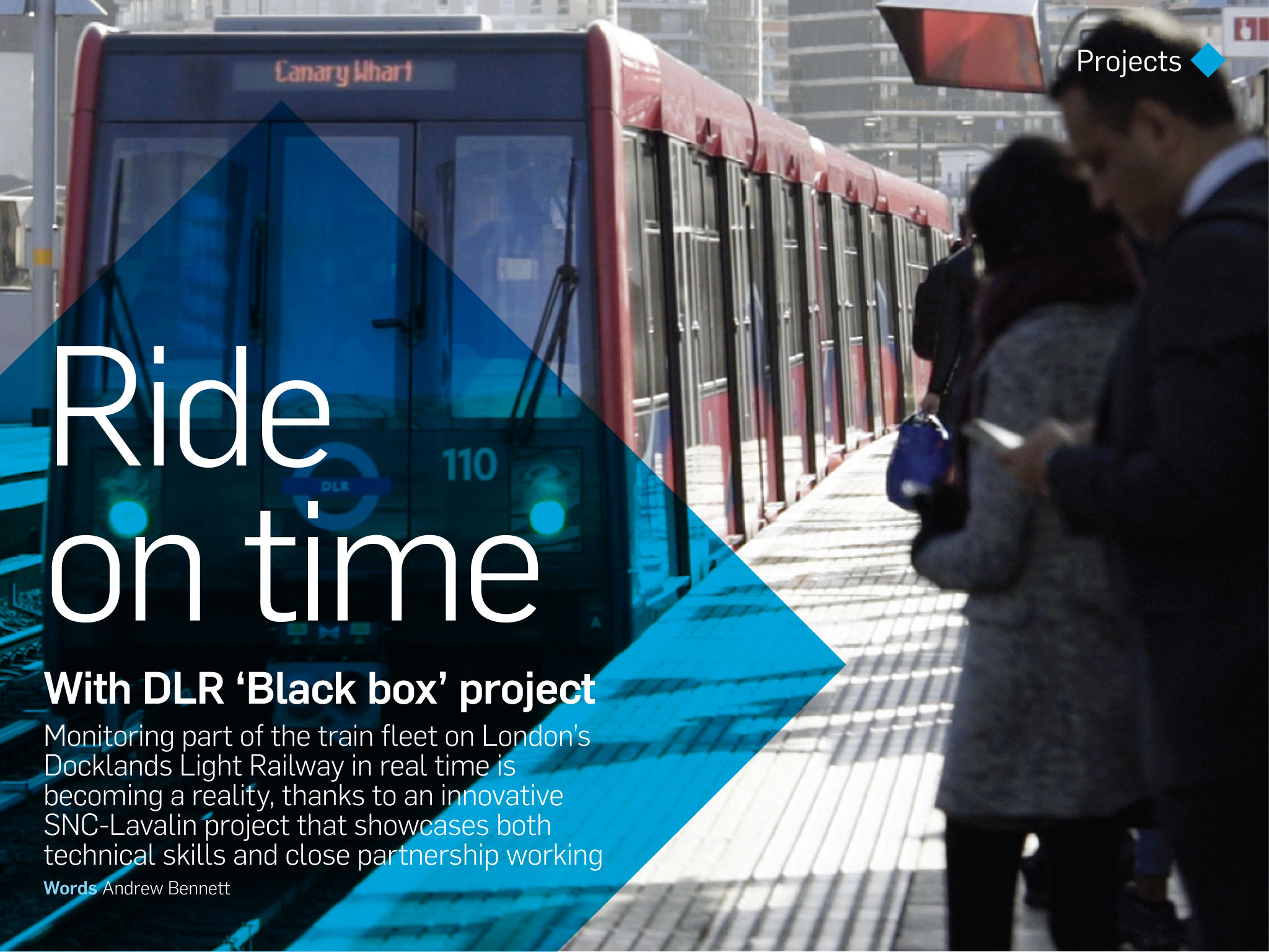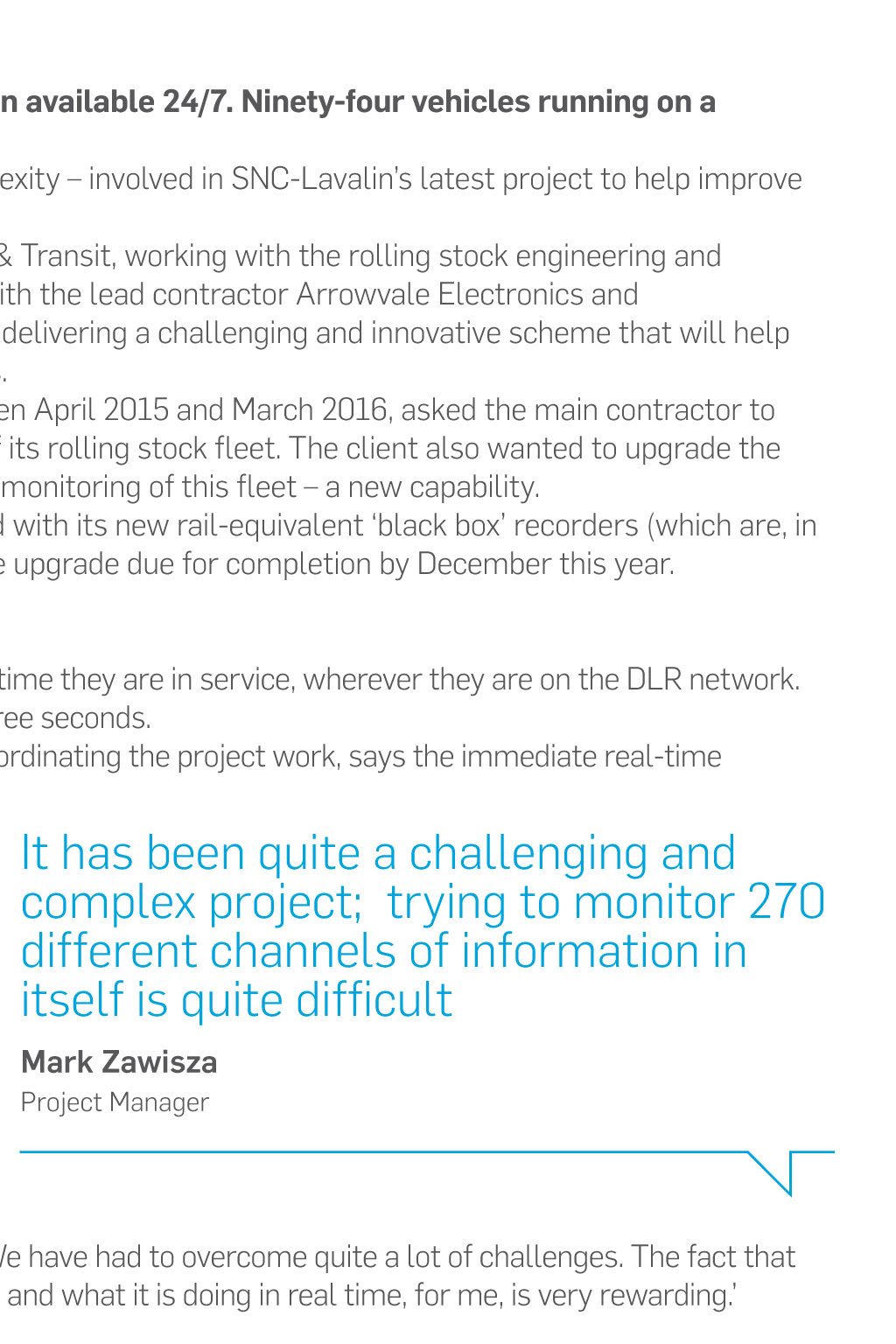 Projects Ride on time With DLR ‘Black box’ project Monitoring part of the train fleet on London’s Docklands Light Railway in real time is becoming a reality, thanks to an innovative SNC-Lavalin project that showcases both technical skills and close partnership working Words Andrew Bennett Two-hundred-and-seventy channels of information available 24/7. Ninety- four vehicles running on a network spanning 45 different stations. There are a lot of numbers – not to mention complexity – involved in SNC-Lavalin’s latest project to help improve the Docklands Light Railway (DLR) service in London. This project has been a true collaboration for Rail & Transit, working with the rolling stock engineering and maintenance teams of DLR and KeolisAmey Docklands, along with the lead contractor Arrowvale Electronics and communication supplier Nomad Digital. The combined team are delivering a challenging and innovative scheme that will help improve reliability and availability of the DLR passenger services. The DLR, which carried around 117 million passengers between April 2015 and March 2016, asked the main contractor to replace obsolete on-train monitoring equipment on two-thirds of its rolling stock fleet. The client also wanted to upgrade the equipment on its B92K rolling stock to enable remote, real-time monitoring of this fleet – a new capability. At the time of writing, about a third of the fleet has been fitted with its new rail-equivalent ‘black box’ recorders (which are, in fact, orange in colour) and associated electronics, with the whole upgrade due for completion by December this year. Virtual monitoring on board Already, the trains carrying this upgrade can be monitored all the time they are in service, wherever they are on the DLR network. Information is sent back to monitoring screens in no more than three seconds. SNC-Lavalin Project Manager Mark Zawisza, who has been co-ordinating the project work, says the immediate real-time availability of information and ‘status changes’ of different on- board factors is a real bonus for the DLR’s operators and other interested parties. ‘The control centre knowing where a problem is occurring on a vehicle – for example, an imperceptible passenger door fault – immediately reduces dwell times at stations, improves availability and therefore, from an operational point of view, the service is much enhanced,’ says Mark. It has been quite a challenging and complex project; trying to monitor 270 different channels of information in itself is quite difficult Mark Zawisza Project Manager ‘It is the first real outing for our Diagnostyx product, so that is a big win for us,’ he adds. ‘It has been quite a challenging and complex project; trying to monitor 270 different channels of information in itself is quite difficult. ‘The volume of data we are getting off the trains is quite high. We have had to overcome quite a lot of challenges. The fact that we (SNC-Lavalin) can see the train, in the virtual sense, where it is and what it is doing in real time, for me, is very rewarding.’ Skills are ‘second to none’ Richard George, SNC-Lavalin’s Group Managing Director for Rail & Transit Engineering, has been impressed by the results of the project and his teams’ work. ‘The DLR work is a superb project that demonstrates our technical skills are second to none when it comes to technical development and innovation on an existing railway operation,’ he says. ‘Arrowvale is supplying most of the electronics, communications control units are being supplied by Nomad Digital and SNC-Lavalin is helping in several ways, including providing the installation design of the equipment, providing installation teams, assurance and software – work that involves many teams at the company. ‘The DLR’s new virtual ‘eyes’ are helping people in its control room monitor factors including: trains’ brake pressures; whether doors are open and shut; and the performance of the traction control system. The Diagnostyx package used on the DLR’s automated train may – in future – benefit other train operators running services in the UK, or other parts of the world.’ viewpoint@snclavalin.com snclavalin.com Projects