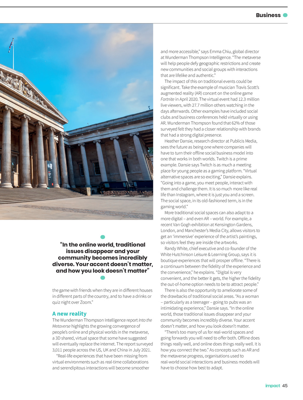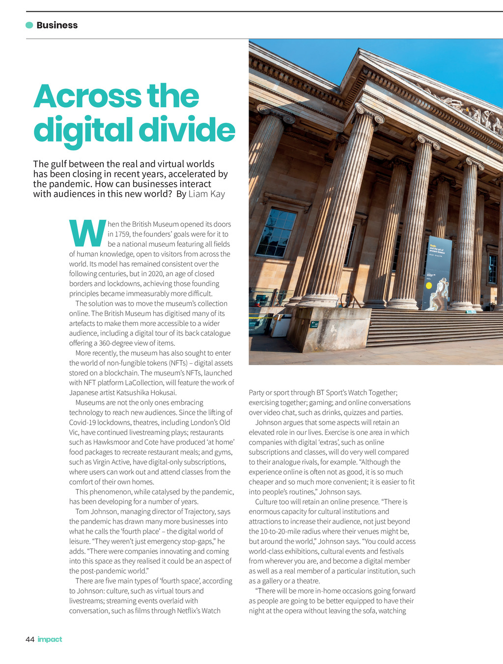 Business Across the digital divide The gulf between the real and virtual worlds has been closing in recent years, accelerated by the pandemic. How can businesses interact with audiences in this new world? By Liam Kay W hen the British Museum opened its doors in 1759, the founders goals were for it to be a national museum featuring all fields of human knowledge, open to visitors from across the world. Its model has remained consistent over the following centuries, but in 2020, an age of closed borders and lockdowns, achieving those founding principles became immeasurably more difficult. The solution was to move the museums collection online. The British Museum has digitised many of its artefacts to make them more accessible to a wider audience, including a digital tour of its back catalogue offering a 360-degree view of items. More recently, the museum has also sought to enter the world of non-fungible tokens (NFTs) digital assets stored on a blockchain. The museums NFTs, launched with NFT platform LaCollection, will feature the work of Japanese artist Katsushika Hokusai. Museums are not the only ones embracing technology to reach new audiences. Since the lifting of Covid-19 lockdowns, theatres, including Londons Old Vic, have continued livestreaming plays; restaurants such as Hawksmoor and Cote have produced at home food packages to recreate restaurant meals; and gyms, such as Virgin Active, have digital-only subscriptions, where users can work out and attend classes from the comfort of their own homes. This phenomenon, while catalysed by the pandemic, has been developing for a number of years. Tom Johnson, managing director of Trajectory, says the pandemic has drawn many more businesses into what he calls the fourth place the digital world of leisure. They werent just emergency stop-gaps, he adds. There were companies innovating and coming into this space as they realised it could be an aspect of the post-pandemic world. There are five main types of fourth space, according to Johnson: culture, such as virtual tours and livestreams; streaming events overlaid with conversation, such as films through Netflixs Watch Party or sport through BT Sports Watch Together; exercising together; gaming; and online conversations over video chat, such as drinks, quizzes and parties. Johnson argues that some aspects will retain an elevated role in our lives. Exercise is one area in which companies with digital extras, such as online subscriptions and classes, will do very well compared to their analogue rivals, for example. Although the experience online is often not as good, it is so much cheaper and so much more convenient; it is easier to fit into peoples routines, Johnson says. Culture too will retain an online presence. There is enormous capacity for cultural institutions and attractions to increase their audience, not just beyond the 10-to-20-mile radius where their venues might be, but around the world, Johnson says. You could access world-class exhibitions, cultural events and festivals from wherever you are, and become a digital member as well as a real member of a particular institution, such as a gallery or a theatre. There will be more in-home occasions going forward as people are going to be better equipped to have their night at the opera without leaving the sofa, watching 44 Impact ISSUE 36 2022_pp44-45 Subscription Services.indd 44 08/12/2021 10:14