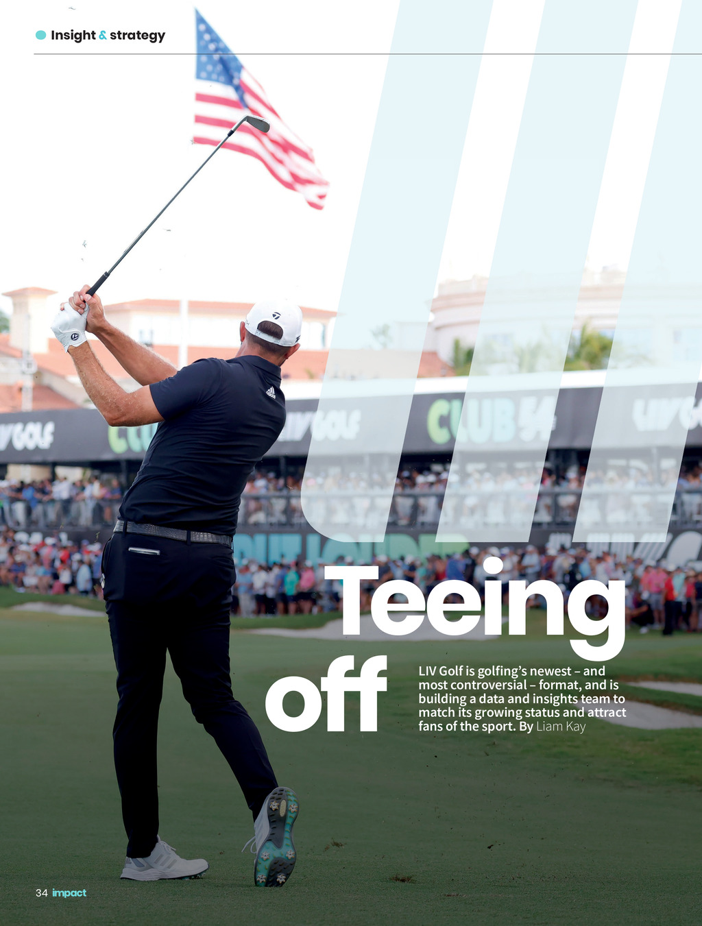 Insight & strategy Teeing off LIV Golf is golngs newest and most controversial format, and is building a data and insights team to match its growing status and attract fans of the sport. By Liam Kay 34 Impact ISSUE 40 2022_pp34-37 I&S LIV Golf.indd 34 13/12/2022 11:40