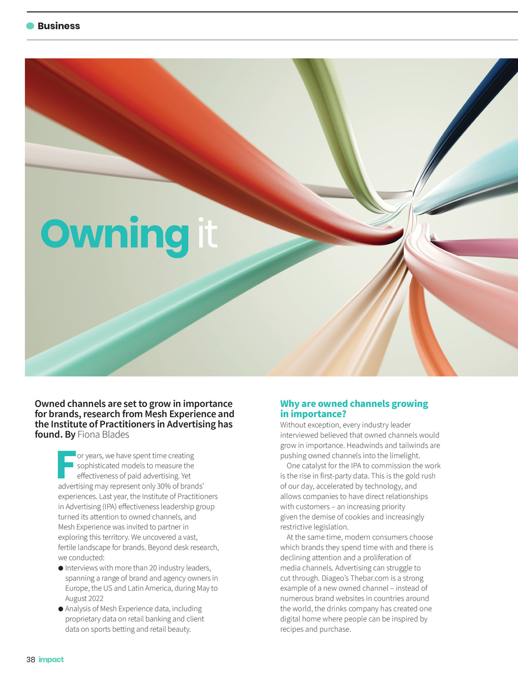 Business Owning it Owned channels are set to grow in importance for brands, research from Mesh Experience and the Institute of Practitioners in Advertising has found. By Fiona Blades F or years, we have spent time creating sophisticated models to measure the effectiveness of paid advertising. Yet advertising may represent only 30% of brands experiences. Last year, the Institute of Practitioners in Advertising (IPA) effectiveness leadership group turned its attention to owned channels, and Mesh Experience was invited to partner in exploring this territory. We uncovered a vast, fertile landscape for brands. Beyond desk research, we conducted: Interviews with more than 20 industry leaders, spanning a range of brand and agency owners in Europe, the US and Latin America, during May to August 2022 Analysis of Mesh Experience data, including proprietary data on retail banking and client data on sports betting and retail beauty. Why are owned channels growing in importance? Without exception, every industry leader interviewed believed that owned channels would grow in importance. Headwinds and tailwinds are pushing owned channels into the limelight. One catalyst for the IPA to commission the work is the rise in first-party data. This is the gold rush of our day, accelerated by technology, and allows companies to have direct relationships with customers an increasing priority given the demise of cookies and increasingly restrictive legislation. At the same time, modern consumers choose which brands they spend time with and there is declining attention and a proliferation of media channels. Advertising can struggle to cut through. Diageos Thebar.com is a strong example of a new owned channel instead of numerous brand websites in countries around the world, the drinks company has created one digital home where people can be inspired by recipes and purchase. 38 Impact ISSUE 40 2022_pp38-39_Business owned channels.indd 38 13/12/2022 11:41
