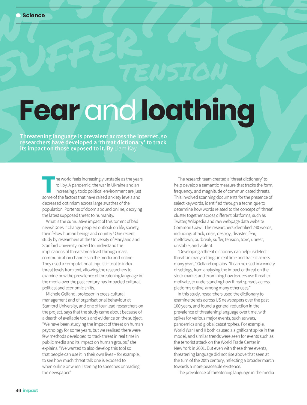 Science Fear and loathing Threatening language is prevalent across the internet, so researchers have developed a threat dictionary to track its impact on those exposed to it. By Liam Kay T he world feels increasingly unstable as the years roll by. A pandemic, the war in Ukraine and an increasingly toxic political environment are just some of the factors that have raised anxiety levels and decreased optimism across large swathes of the population. Portents of doom abound online, decrying the latest supposed threat to humanity. What is the cumulative impact of this torrent of bad news? Does it change peoples outlook on life, society, their fellow human beings and country? One recent study by researchers at the University of Maryland and Stanford University looked to understand the implications of threats broadcast through mass communication channels in the media and online. They used a computational linguistic tool to index threat levels from text, allowing the researchers to examine how the prevalence of threatening language in the media over the past century has impacted cultural, political and economic shifts. Michele Gelfand, professor in cross-cultural management and of organisational behaviour at Stanford University, and one of four lead researchers on the project, says that the study came about because of a dearth of available tools and evidence on the subject. We have been studying the impact of threat on human psychology for some years, but we realised there were few methods developed to track threat in real time in public media and its impact on human groups, she explains. We wanted to also develop this tool so that people can use it in their own lives for example, to see how much threat talk one is exposed to when online or when listening to speeches or reading the newspaper. The research team created a threat dictionary to help develop a semantic measure that tracks the form, frequency, and magnitude of communicated threats. This involved scanning documents for the presence of select keywords, identified through a technique to determine how words related to the concept of threat cluster together across different platforms, such as Twitter, Wikipedia and raw webpage data website Common Crawl. The researchers identified 240 words, including: attack, crisis, destroy, disaster, fear, meltdown, outbreak, suffer, tension, toxic, unrest, unstable, and violent. Developing a threat dictionary can help us detect threats in many settings in real time and track it across many years, Gelfand explains. It can be used in a variety of settings, from analysing the impact of threat on the stock market and examining how leaders use threat to motivate, to understanding how threat spreads across platforms online, among many other uses. In this study, researchers used the dictionary to examine trends across US newspapers over the past 100 years, and found a general reduction in the prevalence of threatening language over time, with spikes for various major events, such as wars, pandemics and global catastrophes. For example, World War I and II both caused a significant spike in the model, and similar trends were seen for events such as the terrorist attack on the World Trade Center in New York in 2001. But even with these three events, threatening language did not rise above that seen at the turn of the 20th century, reflecting a broader march towards a more peaceable existence. The prevalence of threatening language in the media 46 Impact ISSUE 40 2022_pp46-47_Science.indd 46 13/12/2022 11:58