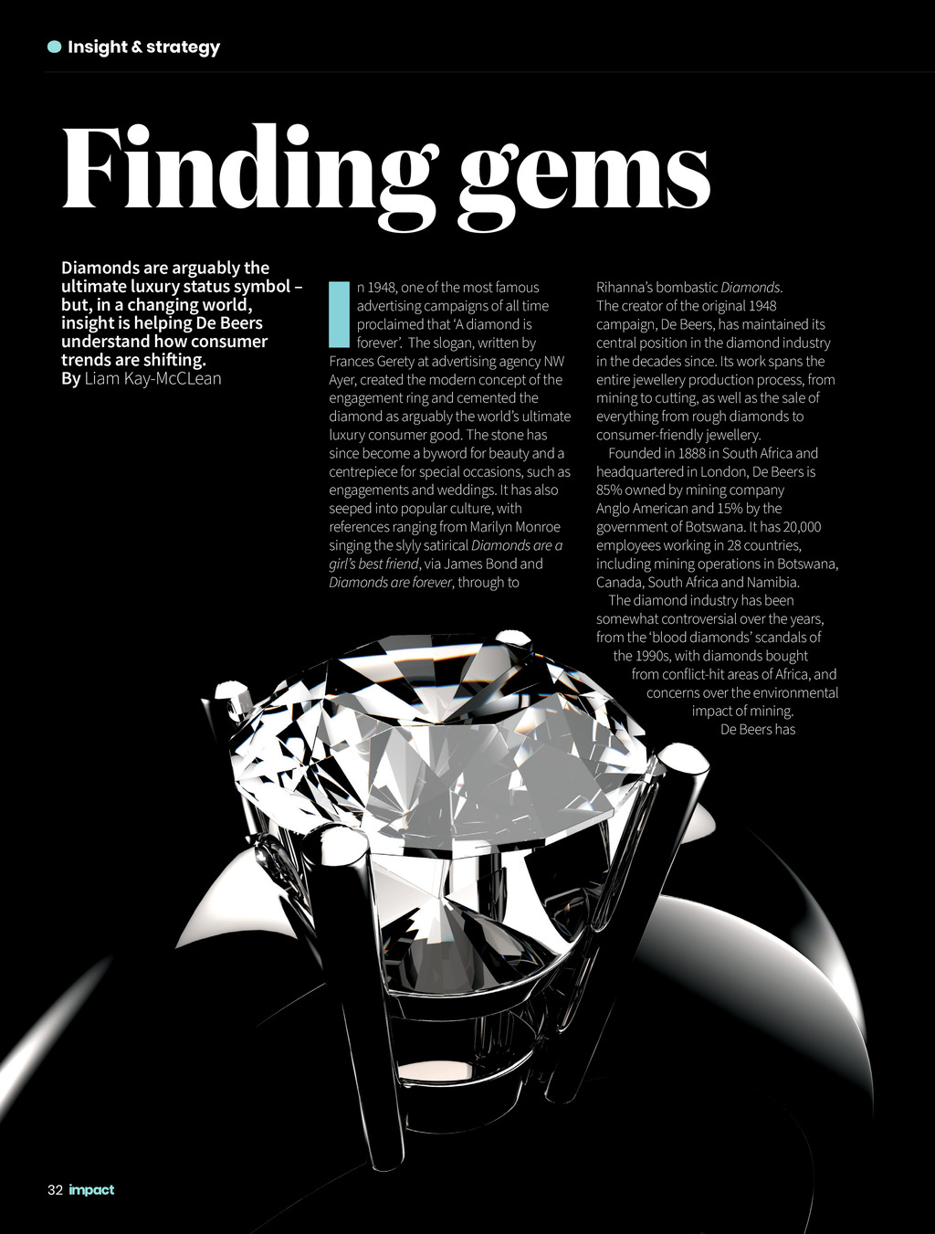 Insight & strategy Finding gems Diamonds are arguably the ultimate luxury status symbol but, in a changing world, insight is helping De Beers understand how consumer trends are shifting. By Liam Kay-McCLean I n 1948, one of the most famous advertising campaigns of all time proclaimed that A diamond is forever. The slogan, written by Frances Gerety at advertising agency NW Ayer, created the modern concept of the engagement ring and cemented the diamond as arguably the worlds ultimate luxury consumer good. The stone has since become a byword for beauty and a centrepiece for special occasions, such as engagements and weddings. It has also seeped into popular culture, with references ranging from Marilyn Monroe singing the slyly satirical Diamonds are a girls best friend, via James Bond and Diamonds are forever, through to Rihannas bombastic Diamonds. The creator of the original 1948 campaign, De Beers, has maintained its central position in the diamond industry in the decades since. Its work spans the entire jewellery production process, from mining to cutting, as well as the sale of everything from rough diamonds to consumer-friendly jewellery. Founded in 1888 in South Africa and headquartered in London, De Beers is 85% owned by mining company Anglo American and 15% by the government of Botswana. It has 20,000 employees working in 28 countries, including mining operations in Botswana, Canada, South Africa and Namibia. The diamond industry has been somewhat controversial over the years, from the blood diamonds scandals of the 1990s, with diamonds bought from conflict-hit areas of Africa, and concerns over the environmental impact of mining. De Beers has 32 Impact ISSUE 42 2023_pp32-35 I&S De Beers.indd 32 16/06/2023 17:12