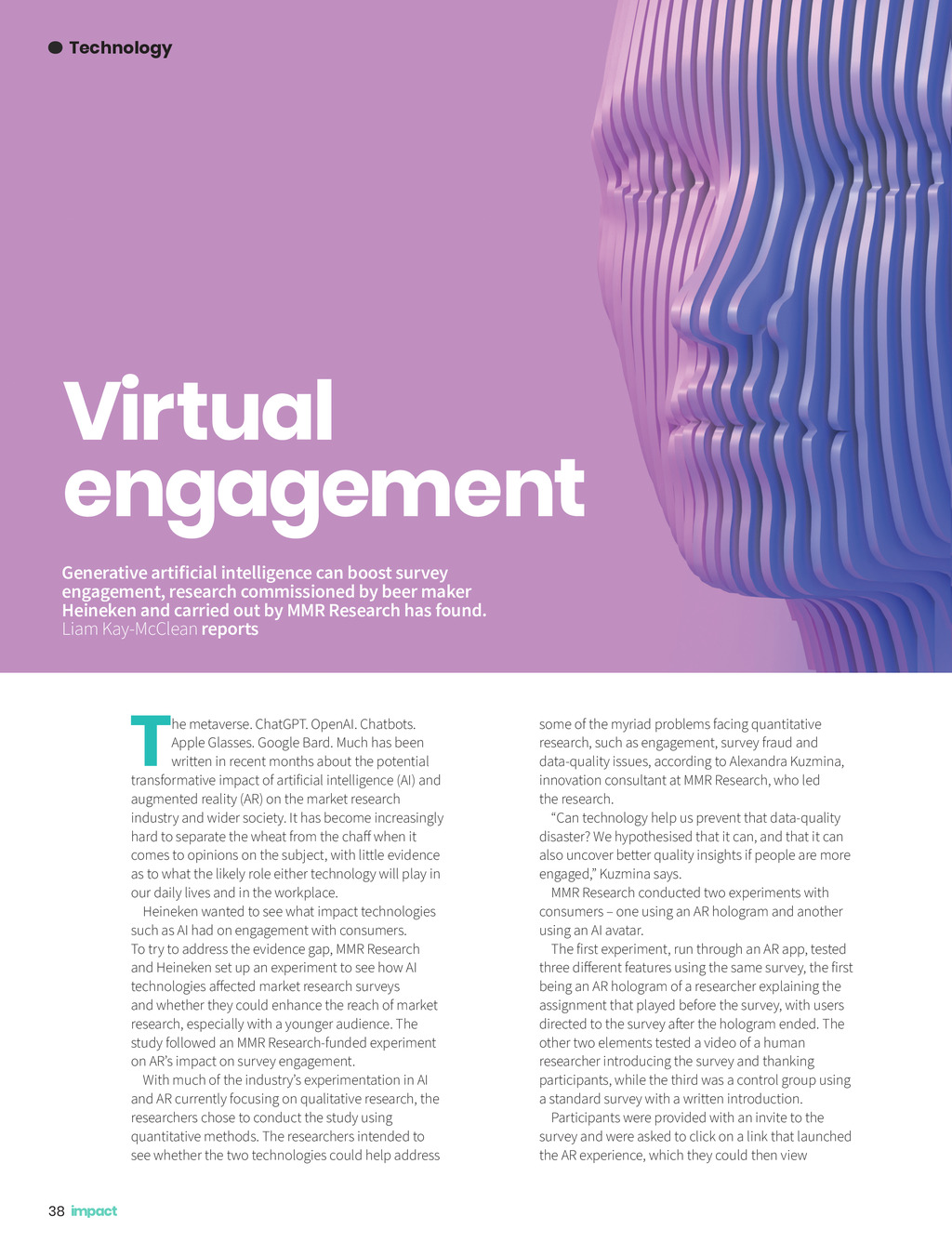 Technology Virtual engagement Generative artificial intelligence can boost survey engagement, research commissioned by beer maker Heineken and carried out by MMR Research has found. Liam Kay-McClean reports T he metaverse. ChatGPT. OpenAI. Chatbots. Apple Glasses. Google Bard. Much has been written in recent months about the potential transformative impact of artificial intelligence (AI) and augmented reality (AR) on the market research industry and wider society. It has become increasingly hard to separate the wheat from the chaff when it comes to opinions on the subject, with little evidence as to what the likely role either technology will play in our daily lives and in the workplace. Heineken wanted to see what impact technologies such as AI had on engagement with consumers. To try to address the evidence gap, MMR Research and Heineken set up an experiment to see how AI technologies affected market research surveys and whether they could enhance the reach of market research, especially with a younger audience. The study followed an MMR Research-funded experiment on ARs impact on survey engagement. With much of the industrys experimentation in AI and AR currently focusing on qualitative research, the researchers chose to conduct the study using quantitative methods. The researchers intended to see whether the two technologies could help address some of the myriad problems facing quantitative research, such as engagement, survey fraud and data-quality issues, according to Alexandra Kuzmina, innovation consultant at MMR Research, who led the research. Can technology help us prevent that data-quality disaster? We hypothesised that it can, and that it can also uncover better quality insights if people are more engaged, Kuzmina says. MMR Research conducted two experiments with consumers one using an AR hologram and another using an AI avatar. The first experiment, run through an AR app, tested three different features using the same survey, the first being an AR hologram of a researcher explaining the assignment that played before the survey, with users directed to the survey after the hologram ended. The other two elements tested a video of a human researcher introducing the survey and thanking participants, while the third was a control group using a standard survey with a written introduction. Participants were provided with an invite to the survey and were asked to click on a link that launched the AR experience, which they could then view 38 Impact ISSUE 42 2023_pp38-39_Virtual Engagement.indd 38 16/06/2023 17:13