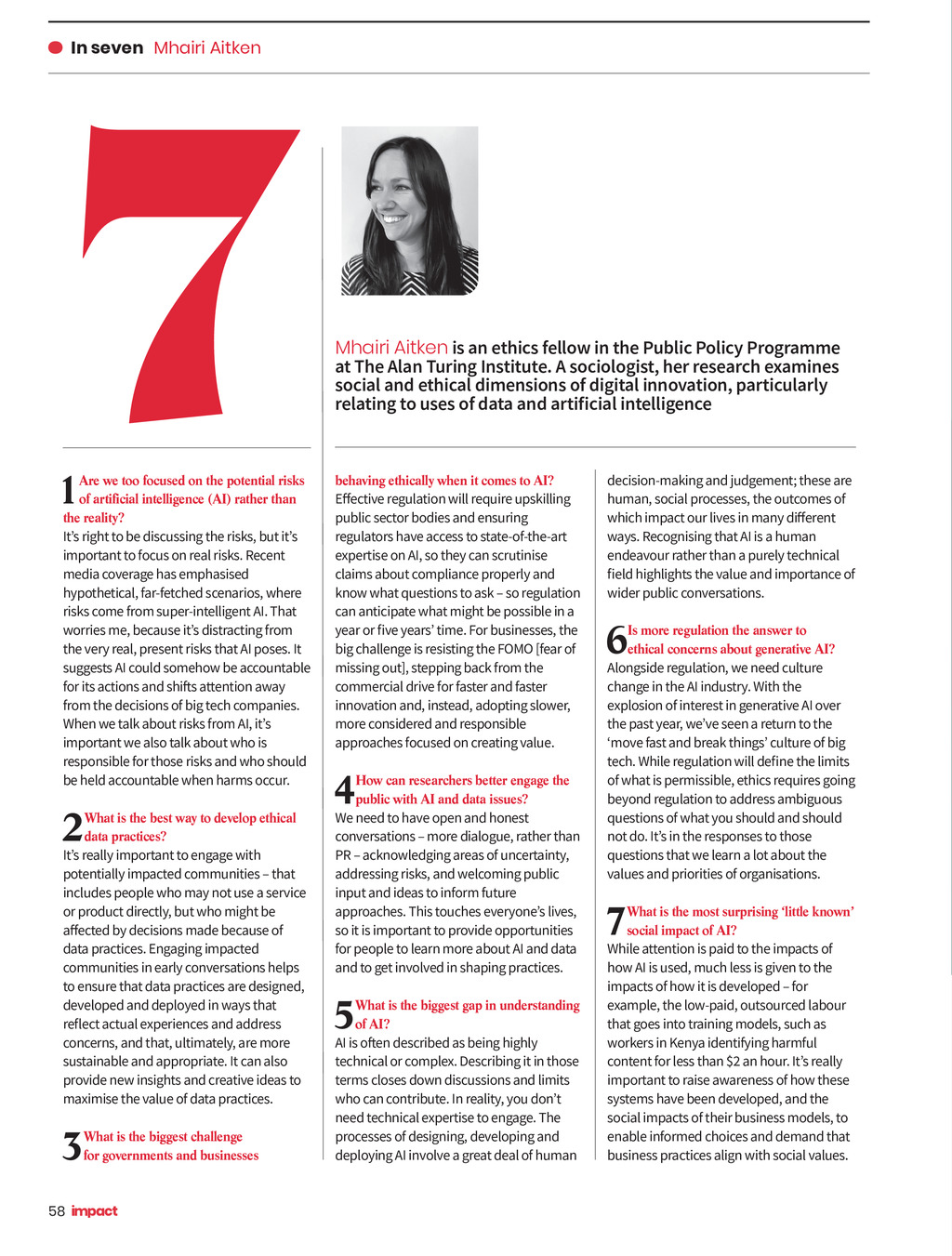7 In seven Mhairi Aitken 1 Are we too focused on the potential risks of artificial intelligence (AI) rather than the reality? Its right to be discussing the risks, but its important to focus on real risks. Recent media coverage has emphasised hypothetical, far-fetched scenarios, where risks come from super-intelligent AI. That worries me, because its distracting from the very real, present risks that AI poses. It suggests AI could somehow be accountable for its actions and shifts attention away from the decisions of big tech companies. When we talk about risks from AI, its important we also talk about who is responsible for those risks and who should be held accountable when harms occur. 2 What is the best way to develop ethical data practices? Its really important to engage with potentially impacted communities that includes people who may not use a service or product directly, but who might be aected by decisions made because of data practices. Engaging impacted communities in early conversations helps to ensure that data practices are designed, developed and deployed in ways that reect actual experiences and address concerns, and that, ultimately, are more sustainable and appropriate. It can also provide new insights and creative ideas to maximise the value of data practices. 3 What is the biggest challenge for governments and businesses Mhairi Aitken is an ethics fellow in the Public Policy Programme at The Alan Turing Institute. A sociologist, her research examines social and ethical dimensions of digital innovation, particularly relating to uses of data and articial intelligence behaving ethically when it comes to AI? Eective regulation will require upskilling public sector bodies and ensuring regulators have access to state-of-the-art expertise on AI, so they can scrutinise claims about compliance properly and know what questions to ask so regulation can anticipate what might be possible in a year or ve years time. For businesses, the big challenge is resisting the FOMO [fear of missing out], stepping back from the commercial drive for faster and faster innovation and, instead, adopting slower, more considered and responsible approaches focused on creating value. 4 How can researchers better engage the public with AI and data issues? We need to have open and honest conversations more dialogue, rather than PR acknowledging areas of uncertainty, addressing risks, and welcoming public input and ideas to inform future approaches. This touches everyones lives, so it is important to provide opportunities for people to learn more about AI and data and to get involved in shaping practices. 5 What is the biggest gap in understanding of AI? AI is often described as being highly technical or complex. Describing it in those terms closes down discussions and limits who can contribute. In reality, you dont need technical expertise to engage. The processes of designing, developing and deploying AI involve a great deal of human decision-making and judgement; these are human, social processes, the outcomes of which impact our lives in many dierent ways. Recognising that AI is a human endeavour rather than a purely technical eld highlights the value and importance of wider public conversations. 6 Is more regulation the answer to ethical concerns about generative AI? Alongside regulation, we need culture change in the AI industry. With the explosion of interest in generative AI over the past year, weve seen a return to the move fast and break things culture of big tech. While regulation will dene the limits of what is permissible, ethics requires going beyond regulation to address ambiguous questions of what you should and should not do. Its in the responses to those questions that we learn a lot about the values and priorities of organisations. 7 What is the most surprising little known social impact of AI? While attention is paid to the impacts of how AI is used, much less is given to the impacts of how it is developed for example, the low-paid, outsourced labour that goes into training models, such as workers in Kenya identifying harmful content for less than $2 an hour. Its really important to raise awareness of how these systems have been developed, and the social impacts of their business models, to enable informed choices and demand that business practices align with social values. 58 Impact ISSUE 43 2023_pp58-60 Seven.indd 58 18/09/2023 12:20