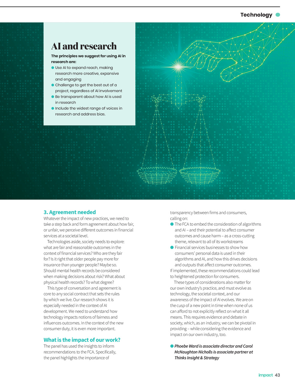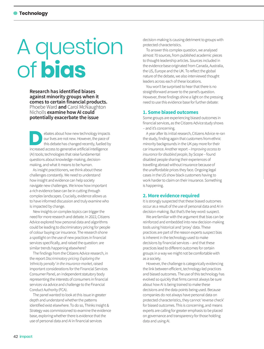 Technology A question of bias Research has identified biases against minority groups when it comes to certain financial products. Phoebe Ward and Carol McNaughton Nicholls examine how AI could potentially exacerbate the issue D ebates about how new technology impacts our lives are not new. However, the pace of this debate has changed recently, fuelled by increased access to generative artificial intelligence (AI) tools; technologies that raise fundamental questions about knowledge-making, decisionmaking, and what it means to be human. As insight practitioners, we think about these challenges constantly. We need to understand how insight and evidence can help society navigate new challenges. We know how important a rich evidence base can be in cutting through complex landscapes. Crucially, evidence allows us to have informed discussion and truly examine who is impacted by change. New insights on complex topics can trigger the need for more research and debate. In 2022, Citizens Advice explored how personal data and algorithms could be leading to discriminatory pricing for people of colour buying car insurance. The research shone a spotlight on the use of new practices in financial services specifically, and raised the question: are similar trends happening elsewhere? The findings from the Citizens Advice research, in the report Discriminatory pricing: Exploring the ethnicity penalty in the insurance market, raised important considerations for the Financial Services Consumer Panel, an independent statutory body representing the interests of consumers in financial services via advice and challenge to the Financial Conduct Authority (FCA). The panel wanted to look at this issue in greater depth and understand whether the patterns identified exist elsewhere. To do so, Thinks Insight & Strategy was commissioned to examine the evidence base, exploring whether there is evidence that the use of personal data and AI in financial services decision-making is causing detriment to groups with protected characteristics. To answer this complex question, we analysed almost 70 sources, from published academic pieces to thought-leadership articles. Sources included in the evidence base originated from Canada, Australia, the US, Europe and the UK. To reflect the global nature of the debate, we also interviewed thought leaders across each of these locations. You wont be surprised to hear that there is no straightforward answer to the panels question. However, three findings shine a light on the pressing need to use this evidence base for further debate: 1. Some biased outcomes Some groups are experiencing biased outcomes in financial services, as the Citizens Advice study shows and its concerning. A year after its initial research, Citizens Advice re-ran the study, finding again that customers from ethnic minority backgrounds in the UK pay more for their car insurance. Another report Improving access to insurance for disabled people, by Scope found disabled people sharing their experiences of travelling abroad without insurance because of the unaffordable prices they face. Ongoing legal cases in the US show black customers having to work harder to claim on their insurance. Something is happening. 2. More evidence required It is strongly suspected that these biased outcomes occur as a result of the use of personal data and AI in decision-making. But thats the key word: suspect. We are familiar with the argument that bias can be reinforced and embedded into new decision-making tools using historical and proxy data. These practices are part of the reason experts suspect bias is inherent in the technology used to make decisions by financial services and that these practices lead to different outcomes for certain groups in a way we might not be comfortable with as a society. However, the challenge is categorically evidencing the link between efficient, technology-led practices and biased outcomes. The use of this technology has evolved so quickly that firms cannot always be sure about how AI is being trained to make these decisions and the data points being used. Because companies do not always have personal data on protected characteristics, they cannot reverse check for biased outcomes. This is concerning, and means experts are calling for greater emphasis to be placed on governance and transparency for those holding data and using AI. 42 Impact ISSUE 44 2023_pp42-43 Tech.indd 42 05/12/2023 12:13