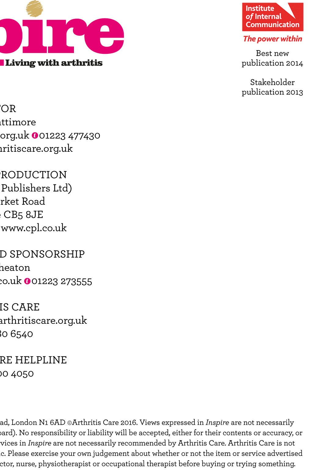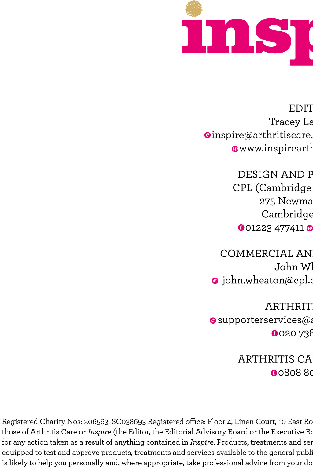 Best new publication 2014 Stakeholder publication 2013 EdITOR Tracey Lattimore inspire@arthritiscare.org.uk 01223 477430 www.inspirearthritiscare.org.uk dESIGn and pROdUCTIOn CpL (Cambridge publishers Ltd) 275 newmarket Road Cambridge CB5 8JE 01223 477411 www.cpl.co.uk COMMERCIaL and SpOnSORSHIp John Wheaton john.wheaton@cpl.co.uk 01223 273555 aRTHRITIS CaRE supporterservices@arthritiscare.org.uk 020 7380 6540 aRTHRITIS CaRE HELpLInE 0808 800 4050 Registered Charity nos: 206563, SC038693 Registered office: Floor 4, Linen Court, 10 East Road, London n1 6ad arthritis Care 2014. Views expressed in Inspire are not necessarily those of arthritis Care or Inspire (the Editor, the Editorial advisory Board or the Executive Board). no responsibility or liability will be accepted, either for their contents or accuracy, or for any action taken as a result of anything contained in Inspire. products, treatments and services in Inspire are not necessarily recommended by arthritis Care. arthritis Care is not equipped to test and approve products, treatments and services available to the general public. please exercise your own judgement about whether or not the item or service advertised is likely to help you personally and, where appropriate, take professional advice from your doctor, nurse, physiotherapist or occupational therapist before buying or trying something.