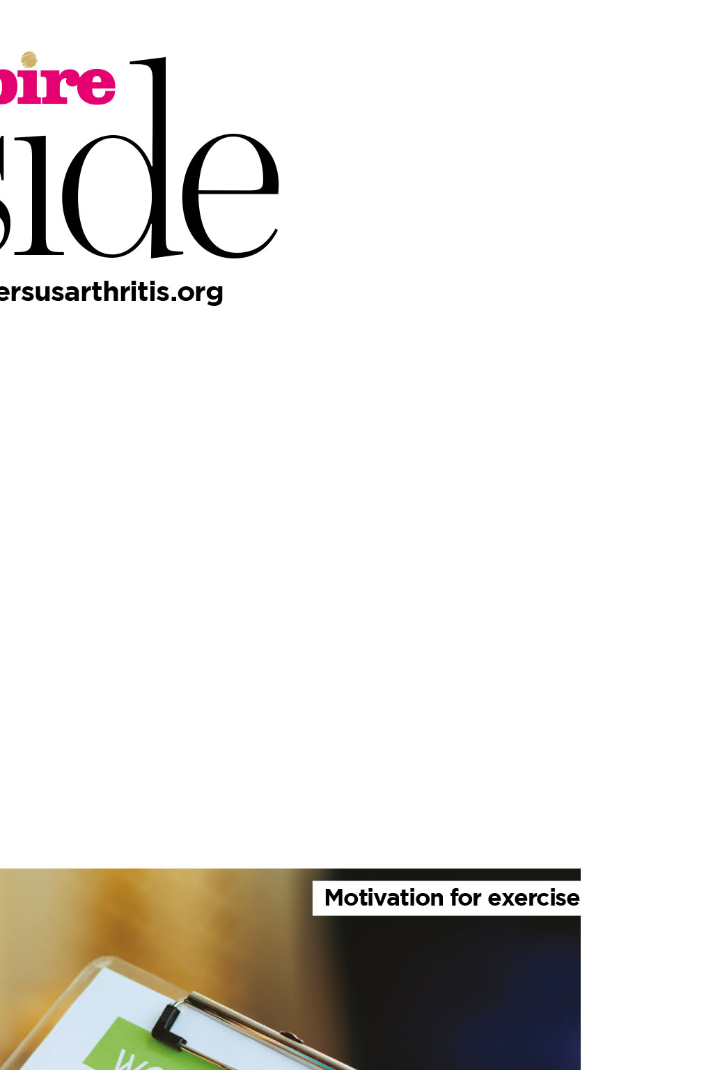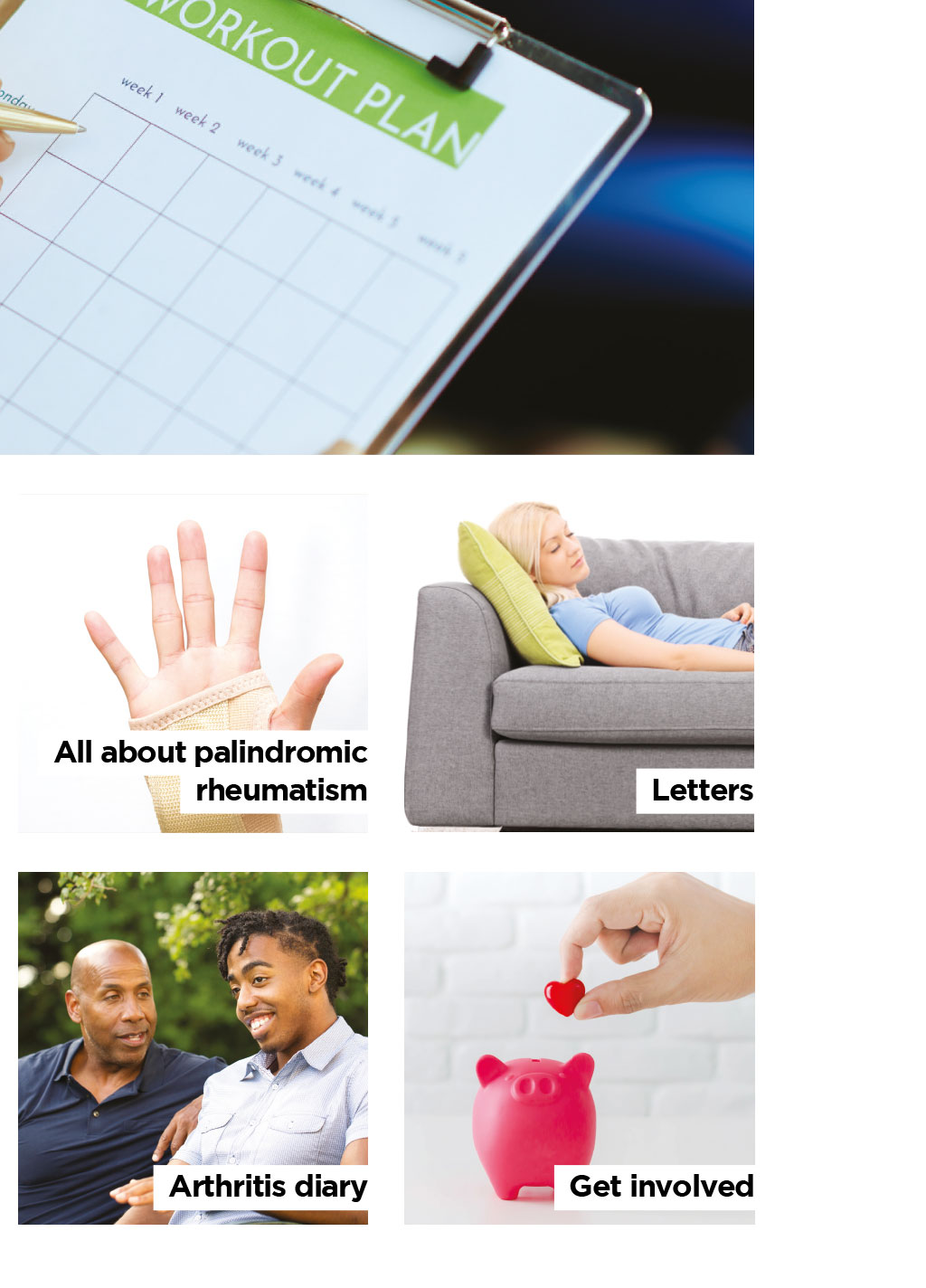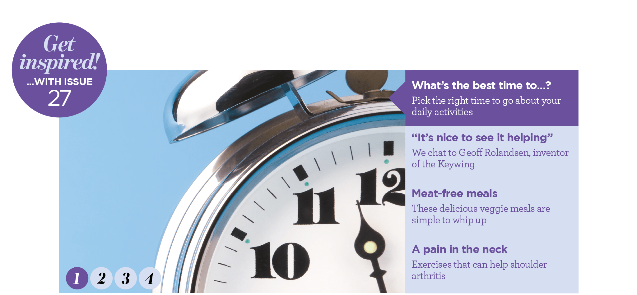 Inside Get inspired! Autumn 2019 versusarthritis.org ...WITH ISSUE Whats the best time to...? 27 ick the right time to go about your P daily activities Its nice to see it helping e chat to Geoff Rolandsen, inventor W of the Keywing Meat-free meals hese delicious veggie meals are T simple to whip up A pain in the neck 1 2 xercises that can help shoulder E arthritis 3 4 Motivation for exercise Gadgets Day in the life All about palindromic rheumatism Ask the doctor Health News Arthritis diary Letters Get involved