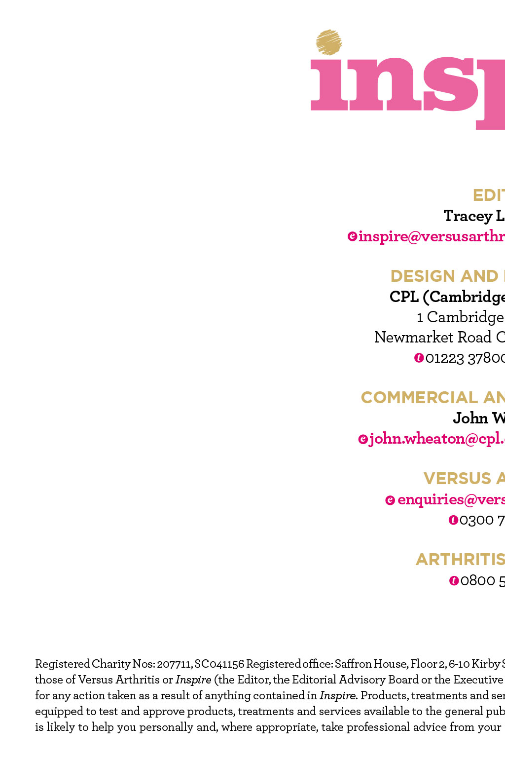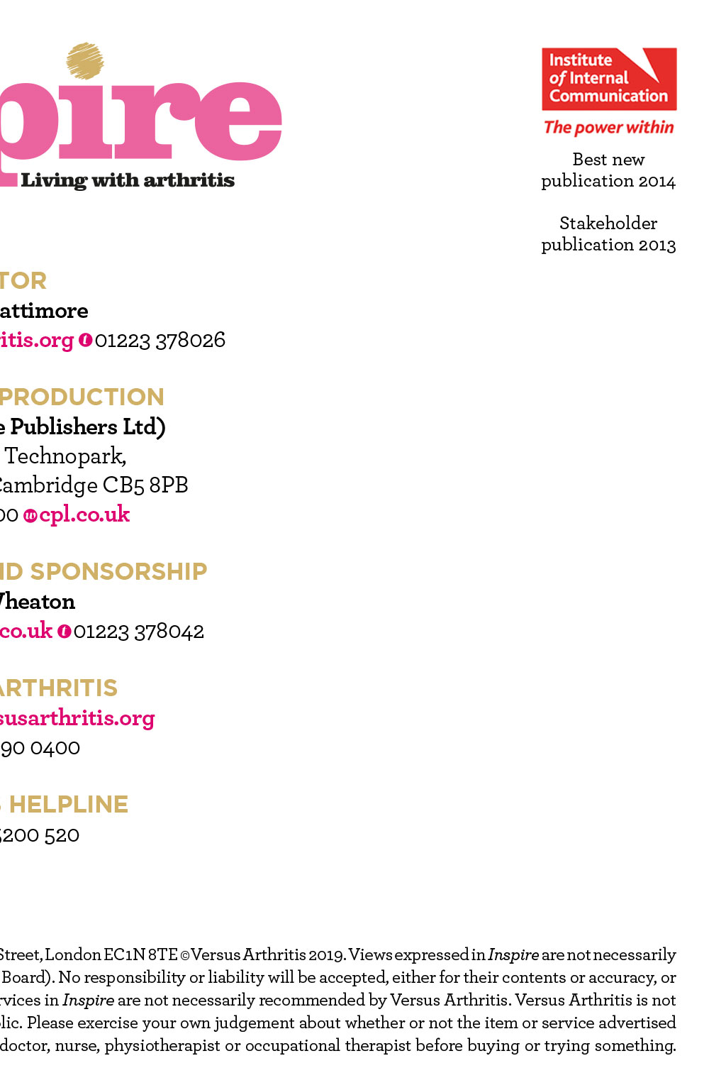 Best new publication 2014 Stakeholder publication 2013 EDITOR Tracey Lattimore inspire@versusarthritis.org 01223 378026 DESIGN AND PRODUCTION CPL (Cambridge Publishers Ltd) 1 Cambridge Technopark, Newmarket Road Cambridge CB5 8PB 01223 378000 cpl.co.uk COMMERCIAL AND SPONSORSHIP John Wheaton john.wheaton@cpl.co.uk 01223 378042 VERSUS ARTHRITIS enquiries@versusarthritis.org 0300 790 0400 ARTHRITIS HELPLINE 0800 5200 520 Registered Charity Nos: 207711, SC041156 Registered office: Saffron House, Floor 2, 6-10 Kirby Street, London EC1N 8TE Versus Arthritis 2019. Views expressed in Inspire are not necessarily those of Versus Arthritis or Inspire (the Editor, the Editorial Advisory Board or the Executive Board). No responsibility or liability will be accepted, either for their contents or accuracy, or for any action taken as a result of anything contained in Inspire. Products, treatments and services in Inspire are not necessarily recommended by Versus Arthritis. Versus Arthritis is not equipped to test and approve products, treatments and services available to the general public. Please exercise your own judgement about whether or not the item or service advertised is likely to help you personally and, where appropriate, take professional advice from your doctor, nurse, physiotherapist or occupational therapist before buying or trying something.