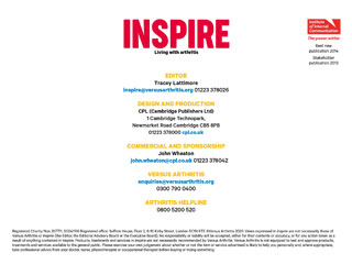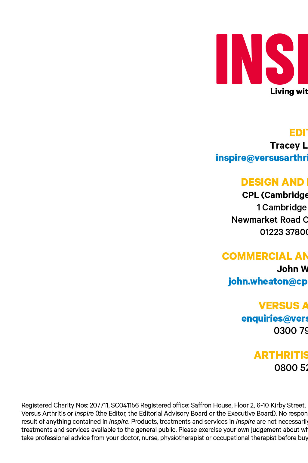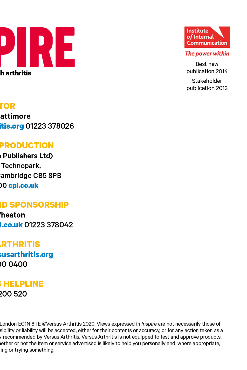 inspire Living with arthritis EDITOR Tracey Lattimore inspire@versusarthritis.org 01223 378026 DESIGN AND PRODUCTION CPL (Cambridge Publishers Ltd) 1 Cambridge Technopark, Newmarket Road Cambridge CB5 8PB 01223 378000 cpl.co.uk COMMERCIAL AND SPONSORSHIP John Wheaton john.wheaton@cpl.co.uk 01223 378042 VERSUS ARTHRITIS enquiries@versusarthritis.org 0300 790 0400 ARTHRITIS HELPLINE 0800 5200 520 Best new publication 2014 Stakeholder publication 2013 Registered Charity Nos: 207711, SC041156 Registered office: Saffron House, Floor 2, 6-10 Kirby Street, London EC1N 8TE ©Versus Arthritis 2020. Views expressed in Inspire are not necessarily those of Versus Arthritis or Inspire (the Editor, the Editorial Advisory Board or the Executive Board). No responsibility or liability will be accepted, either for their contents or accuracy, or for any action taken as a result of anything contained in Inspire. Products, treatments and services in Inspire are not necessarily recommended by Versus Arthritis. Versus Arthritis is not equipped to test and approve products, treatments and services available to the general public. Please exercise your own judgement about whether or not the item or service advertised is likely to help you personally and, where appropriate, take professional advice from your doctor, nurse, physiotherapist or occupational therapist before buying or trying something.