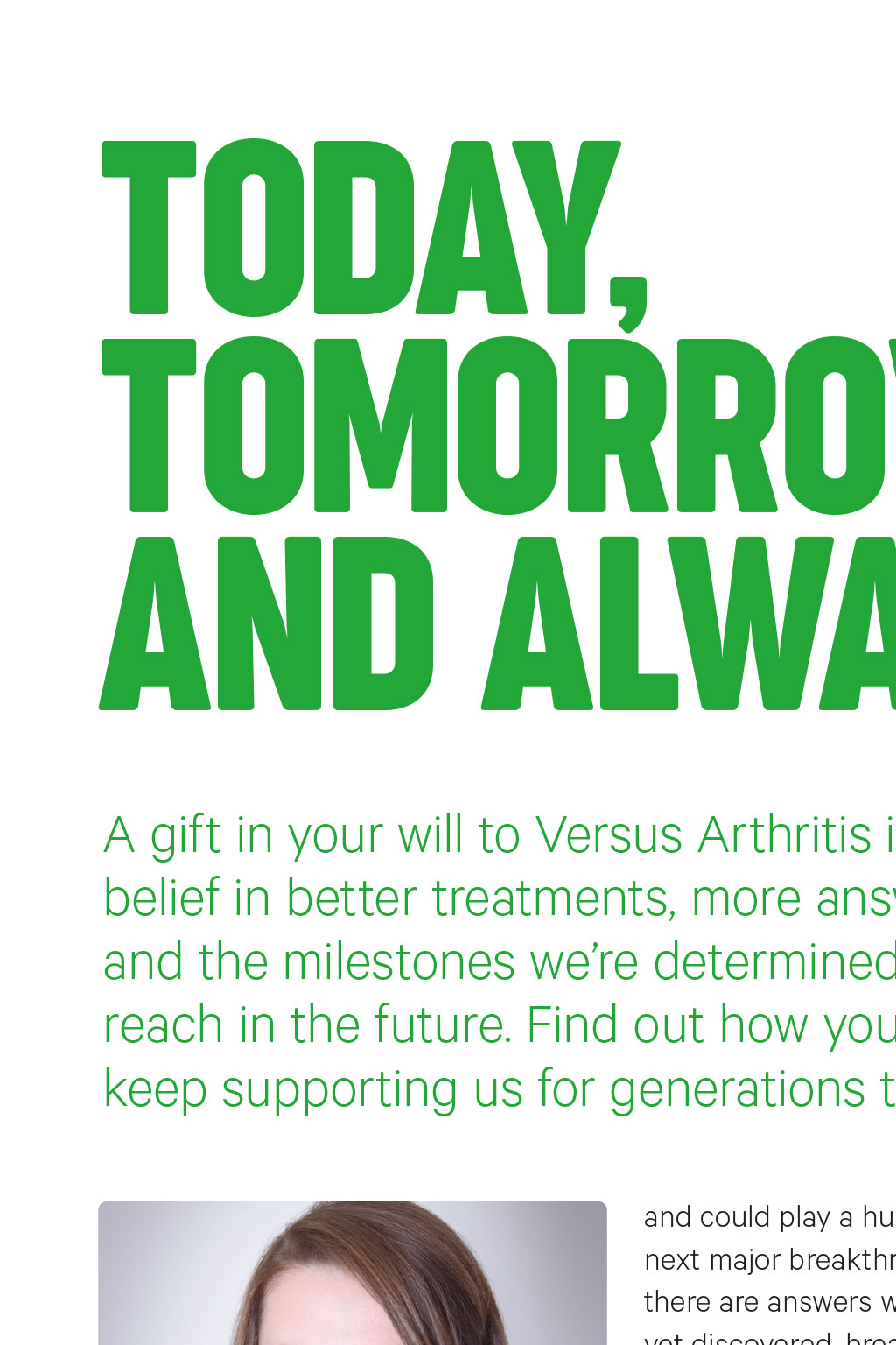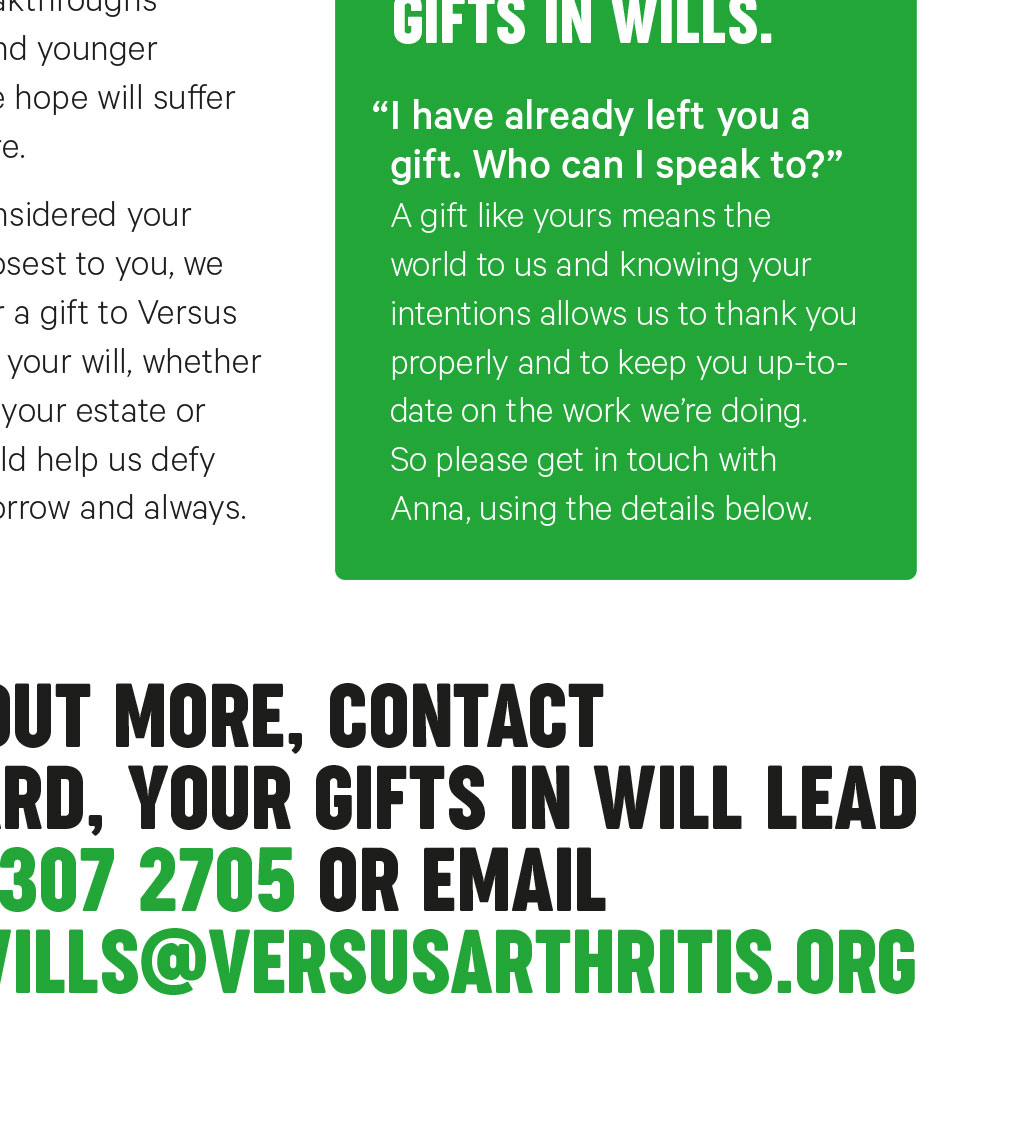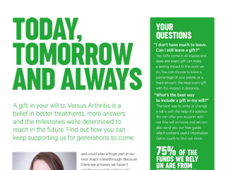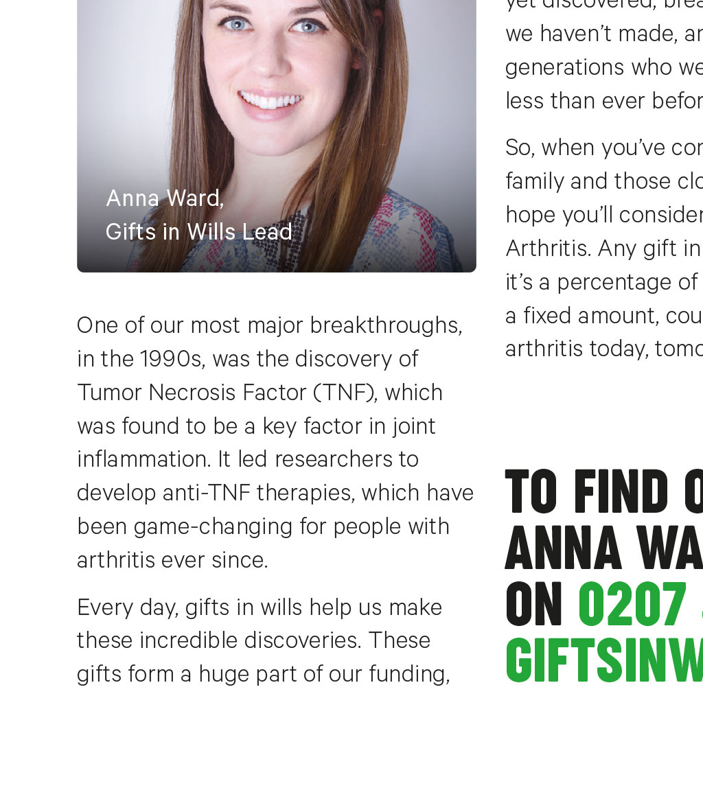 TODAY, TOMORROW AND ALWAYS A gift in your will to Versus Arthritis is a belief in better treatments, more answers and the milestones were determined to reach in the future. Find out how you can keep supporting us for generations to come. and could play a huge part in our next major breakthrough. Because there are answers we havent yet discovered, breakthroughs we havent made, and younger generations who we hope will suffer less than ever before. Anna Ward, Gifts in Wills Lead One of our most major breakthroughs, in the 1990s, was the discovery of Tumor Necrosis Factor (TNF), which was found to be a key factor in joint inflammation. It led researchers to develop anti-TNF therapies, which have been game-changing for people with arthritis ever since. Every day, gifts in wills help us make these incredible discoveries. These gifts form a huge part of our funding, So, when youve considered your family and those closest to you, we hope youll consider a gift to Versus Arthritis. Any gift in your will, whether its a percentage of your estate or a fixed amount, could help us defy arthritis today, tomorrow and always. YOUR QUESTIONS I dont have much to leave. Can I still leave a gift? Yes. Gifts come in all shapes and sizes and every gift can make a lasting impact to the work we do. You can choose to leave a percentage of your estate, or a fixed amount. We treat every gift with the respect it deserves. Whats the best way to include a gift in my will? The best way to write or change a will is with the help of a solicitor. We can offer you support with our free will services and we can also send you our free guide which contains useful information. Get in touch to find out more. 75% of the funds we rely on are from gifts in wills. I have already left you a gift. Who can I speak to? A gift like yours means the world to us and knowing your intentions allows us to thank you properly and to keep you up-todate on the work were doing. So please get in touch with Anna, using the details below. To find out more, contact Anna Ward, your Gifts in Will Lead on 0207 307 2705 or email giftsinwills@versusarthritis.org