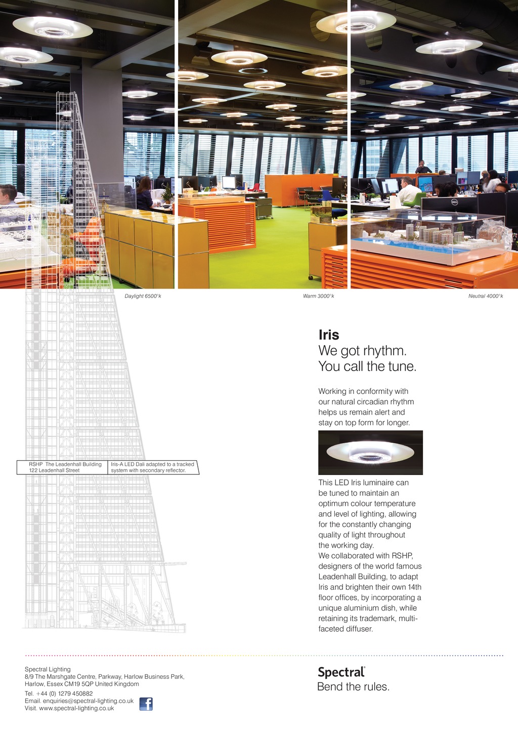 Daylight 6500k Warm 3000k Neutral 4000k Iris We got rhythm. You call the tune. Working in conformity with our natural circadian rhythm helps us remain alert and stay on top form for longer. RSHP The Leadenhall Building 122 Leadenhall Street Iris-A LED Dali adapted to a tracked system with secondary reector. This LED Iris luminaire can be tuned to maintain an optimum colour temperature and level of lighting, allowing for the constantly changing quality of light throughout the working day. We collaborated with RSHP, designers of the world famous Leadenhall Building, to adapt Iris and brighten their own 14th oor ofces, by incorporating a unique aluminium dish, while retaining its trademark, multifaceted diffuser. Spectral Lighting 8/9 The Marshgate Centre, Parkway, Harlow Business Park, Harlow, Essex CM19 5QP United Kingdom Tel. +44 (0) 1279 450882 Email. enquiries@spectral-lighting.co.uk Visit. 18 www.spectral-lighting.co.uk December 2018 www.cibsejournal.com p18_CIBSELIGHTDec18.indd 18 Bend the rules. 15/11/2018 10:36