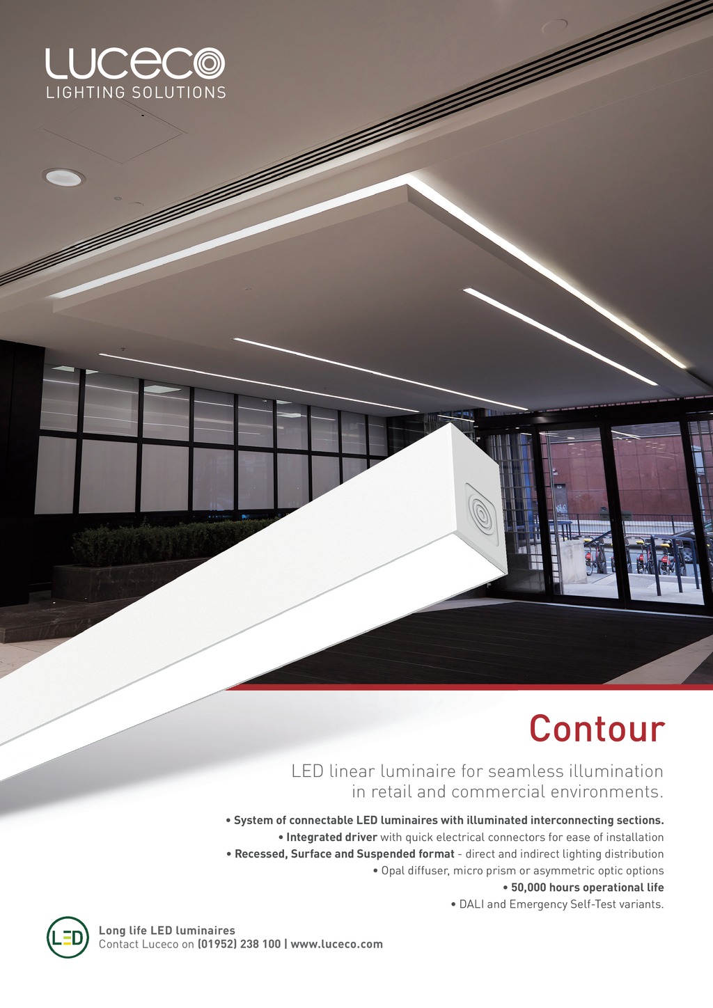 LIGHTING SOLUTIONS Contour LED linear luminaire for seamless seam illumination in retail and commercial commerc environments. System of connectable LED luminaires with illuminated interconnecting sections. Integrated driver with quick electrical connectors connecto for ease of installation Recessed, Surface and Suspended format - direct and ind indirect lighting distribution Opal diffuser, micro prism or asymmetric optic options 50,00 50,000 hours operational life DALI and Emergency Emer Self-Test variants. Long life LED luminaires Contact Luceco on (01952) 238 100 | www.luceco.com 24 December 2018 www.cibsejournal.com p24_CIBSELIGHTDec18.indd 24 15/11/2018 10:42