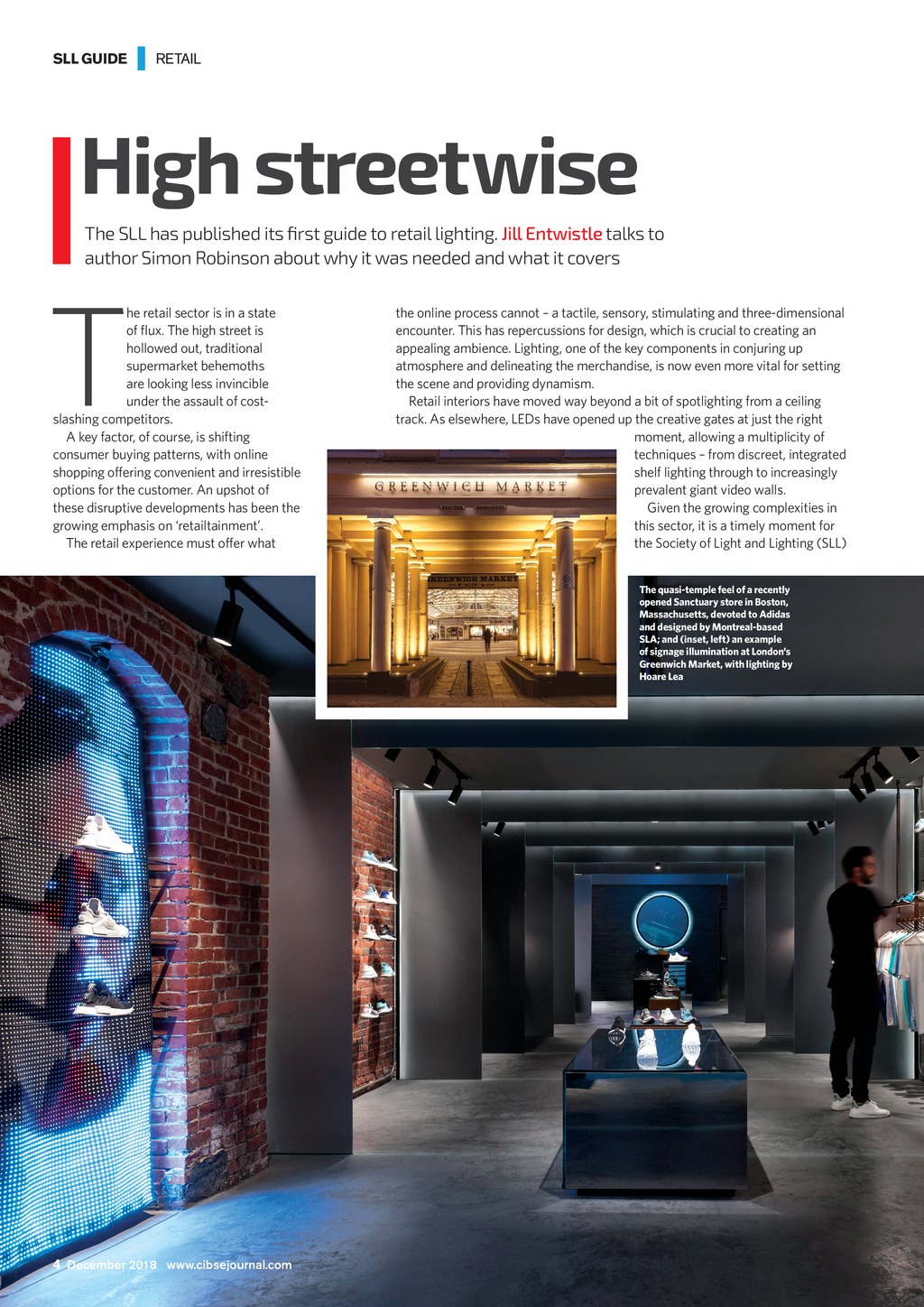 SLL guide | Retail High streetwise The SLL has published its first guide to retail lighting. Jill Entwistle talks to author Simon Robinson about why it was needed and what it covers T he retail sector is in a state of flux. The high street is hollowed out, traditional supermarket behemoths are looking less invincible under the assault of costslashingcompetitors. A key factor, of course, is shifting consumer buying patterns, with online shopping offering convenient and irresistible options for the customer. An upshot of these disruptive developments has been the growing emphasis on retailtainment. The retail experience must offer what the online process cannot a tactile, sensory, stimulating and three-dimensional encounter. This has repercussions for design, which is crucial to creating an appealing ambience. Lighting, one of the key components in conjuring up atmosphere and delineating the merchandise, is now even more vital for setting the scene and providing dynamism. Retail interiors have moved way beyond a bit of spotlighting from a ceiling track. As elsewhere, LEDs have opened up the creative gates at just the right moment, allowing a multiplicity of techniques from discreet, integrated shelf lighting through to increasingly prevalent giant video walls. Given the growing complexities in this sector, it is a timely moment for the Society of Light and Lighting (SLL) The quasi-temple feel of a recently opened Sanctuary store in Boston, Massachusetts, devoted to Adidas and designed by Montreal-based SLA; and (inset, left) an example of signage illumination at Londons Greenwich Market, with lighting by Hoare Lea 4 December 2018 www.cibsejournal.com CIBSE Dec18 pp04-06 Supp LG17.indd 4 23/11/2018 12:48