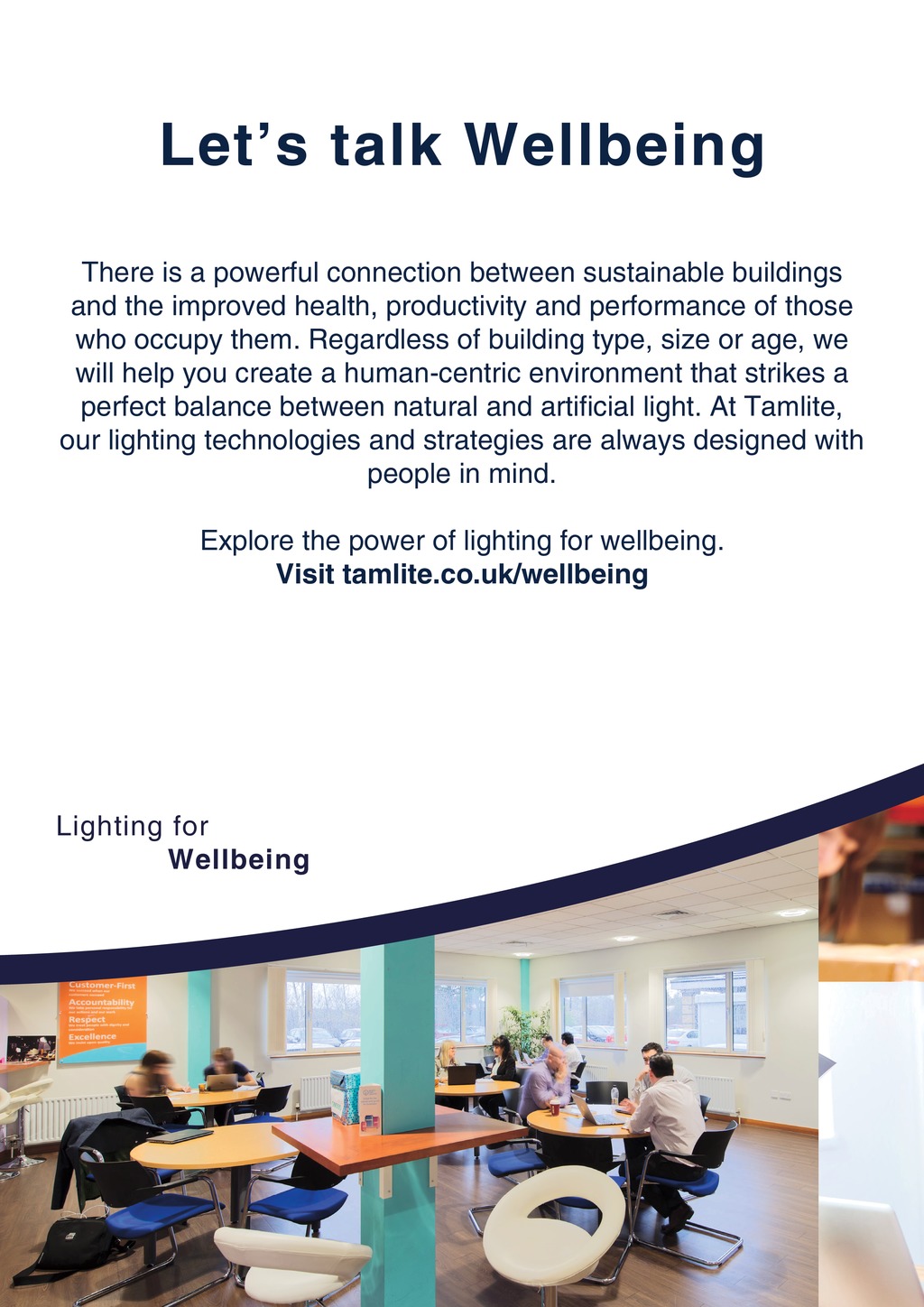 Lets talk Wellbeing There is a powerful connection between sustainable buildings and the improved health, productivity and performance of those who occupy them. Regardless of building type, size or age, we will help you create a human-centric environment that strikes a perfect balance between natural and artificial light. At Tamlite, our lighting technologies and strategies are always designed with people in mind. Explore the power of lighting for wellbeing. Visit tamlite.co.uk/wellbeing Lighting for Wellbeing 8 December 2018 www.cibsejournal.com p08-09_CIBSELIGHTDec18.indd 8 15/11/2018 10:30