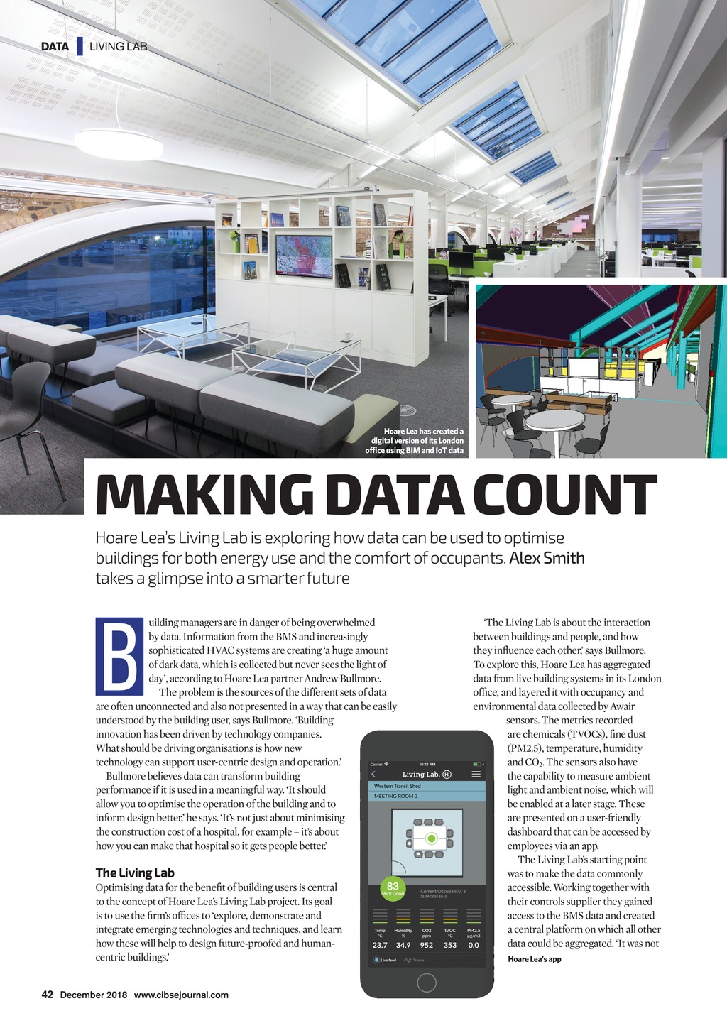 Data | Living lab Hoare Lea has created a digital version of its London office using BIM and IoT data Making data count Hoare Leas Living Lab is exploring how data can be used to optimise buildingsfor both energy use and the comfort of occupants. Alex Smith takesaglimpse into a smarter future B uilding managers are in danger of being overwhelmed by data. Information from the BMS and increasingly sophisticated HVAC systems are creating a huge amount of dark data, which is collected but never sees the light of day, according to Hoare Lea partner Andrew Bullmore. The problem is the sources of the different sets of data are often unconnected and also not presented in a way that can be easily understood by the building user, says Bullmore. Building innovation has been driven by technology companies. What should be driving organisations is how new technology can support user-centric design and operation. Bullmore believes data can transform building performance if it is used in a meaningful way. It should allow you to optimise the operation of the building and to inform design better, he says. Its not just about minimising the construction cost of a hospital, for example its about how you can make that hospital so it gets people better. The Living Lab Optimising data for the benefit of building users is central to the concept of Hoare Leas Living Lab project. Its goal is to use the firms offices to explore, demonstrate and integrate emerging technologies and techniques, and learn how these will help to design future-proofed and humancentric buildings. The Living Lab is about the interaction between buildings and people, and how they influence each other, says Bullmore. To explore this, Hoare Lea has aggregated data from live building systems in its London office, and layered it with occupancy and environmental data collected by Awair sensors. The metrics recorded are chemicals (TVOCs), fine dust (PM2.5), temperature, humidity and CO2. The sensors also have the capability to measure ambient light and ambient noise, which will be enabled at a later stage. These are presented on a user-friendly dashboard that can be accessed by employees via an app. The Living Labs starting point was to make the data commonly accessible. Working together with their controls supplier they gained access to the BMS data and created a central platform on which all other data could be aggregated. It was not Hoare Leas app 42 December 2018 www.cibsejournal.com CIBSE Dec18 pp42-43 Living Lab.indd 42 23/11/2018 16:08