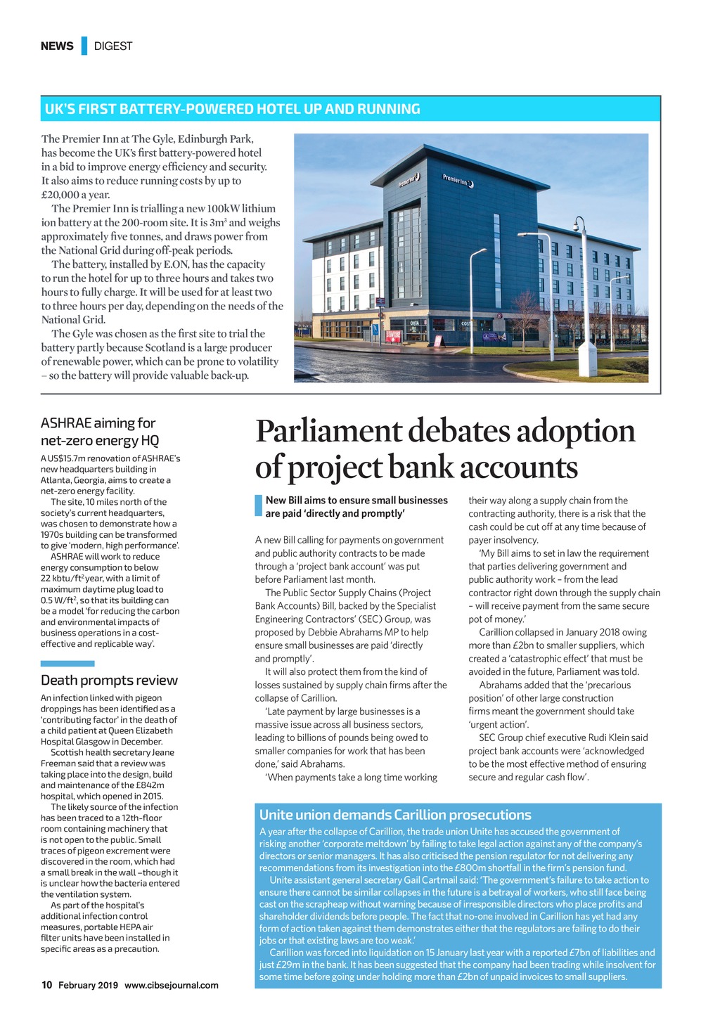 NEWS | DIGEST UKS FIRST BATTERY-POWERED HOTEL UP AND RUNNING The Premier Inn at The Gyle, Edinburgh Park, has become the UKs first battery-powered hotel in abid to improve energy efficiency and security. Italsoaims to reduce running costs by up to 20,000a year. The Premier Inn is trialling a new 100kW lithium ion battery at the 200-room site. It is 3m3 and weighs approximately five tonnes, and draws power from the National Grid during off-peak periods. The battery, installed by E.ON, has the capacity to run the hotel for up to three hours and takes two hours to fully charge. It will be used for at least two to three hours per day, depending on the needs of the National Grid. The Gyle was chosen as the first site to trial the battery partly because Scotland is a large producer of renewable power, which can be prone to volatility so the battery will provide valuable back-up. ASHRAE aiming for net-zero energy HQ A US$15.7m renovation of ASHRAEs new headquarters building in Atlanta, Georgia, aims to create a net-zero energy facility. The site, 10 miles north of the societys current headquarters, was chosen to demonstrate how a 1970s building can be transformed to give modern, high performance. ASHRAE will work to reduce energy consumption to below 22kbtu/ft2 year, with a limit of maximum daytime plug load to 0.5 W/ft2, so that its building can be a model for reducing the carbon and environmental impacts of business operations in a costeffective and replicable way. Death prompts review An infection linked with pigeon droppings has been identified as a contributing factor in the death of a child patient at Queen Elizabeth Hospital Glasgow in December. Scottish health secretary Jeane Freeman said that a review was taking place into the design, build and maintenance of the 842m hospital, which opened in 2015. The likely source of the infection has been traced to a 12th-floor room containing machinery that is not open to the public. Small traces of pigeon excrement were discovered in the room, which had a small break in the wall though it is unclear how the bacteria entered the ventilation system. As part of the hospitals additional infection control measures, portable HEPA air filter units have been installed in specific areas as a precaution. 10 February 2019 www.cibsejournal.com CIBSE Feb19 pp10 News.indd 10 Parliament debates adoption of project bank accounts New Bill aims to ensure small businesses are paid directly and promptly A new Bill calling for payments on government and public authority contracts to be made through a project bank account was put before Parliament last month. The Public Sector Supply Chains (Project Bank Accounts) Bill, backed by the Specialist Engineering Contractors (SEC) Group, was proposed by Debbie Abrahams MP to help ensure small businesses are paid directly and promptly. It will also protect them from the kindof losses sustained by supply chain firms after the collapse of Carillion. Late payment by large businesses is a massive issue across all business sectors, leading to billions of pounds being owed to smaller companies for work that has been done, said Abrahams. When payments take a long time working their way along a supply chain from the contracting authority, there is a risk thatthe cashcould be cut off at any time because of payer insolvency. My Bill aims to set in law the requirement that parties delivering government and publicauthority work from the lead contractorright down through the supply chain will receive payment from the same secure potof money. Carillion collapsed in January 2018 owing more than 2bn to smaller suppliers, which created a catastrophic effect that must be avoided in the future, Parliament was told. Abrahams added that the precarious position of other large construction firms meant the government should take urgent action. SEC Group chief executive Rudi Klein said project bank accounts were acknowledged to be the most effective method of ensuring secure and regular cash flow. Unite union demands Carillion prosecutions A year after the collapse of Carillion, the trade union Unite has accused the government of risking another corporate meltdown by failing to take legal action against any of the companys directors or senior managers. It has also criticised the pension regulator for not delivering any recommendations from its investigation into the 800m shortfall in the firms pension fund. Unite assistant general secretary Gail Cartmail said: The governments failure to take action to ensure there cannot be similar collapses in the future is a betrayal of workers, who still face being cast on the scrapheap without warning because of irresponsible directors who place profits and shareholder dividends before people. The fact that no-one involved in Carillion has yet had any form of action taken against them demonstrates either that the regulators are failing to do their jobs or that existing laws are too weak. Carillion was forced into liquidation on 15 January last year with a reported 7bn of liabilities and just 29m in the bank. It has been suggested that the company had been trading while insolvent for some time before going under holding more than 2bn of unpaid invoices to small suppliers. 25/01/2019 16:13