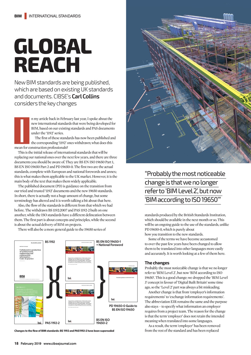 BIM | INTERNATIONAL STANDARDS GLOBAL REACH New BIM standards are being published, which are based on existing UK standards and documents. CIBSEs Carl Collins considers the key changes I n my article back in February last year, I spoke about the new international standards that were being developed for BIM, based on our existing standards and PAS documents under the 1192 series. The first of these standards has now been published and the corresponding 1192 ones withdrawn; what does this mean for construction professionals? This is the initial release of international standards that will be replacing our national ones over the next few years, and there are three documents you should be aware of. They are BS EN ISO 19650 Part 1, BS EN ISO 19650 Part 2 and PD 19650-0. The first two are the actual standards, complete with European and national forewords and annex; this is what makes them applicable to the UK market. However, it is the main body of the text that makes them widely applicable. The published document (PD) is guidance on the transition from our tried and trusted 1192 documents and the new 19650 standards. In short, there is actually not a huge amount of change, but some terminology has altered and it is worth talking a bit about that here. Also, the flow of the standards is different from that which we had before. The withdrawn BS 1192:2007 and PAS 1192-2 built on one another, while the ISO standards have a different delineation between them. The first part is about concepts and principles, while the second is about the actual delivery of BIM on projects. There will also be a more general guide to the 19650 series of BS 1192 BS EN ISO 19650-1 + National Foreword Probably the most noticeable change is that we no longer refer to BIM Level 2, but now BIM according to ISO 19650 standards produced by the British Standards Institution, which should be available in the next month or so. This will be an ongoing guide to the use of the standards, unlike PD 19650-0, which is purely about how you transition to the new standards. Some of the terms we have become accustomed to over the past few years have been changed to allow them to be translated into other languages more easily and accurately. It is worth looking at a few of them here. The changes PD 19650-0 Guide to BS EN ISO 19650 PAS 1192-2 BS EN ISO 19650-2 Changes to the flow of BIM standards: BS 1192 and PAS1192-2 have been superseded Probably the most noticeable change is that we no longer refer to BIM Level 2, but now BIM according to ISO 19650. This is a good change; we dropped the BIM Level 3 concept in favour of Digital Built Britain some time ago, so the Level 2 part was always a bit misleading. Another change is that from employers information requirements to exchange information requirements. The abbreviation EIR remains the same and the purpose also stays to specify what information an employer requires from a project team. The reason for the change is that the term employer does not retain the intended meaning when translated into some languages. As a result, the term employer has been removed from the rest of the standard and has been replaced 18 February 2019 www.cibsejournal.com CIBSE Feb19 pp18-19 BIM JR.indd 18 25/01/2019 18:23