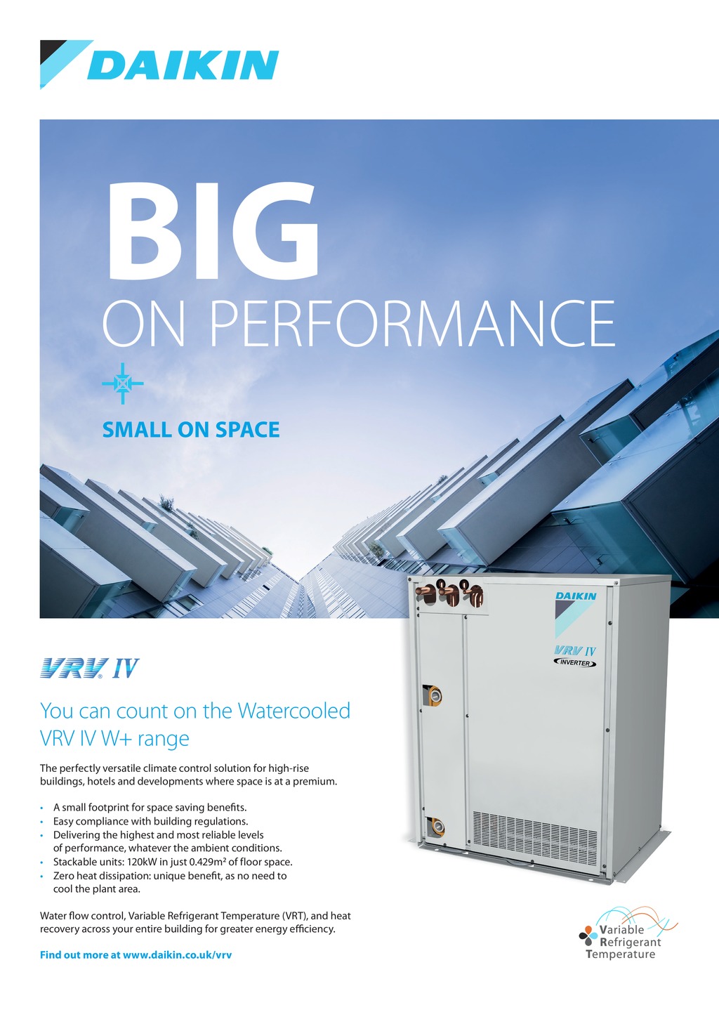 BIG ON PERFORMANCE SMALL ON SPACE You can count on the Watercooled VRV IV W+ range The perfectly versatile climate control solution for high-rise buildings, hotels and developments where space is at a premium. A small footprint for space saving benets. Easy compliance with building regulations. Delivering the highest and most reliable levels of performance, whatever the ambient conditions. Stackable units: 120kW in just 0.429m of floor space. Zero heat dissipation: unique benet, as no need to cool the plant area. Water ow control, Variable Refrigerant Temperature (VRT), and heat recovery across your entire building for greater energy eciency. Find out more at www.daikin.co.uk/vrv 20 February 2019 www.cibsejournal.com p20_CIBSEMagFeb19.indd 20 22/01/2019 11:30